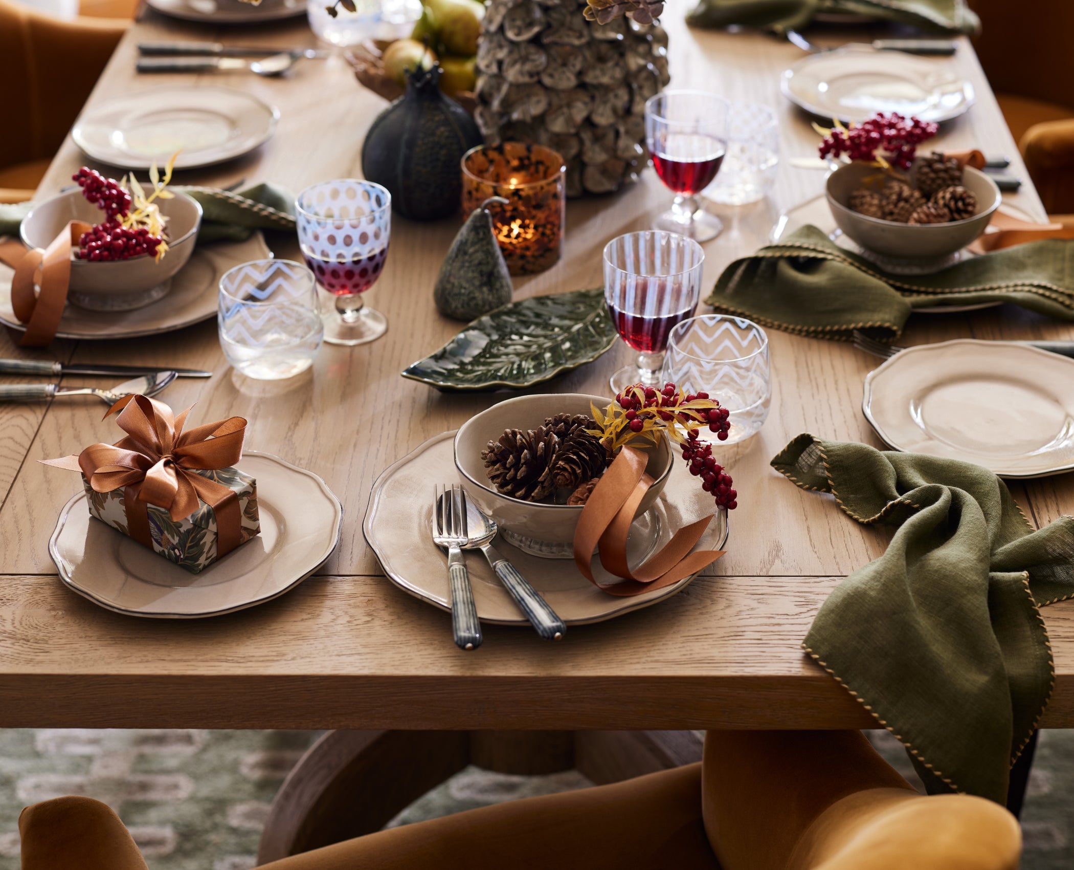 Go big and bold with colours you already have in your home. After all, at OKA we advocate for timeless design and reusing decorations for Christmas and beyond, year on year. As previously mentioned, there’s something to be said for balancing out the elevated with the everyday, but what about elevating the everyday itself? If your room is filled with accents of purple, think colour drenching and allow yourself to go whimsical and wild with even more of the damson shade: hang streamers and paper decorations in aubergine, arrange faux sprigs of mauve cosmos, set violet-hued taper candles in artichoke candle holders… This is your chance to be inventive and unique and this can be done with whatever the colour palette of your interiors. Packing in the décor will ensure that your rooms look embellished from the norm.