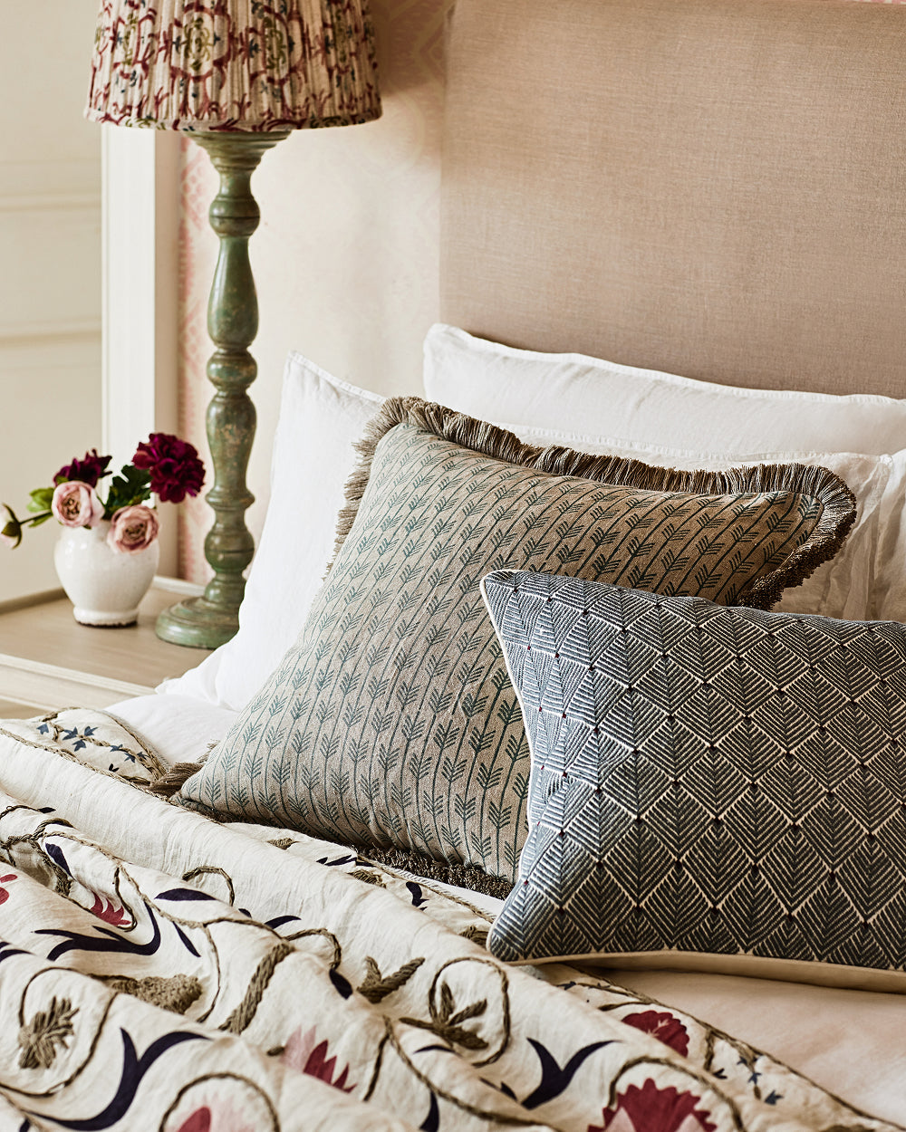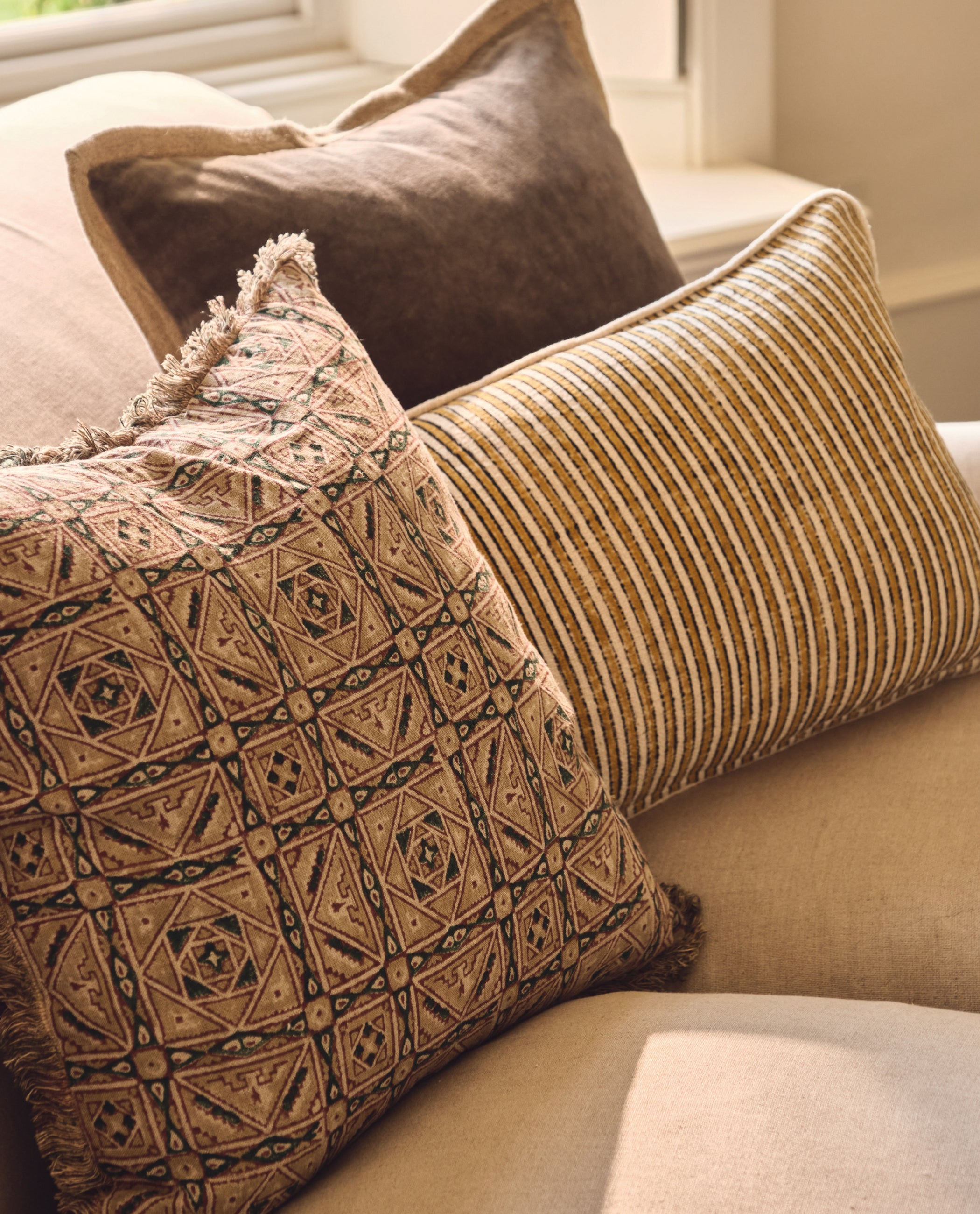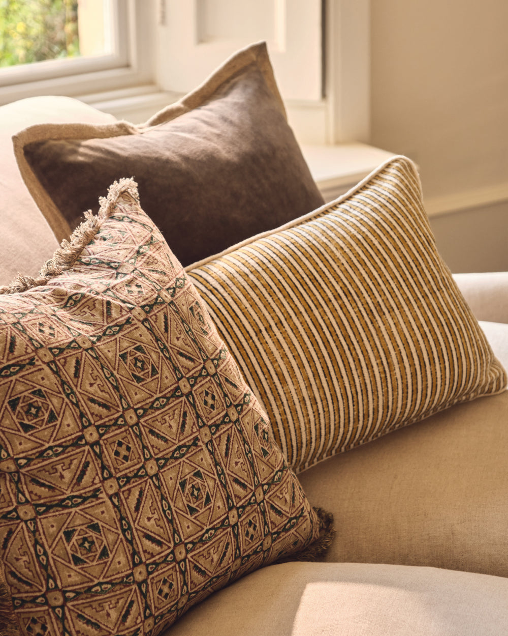 “Cushions aren’t there to dictate a room; they’re there to enhance it,” says Sarina Hawkins, one of OKA’s expert Interior Designers. With this in mind, your choice of cushions should be inspired by what’s already in the room – whether that be a particular colour scheme, a striking pattern or similar textures. The trick is to do it subtly, so your arrangement casually complements a scheme (rather than appearing as if every detail has been scrupulously matched); reflect the pop of a cobalt blue lampshade in the embroidery of a scatter cushion, for example, or the plush velvet of a pair of curtains in a bolster cushion.