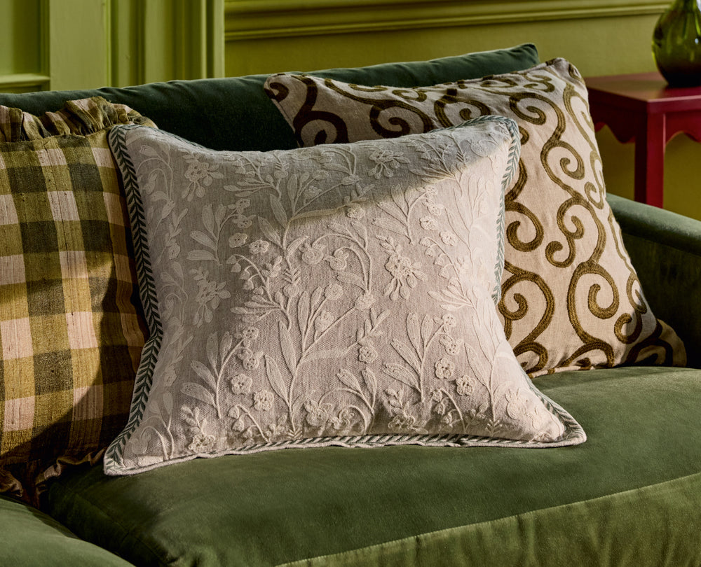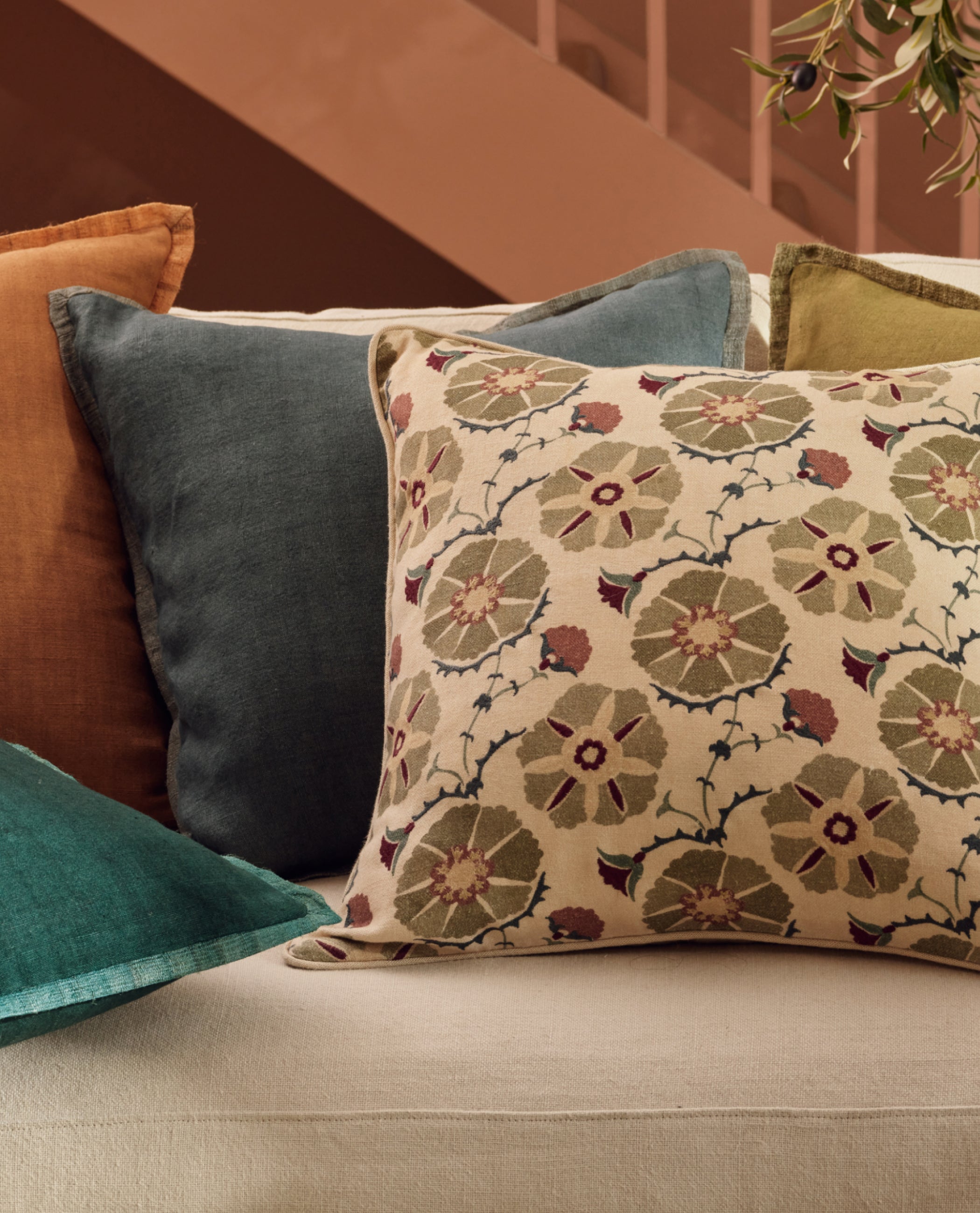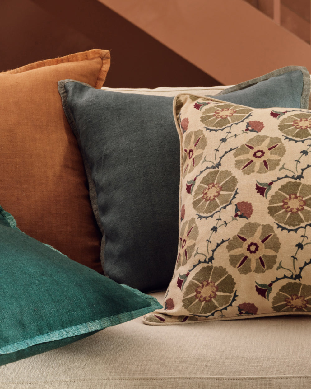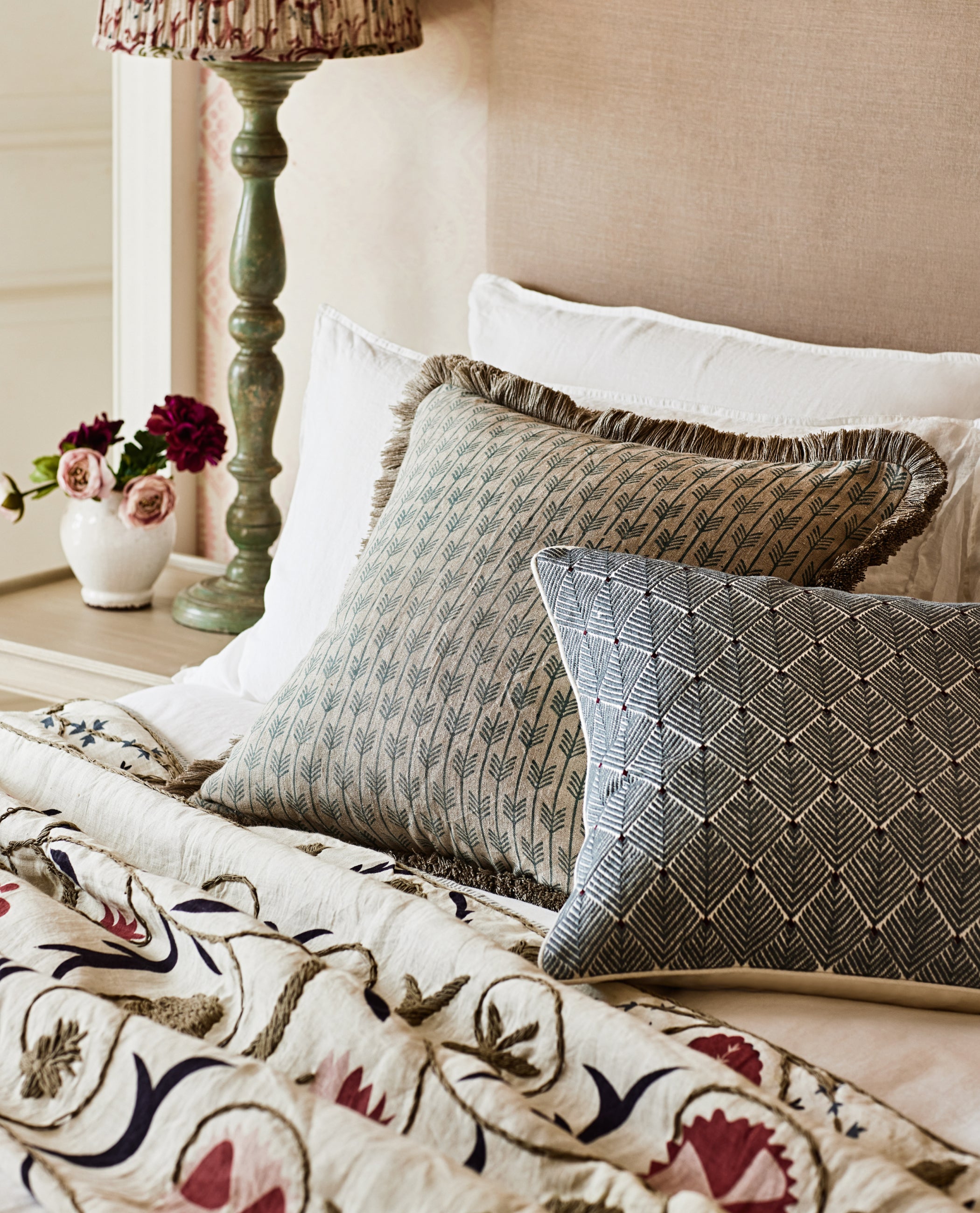 “Cushions aren’t there to dictate a room; they’re there to enhance it,” says Sarina Hawkins, one of OKA’s expert Interior Designers. With this in mind, your choice of cushions should be inspired by what’s already in the room – whether that be a particular colour scheme, a striking pattern or similar textures. The trick is to do it subtly, so your arrangement casually complements a scheme (rather than appearing as if every detail has been scrupulously matched); reflect the pop of a cobalt blue lampshade in the embroidery of a scatter cushion, for example, or the plush velvet of a pair of curtains in a bolster cushion.