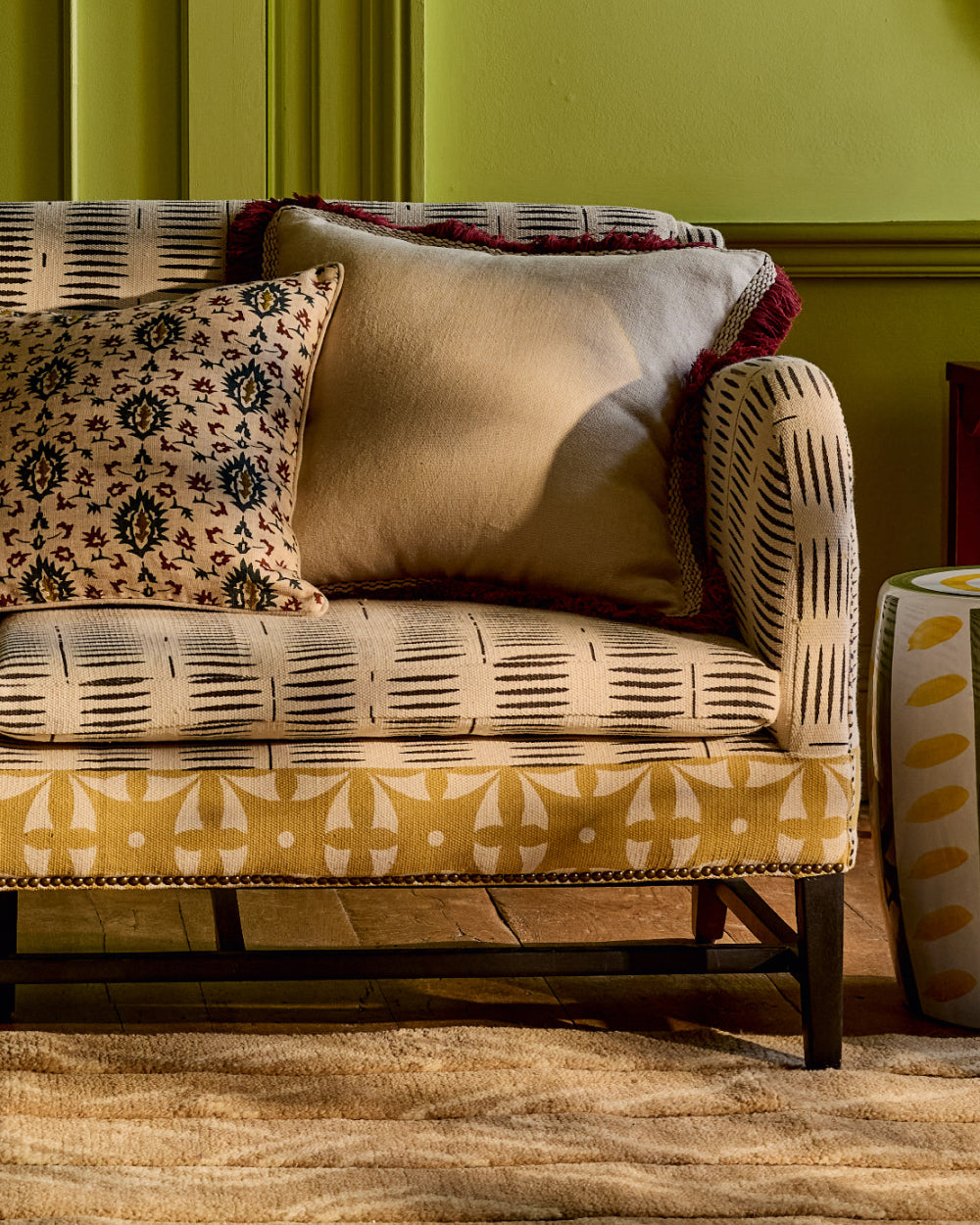 Unless you’re decorating a particularly formal room, you’ll want your arrangement to feel effortless – even if you have, in fact, put a lot of effort into it. Achieve this by sticking with odd – rather than even – numbers. Groups of three or five cushions are more visually pleasing, and feel considerably more relaxed. “Some cushion arrangements don’t invite you to sit,” Roig says. “I’ve stayed away from symmetry for the past couple of years, because it creates a very serious style. Those sorts of settings are for the formal sitting room, which you might only use once a year.”