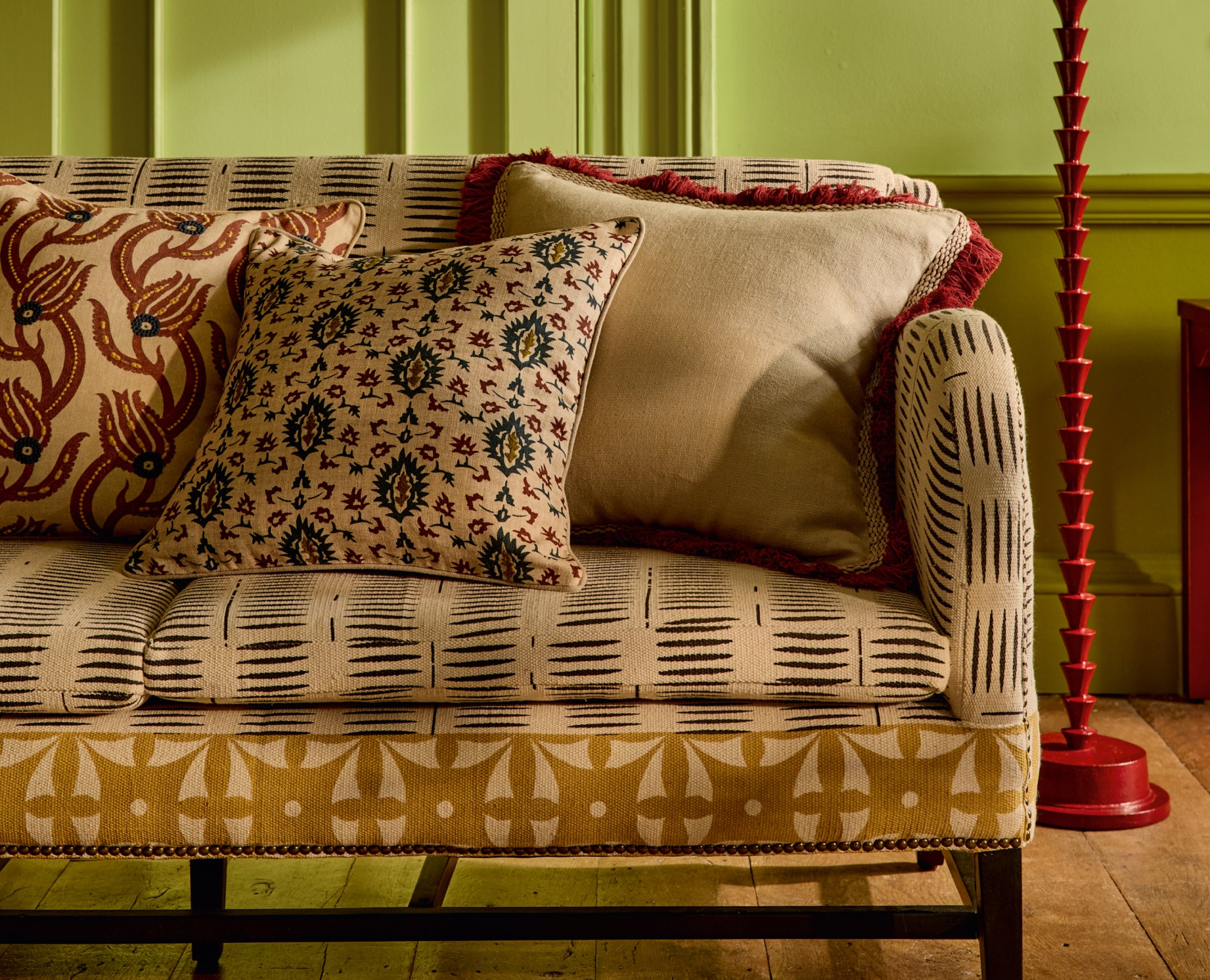 For those who shy away from daring prints, use a mix of textures to bring depth and character to a more muted arrangement. Don’t be afraid to team thicker fabrics, such as a faux fur or velvet, with lighter-weight cottons and linens – the contrast will create a warm, tactile effect that works throughout the seasons. “People sometimes have issues with velvet or other heavier materials,” says Roig, “but if you remove these fears you can have fun with textures, such as pairing a velvet with a fur.” You don’t have to focus solely on a cushion’s base material to create a tactile design either – tassels, embroidery, fringing and textured appliqué are alternative (and simple) ways to add interest to an arrangement.