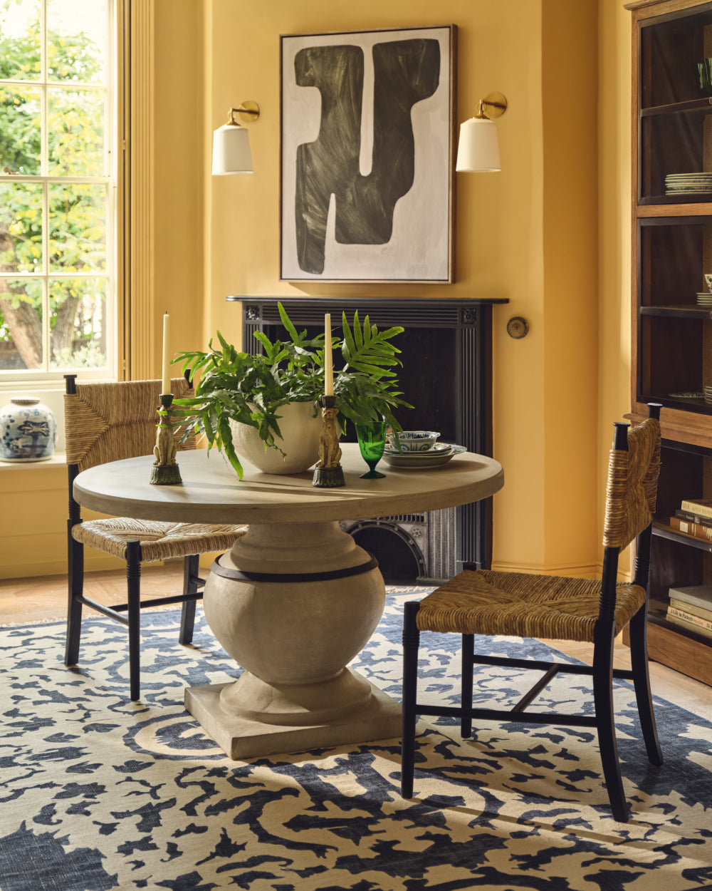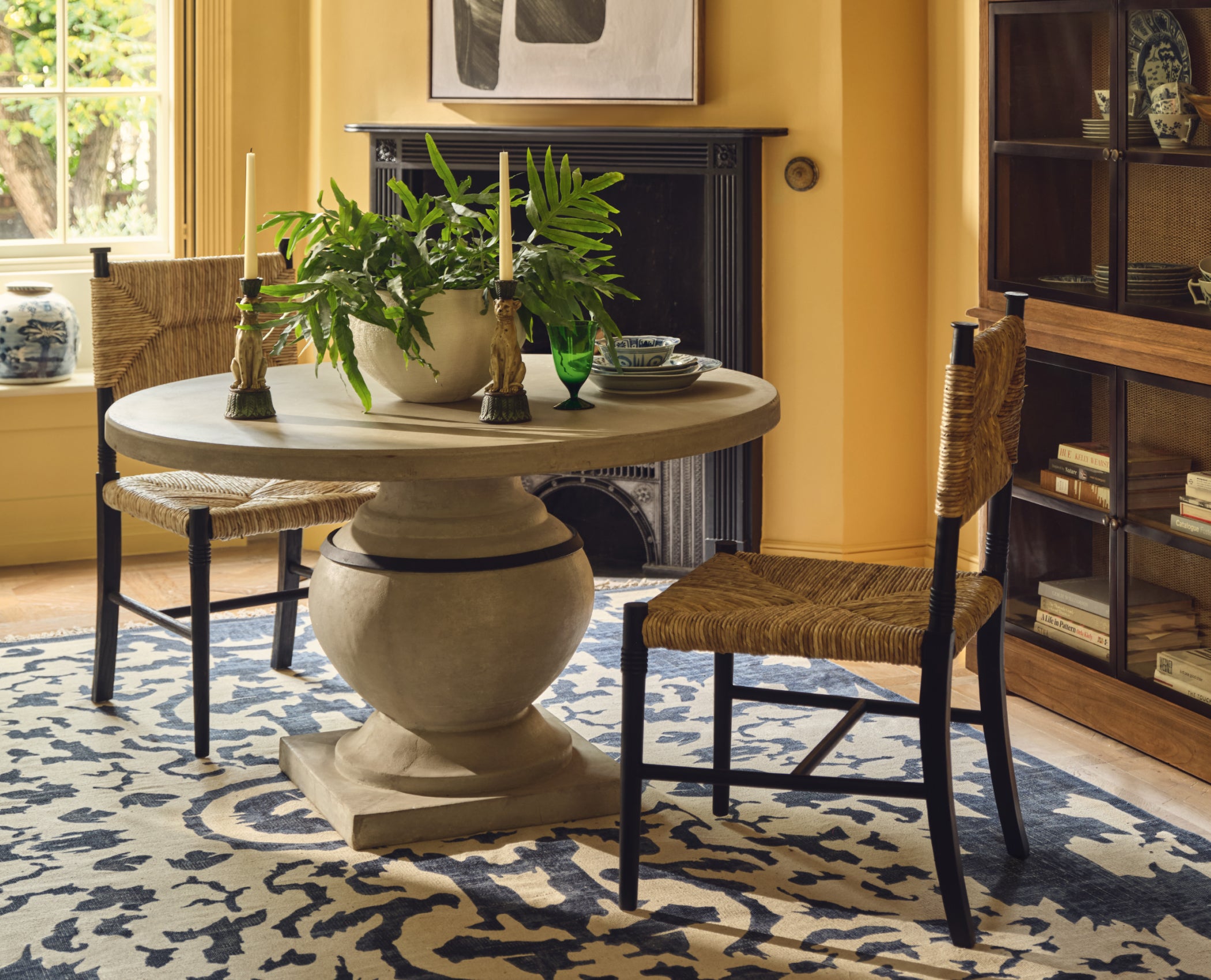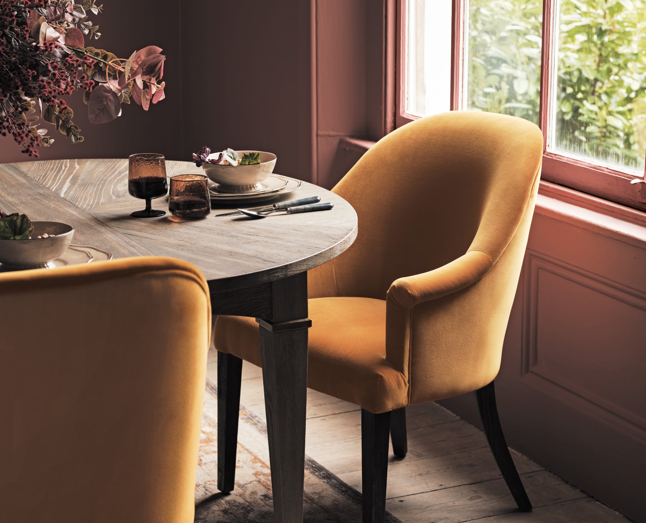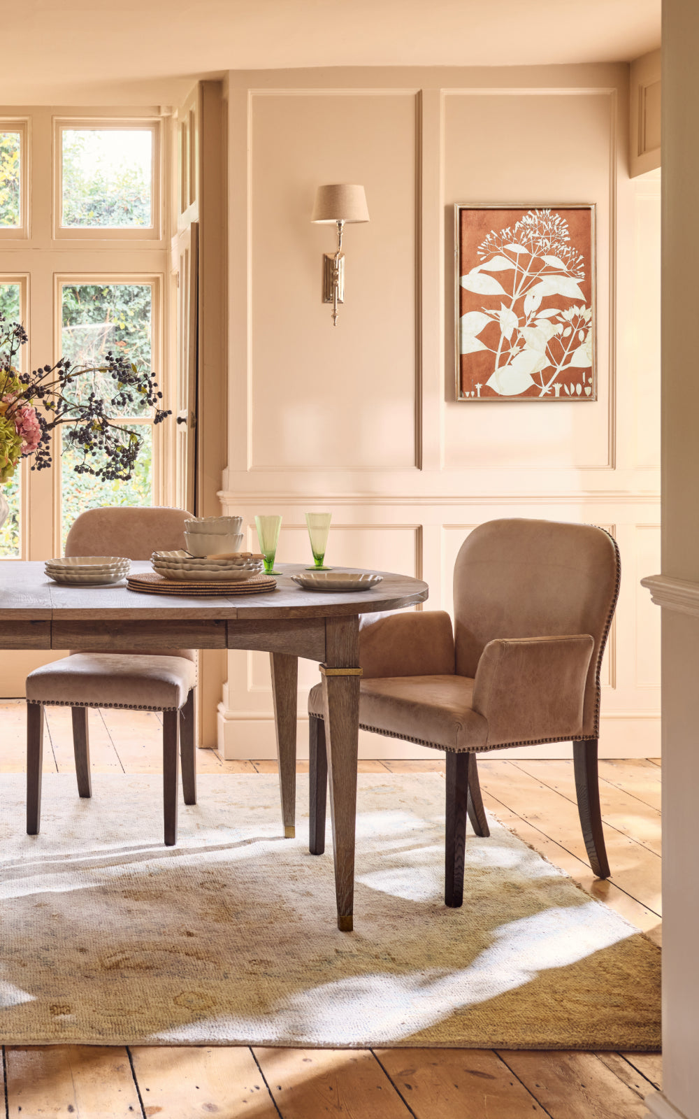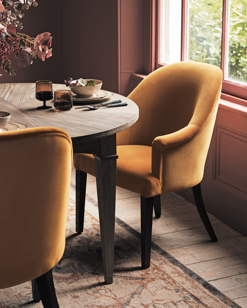 Don’t forget to think about the shape of the chair, too; while armless chairs boast neatness, in that they can be tucked flush against a table’s edge, chairs with arms offer all-day comfort and, when not in use at mealtimes, can double-up as a more formal reading chair. As a general rule, chairs with arms require an additional 15cm in each direction, so do your maths – if there’s limited space, opt out.