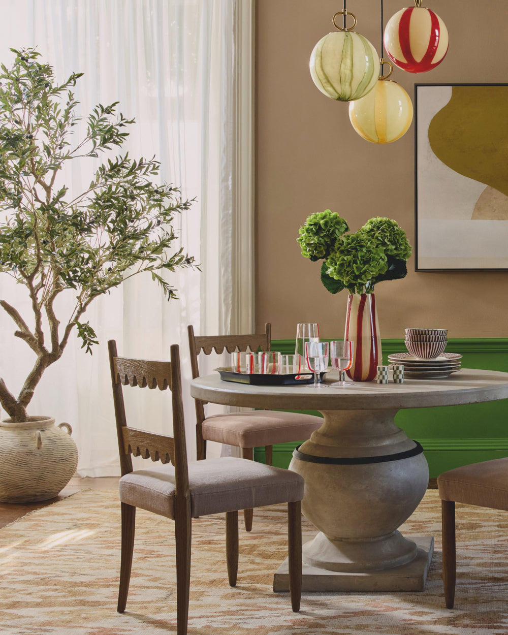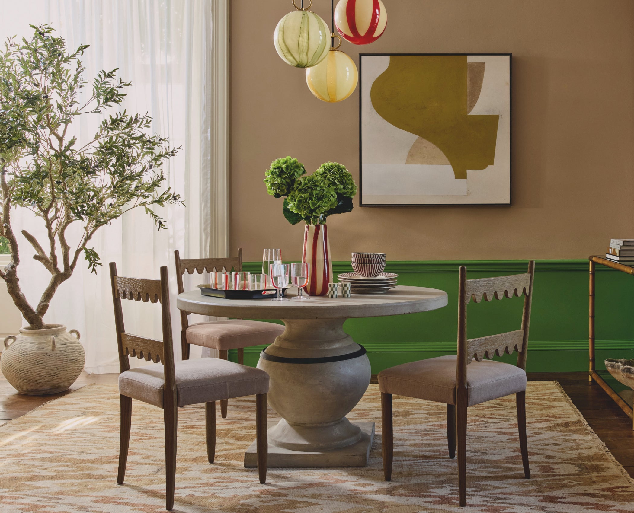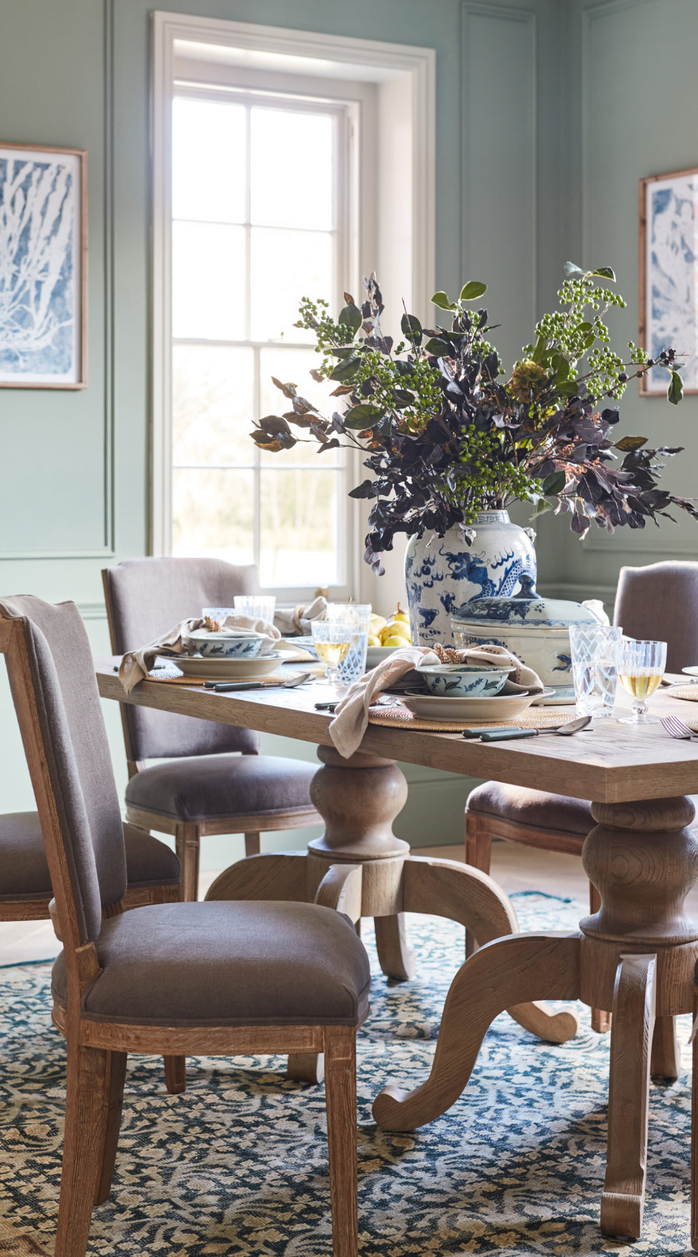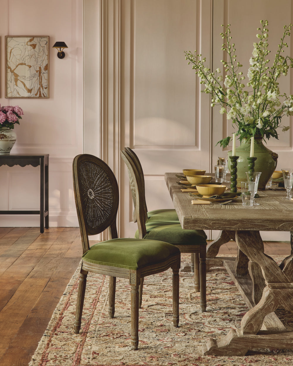 If you have small children or four-legged friends running around, the last thing you want is to be precious about a seating situation. In this case, a kitchen table set-up with non-upholstered chairs is a wise choice. But remember that leather can also be forgiving – it doesn’t harbour fluff or fur, can be wiped down and acquires character as it ages. Velvet is unapologetically opulent and more fragile, and best suited to a grown-up setting where dining (rather than arts and crafts) is on the menu. Linen boasts a tactile neutrality – one that offsets a dark-wood table beautifully – but unless the seat covers are removable, you may want to employ chairs with this upholstery exclusively in a dedicated dining room.
