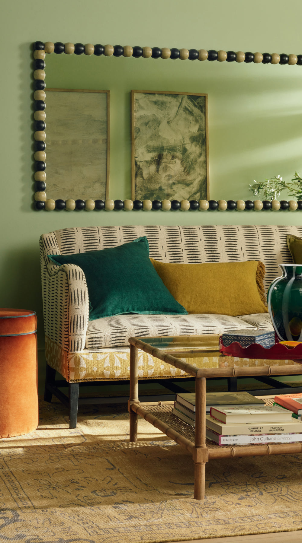 In terms of size, it’s worth measuring the place you want to hang, stand or prop your mirror, as there’s a general rule that your mirror should be about two-thirds of the width of whatever it hangs above (say, a console table). If the mirror is meant to be functional rather than simply aesthetic, then it should be hung so that the centre of the mirror is in your eye-line – what’s the point of a mirror if you can’t see into it? You don’t want to be standing on tip-toe or crouching to have a look. Aside from that, the height comes down to what feels right for you; if you can get a helpful person (or two) to hold it in place while you admire it from afar, you can make an informed decision.