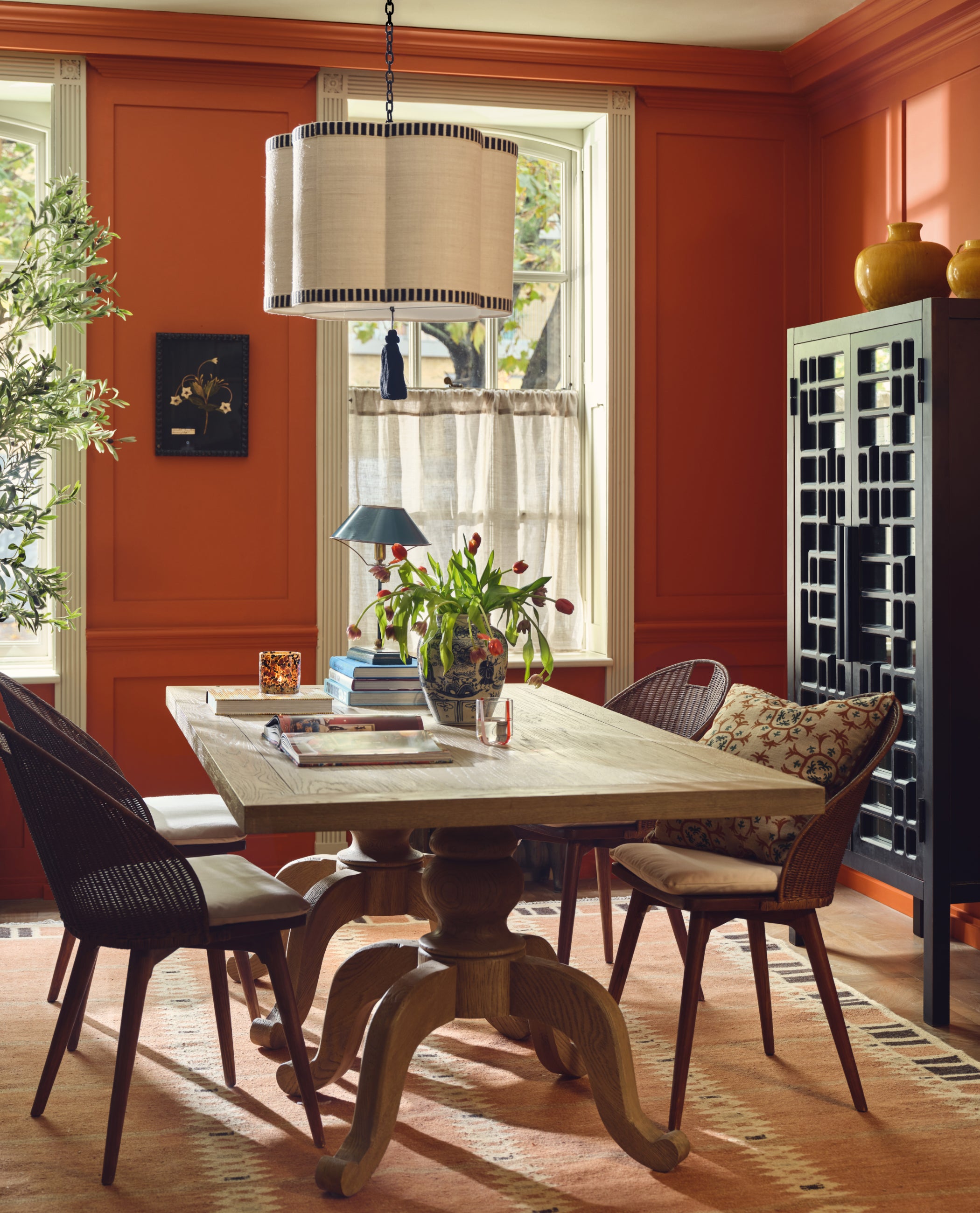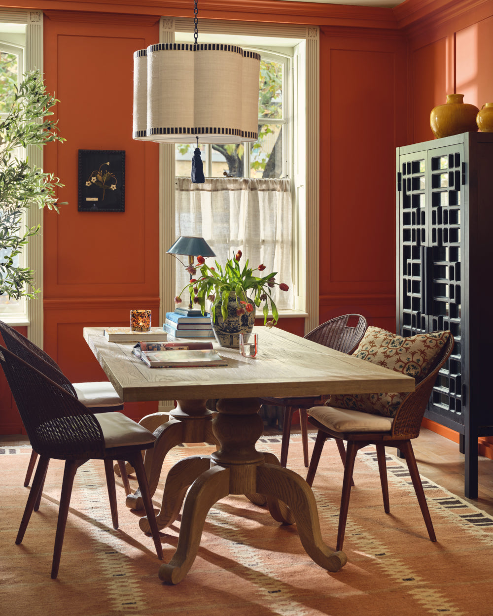 In small dining rooms, when not in use, a rectangular table can also be pushed up against the wall. If this is the case, and you’re really tight on space, opt for long dining benches rather than dining chairs, because as well as being able to squeeze an extra person around the table, they can also be neatly tucked underneath it. Speaking of benches, pairing a rectangular table with this type of seating doesn’t necessarily mean you lose out on formality; you can choose an upholstered bench with a comfortable seat and ornately carved legs for a formal setting. That being said, a plain wooden bench offers more relaxed, country-inspired dining (you can add cushions for extra comfort if required).