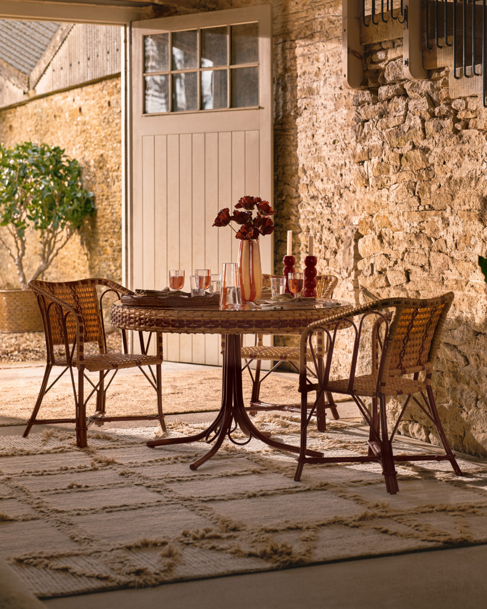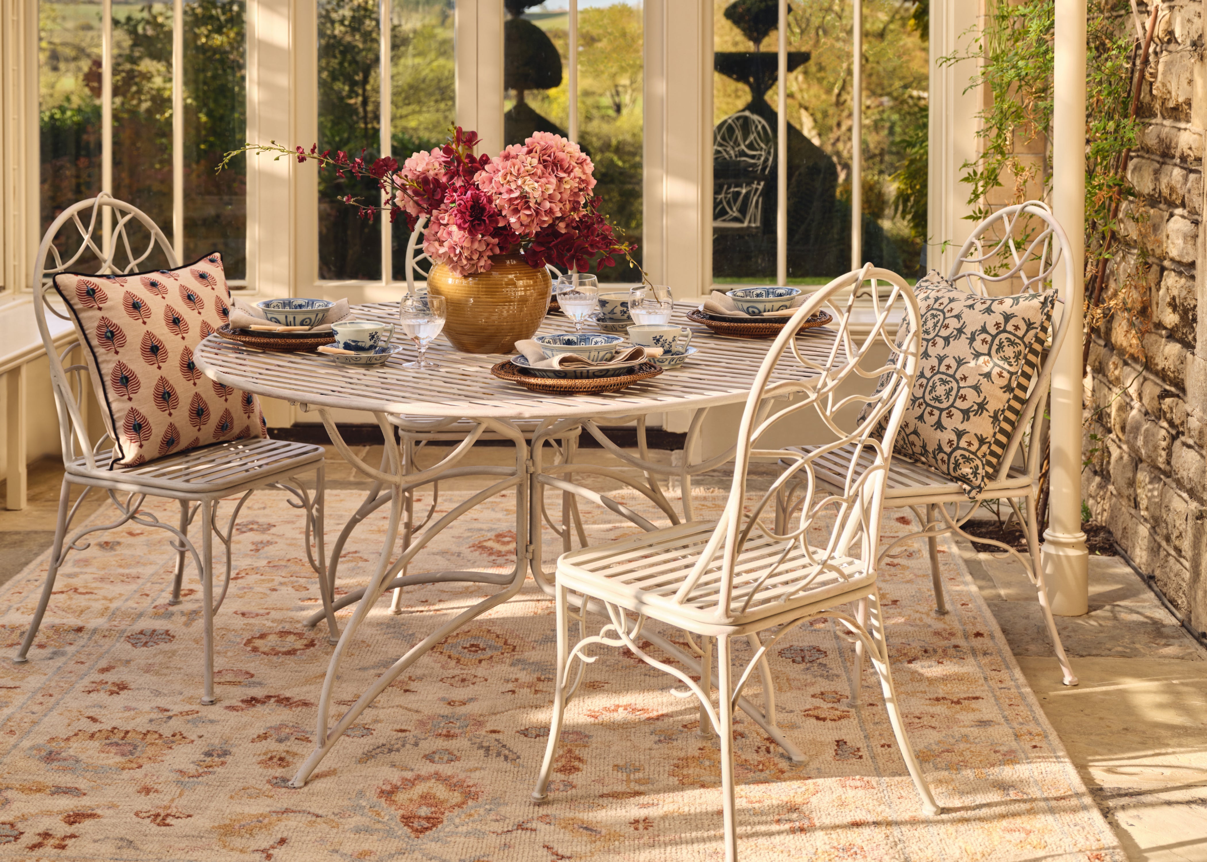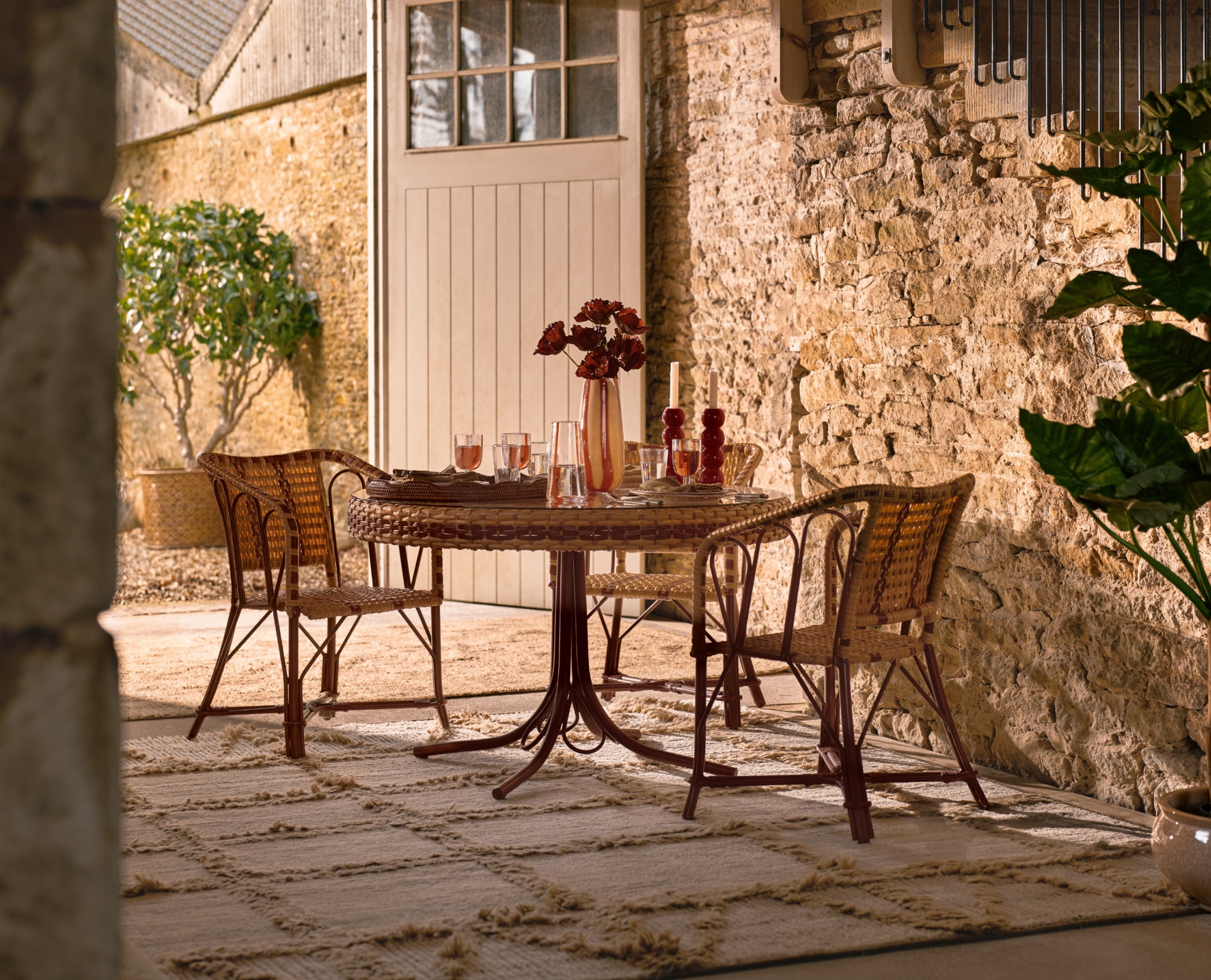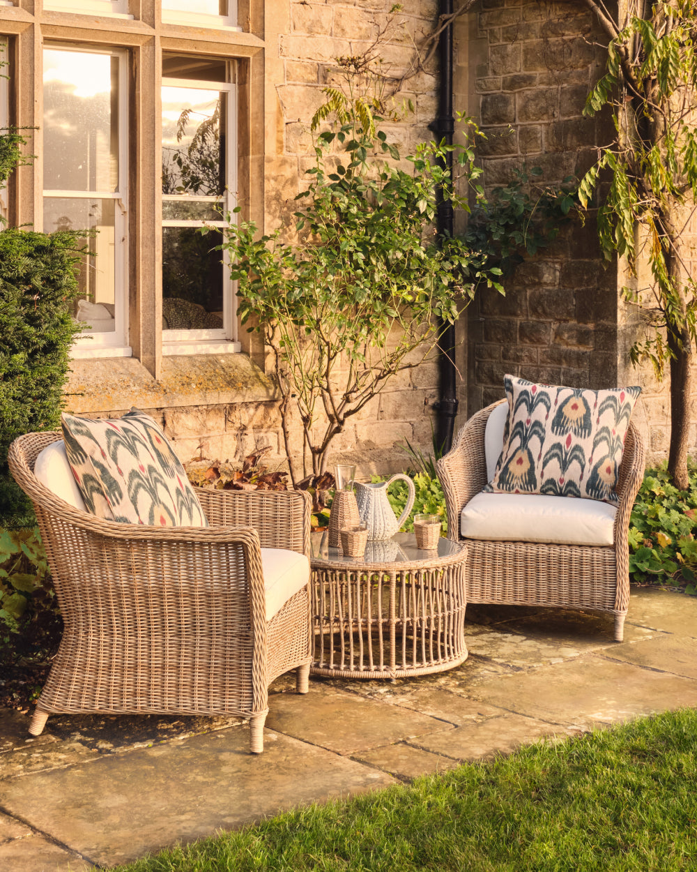 When it comes to small garden patio ideas, seeking furniture pieces that can provide more than one function will save you valuable patio room when your square footage is minimal. An upholstered ottoman, for example, can provide a space on which to sit, rest your feet or place a tray of drinks, while a ceramic stool can be both a side table and a seat. If you only have room for a dining table, why not opt for dining chairs that you can also lounge in? A design with arms and upholstered seats, for example, will be suitable for both sunbathing and al fresco feasting. You could even look to inside spaces for inspiration; our range of indoor/outdoor dining tables bridges the gap between the interior and the exterior, allowing you to move your dinners outdoors on warmer days, and back inside when the weather cools down.