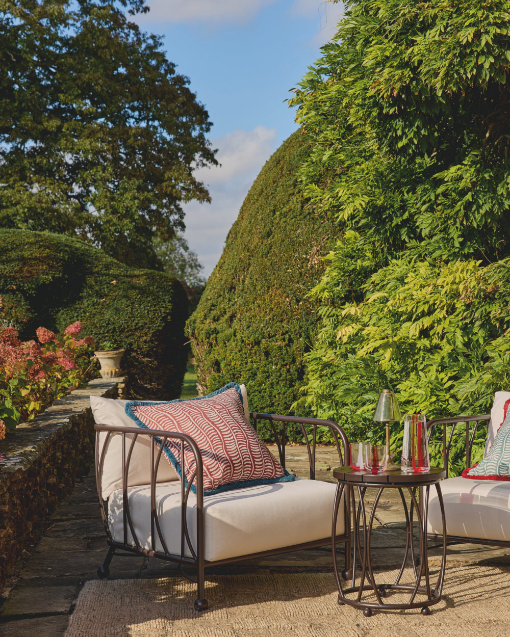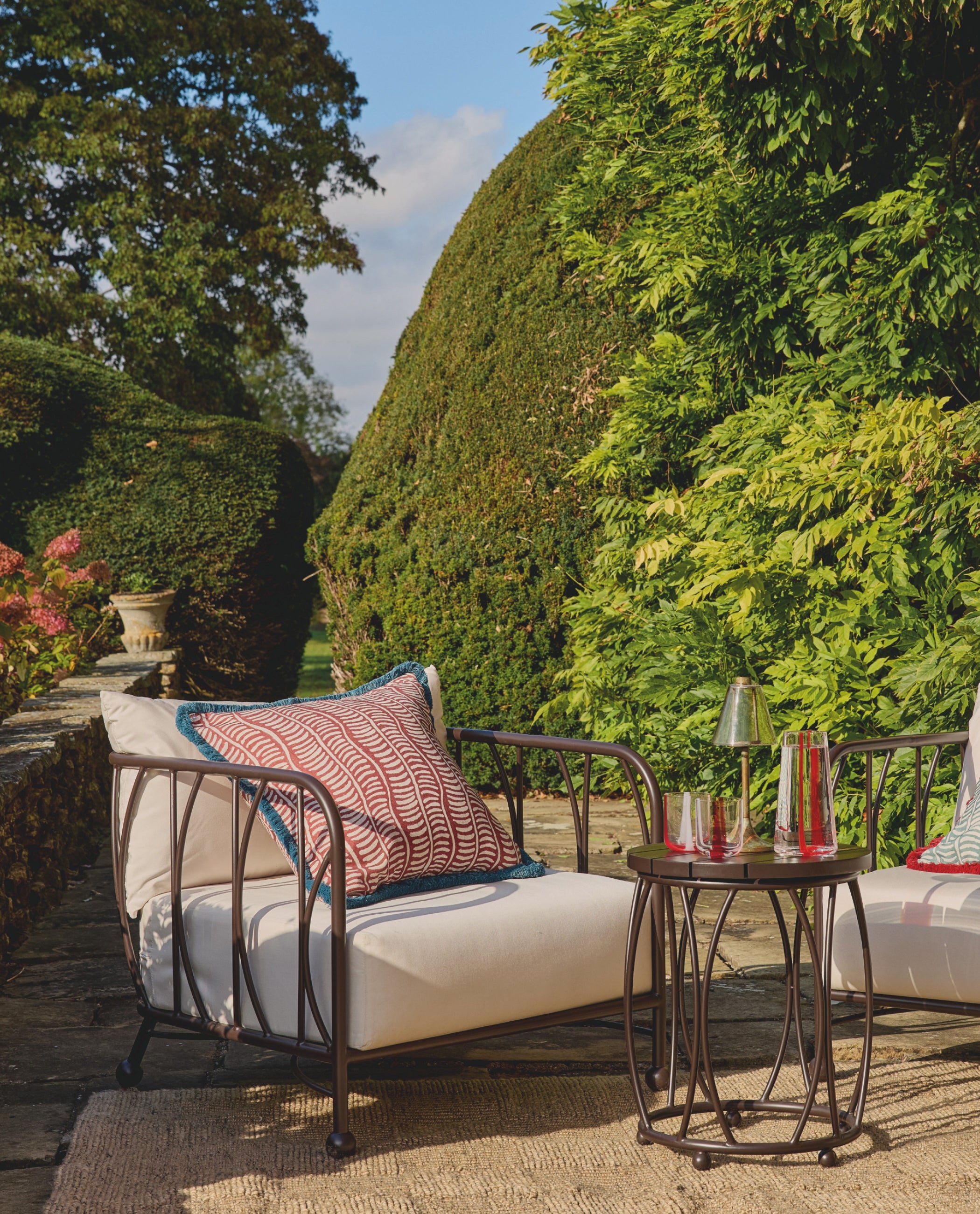 If you have a little more room to play with, zoning your patio or terrace can really help to maximise on space. For example, designating one area of the patio to dining and another to lounging will give the impression of multiple ‘rooms’, which you can move between depending on the time of day or activity. Indoor/outdoor rugs can again help in this instance, creating a central point for each area. Alternatively, grouping your lounge furniture in a circle, with the largest piece turned away from your dining table, will make the spaces feel separate. You could also place decorative pots, planters or hurricane lamps between the two, to produce a physical line that separates them from one another.