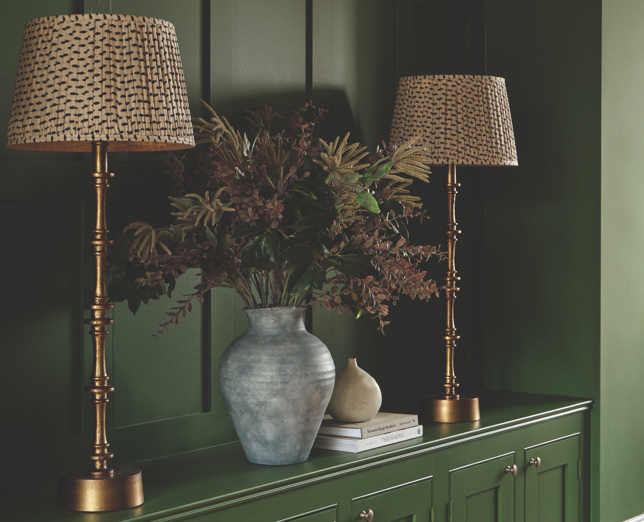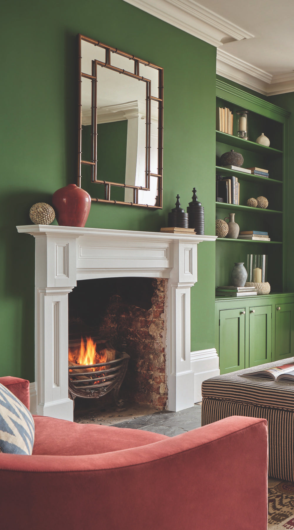 With the couple’s support, Charlotte brought an eclectic palette of bold colors and patterns to the space. She started by selecting Hopper by Little Greene for the walls and cabinetry, adding brass handles to the cupboards for a warming touch.
