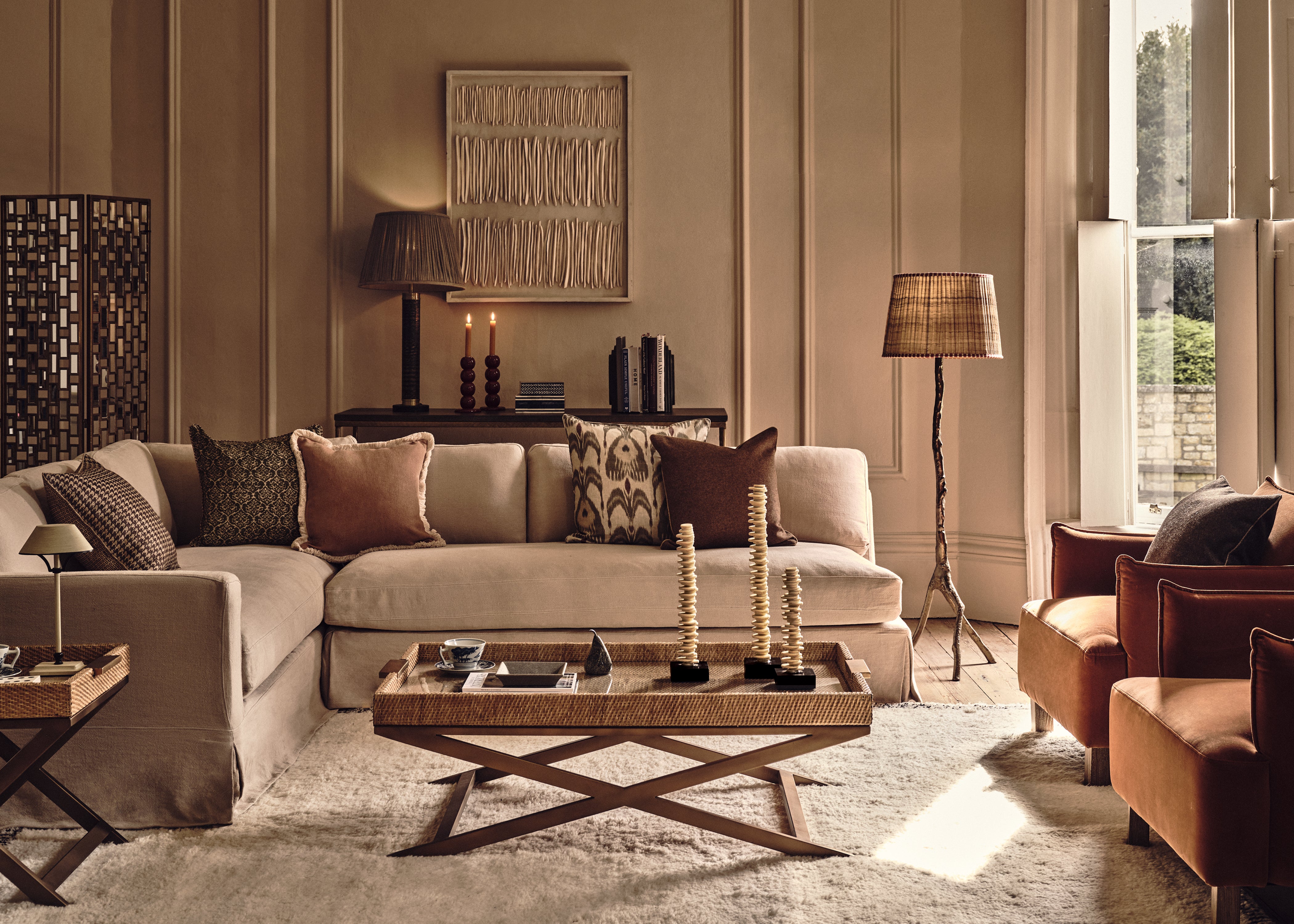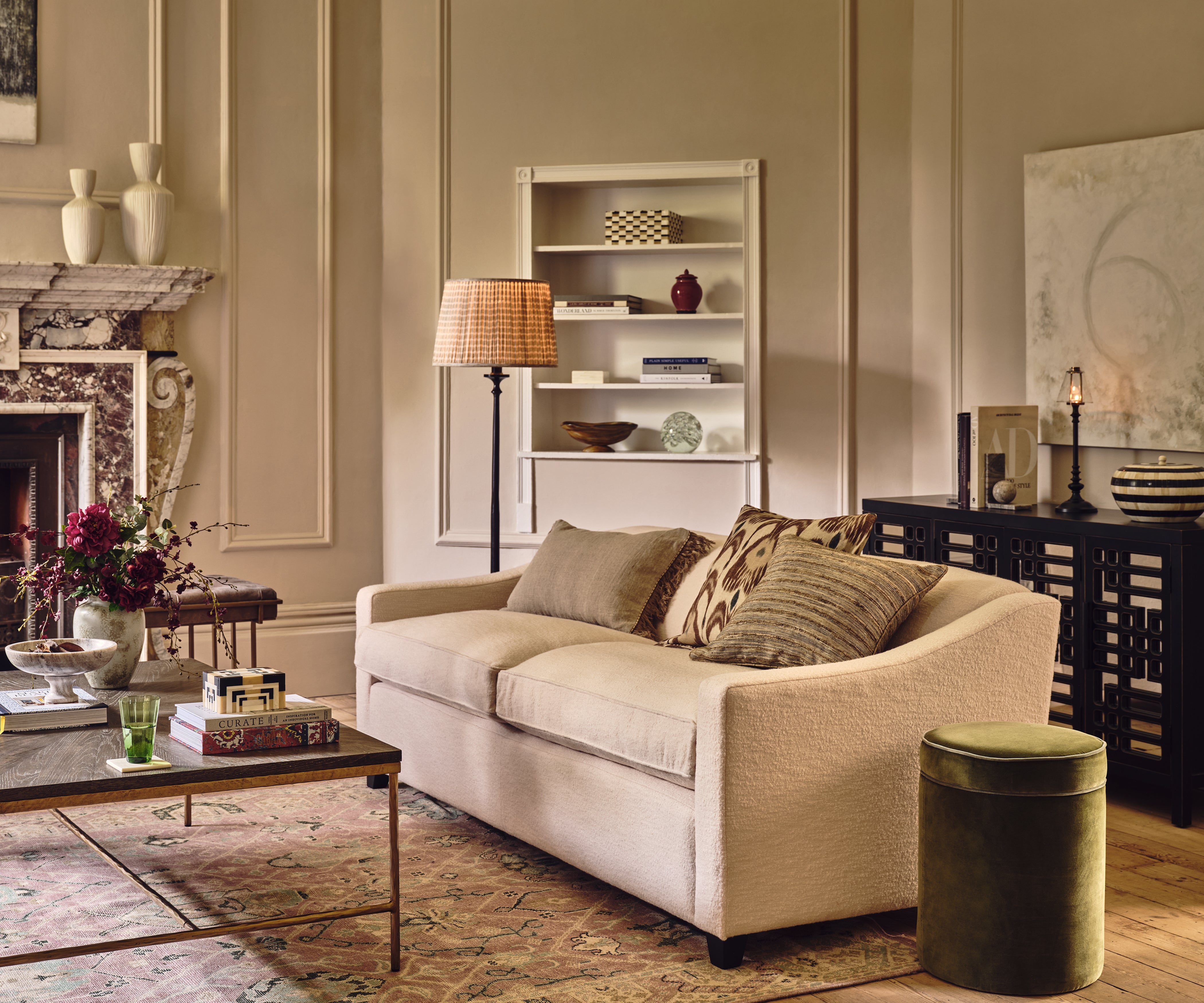 Though with furniture we advise to go big and minimal, that doesn’t mean you should hold back from placing decorative finishing touches on surfaces for added interest. If you prefer to refrain from cluttering your coffee table, use shelving to display books and ornaments. Many of the ornaments here are crafted from natural materials in bone, stone and rattan which brings an extra level of sophistication. These pieces can be equally practical if you opt for pretty storage boxes that can hide away odds and ends. To adhere to the present season, swap in floral bouquets, perhaps some burgundy eucalyptus stems for the autumn, or tea roses for spring. If you go faux, then that’s one less thing to think about every time the new year rolls around. Layer soft furnishings too for added texture: rugs instantly warm and soften hard floors, while throws make your sofa that bit more inviting.