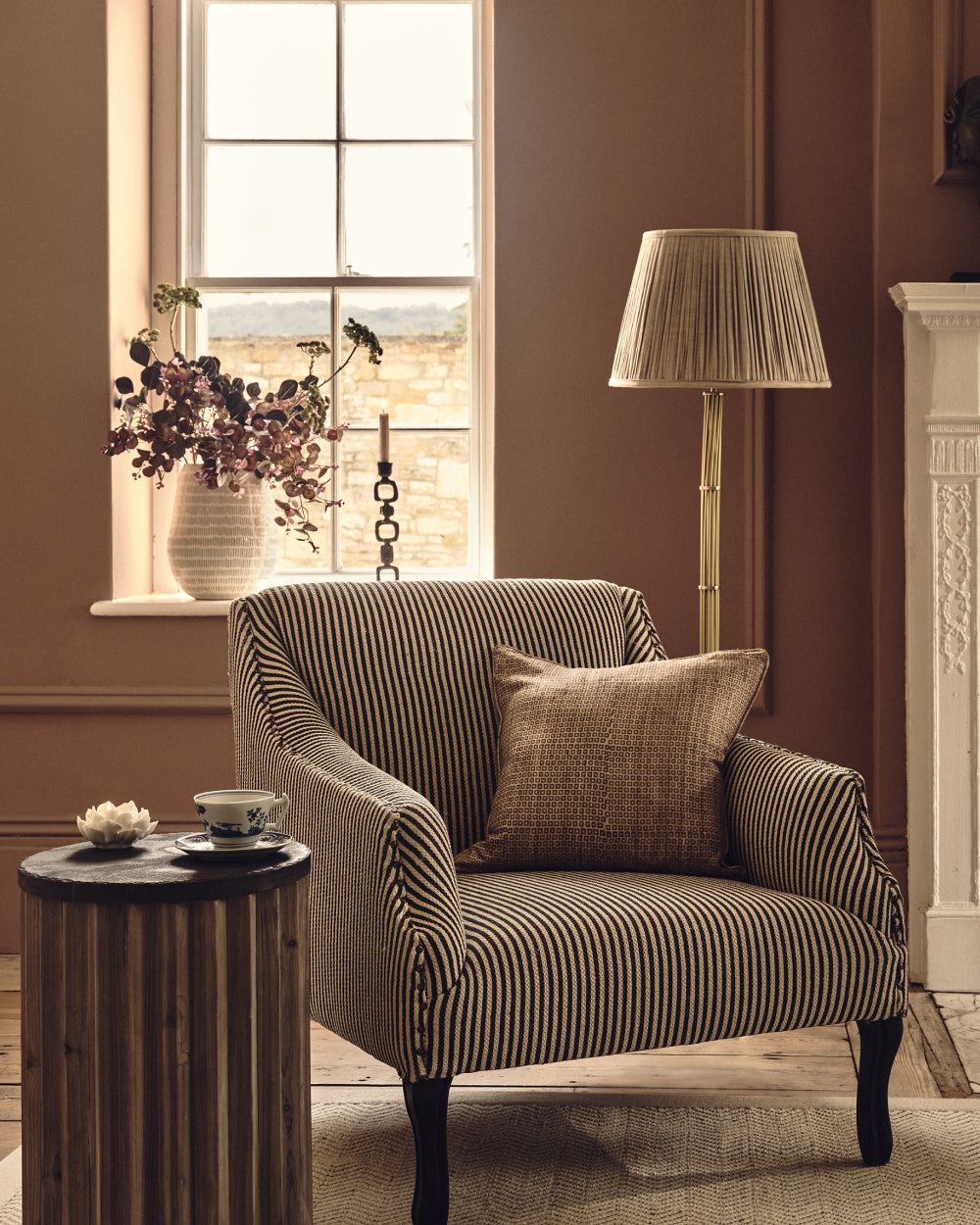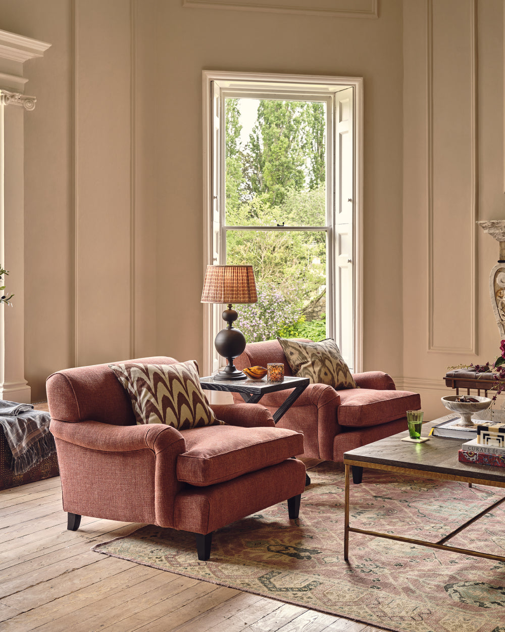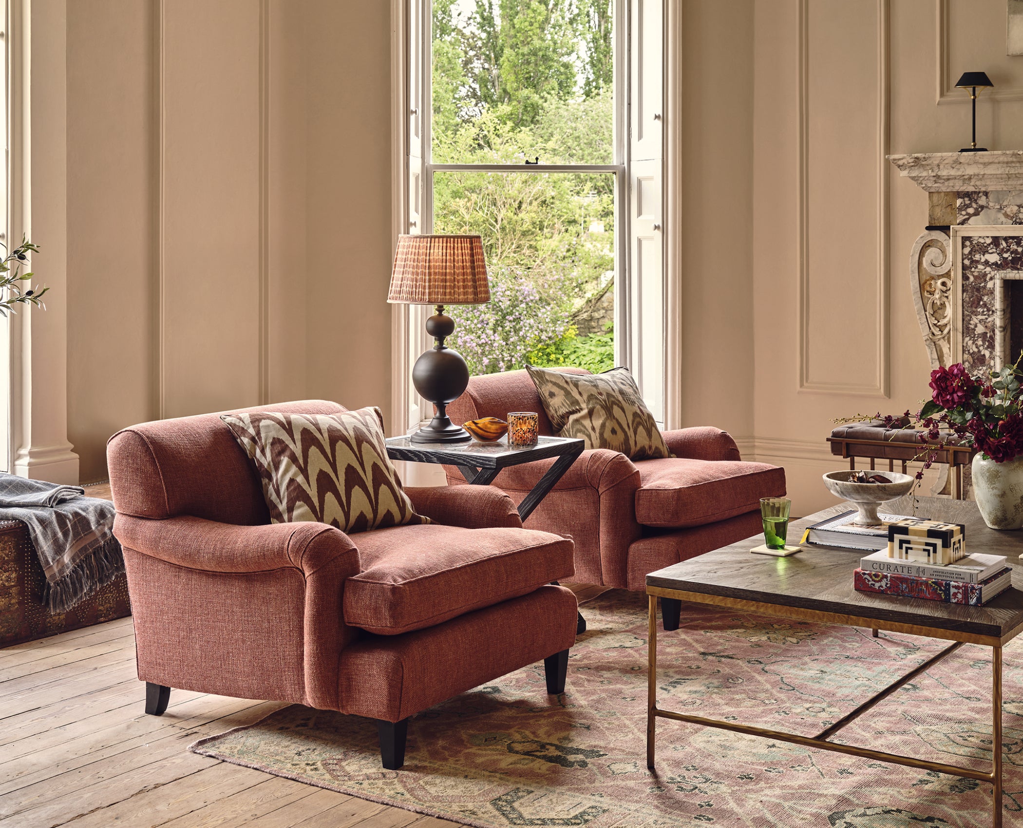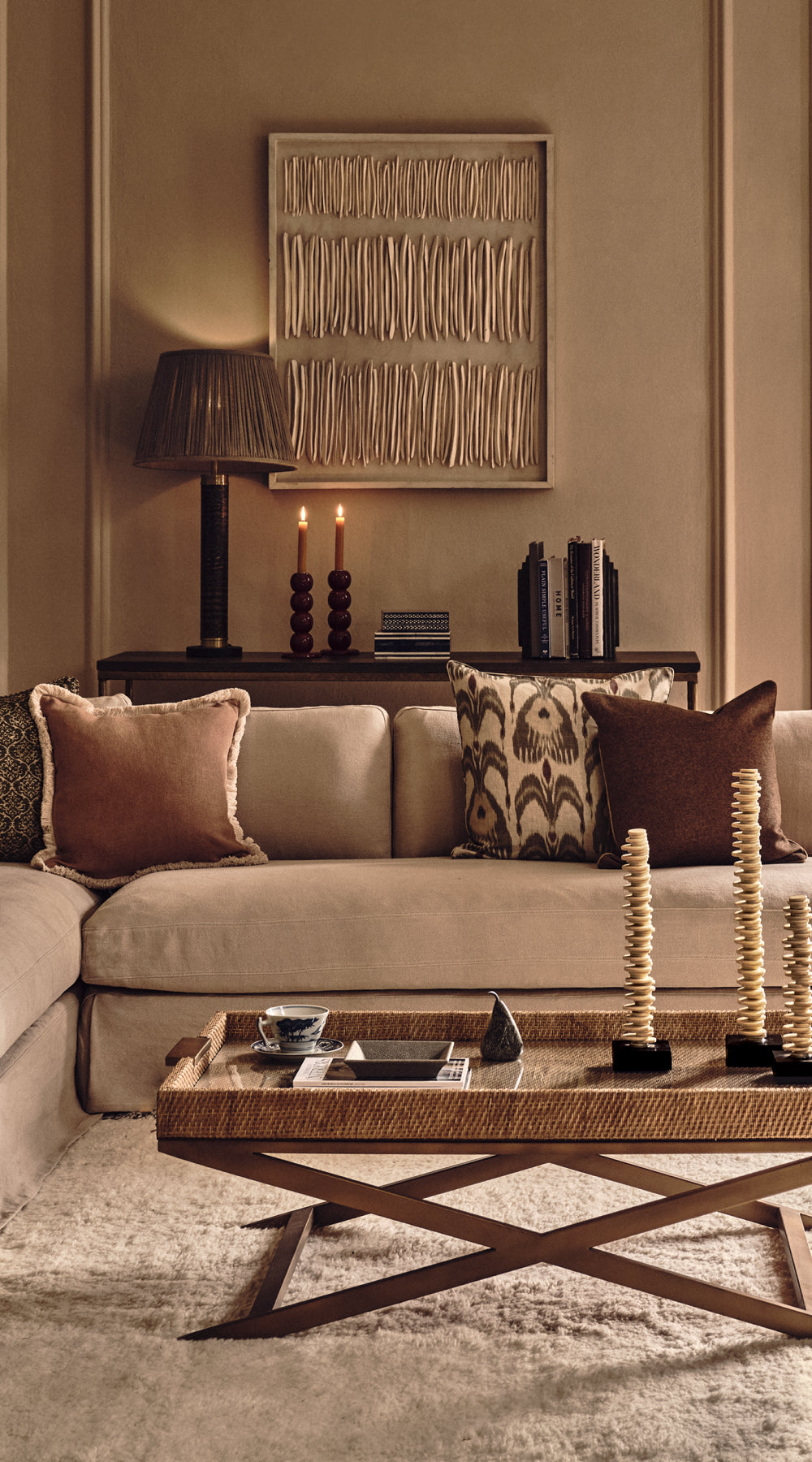 Matching colours gives you the freedom to mismatch patterns, as the colour is your uniformity and the pattern is your feature of interest – take the cushions in this look as an example. Their patterns differ, yet they have been paired for their similar ikat design styles and the Tabac colourway. This technique of contrasting prints shows a more considered approach to your choices as there is a clearer thought process behind each piece. In terms of materials, think warm textures such as wool, which will also bring a sense of timelessness to your scheme.
