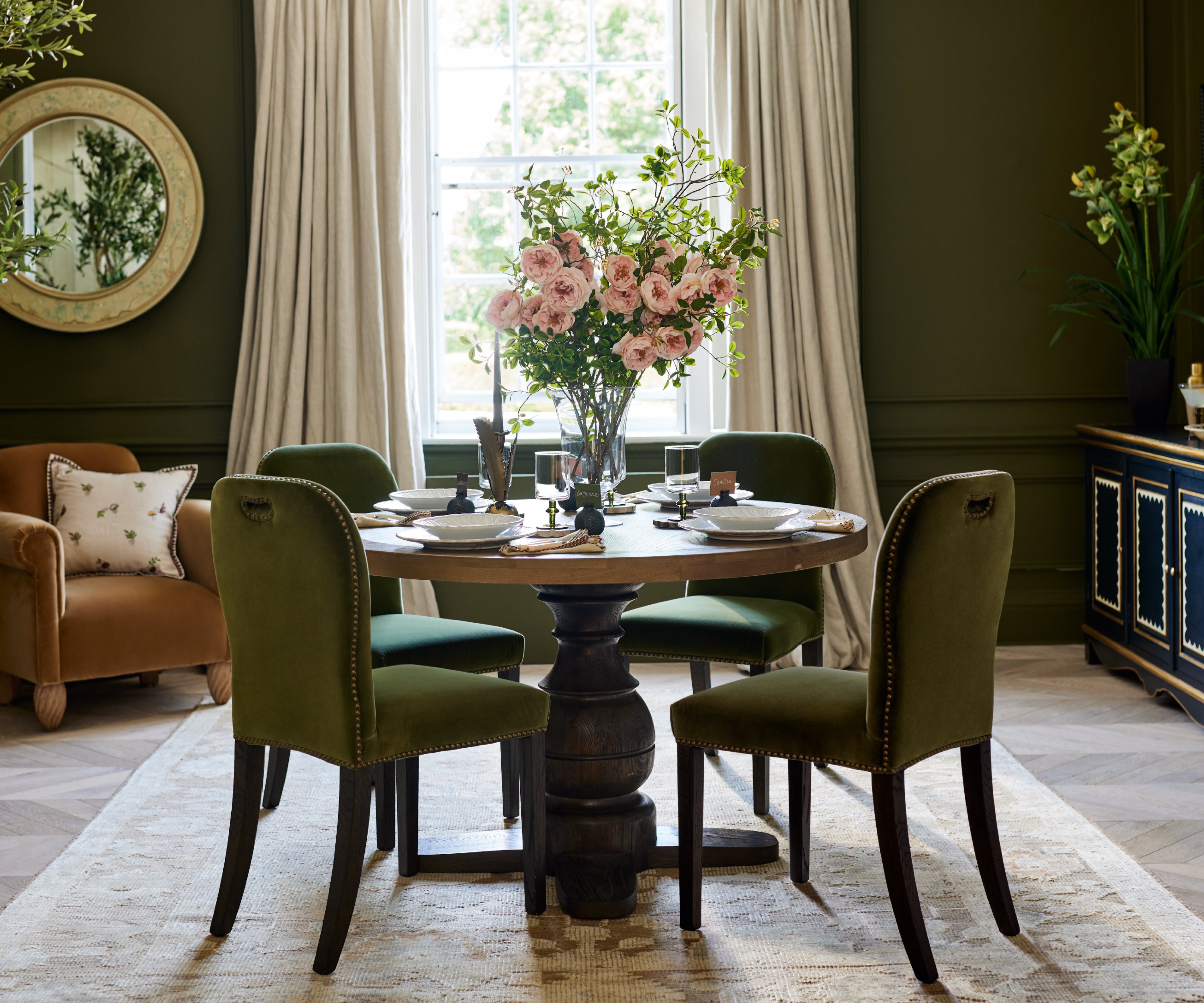 From the deep blues of the sea to the emerald greens of rolling meadows and the earthy reds of the ground beneath us, natural colours make us feel calm and connected to the bigger picture. Why not set the scene with a forest green dining room paired with our Stafford Velvet Dining Chair upholstered in a spruce colourway and the Lastura Sideboard in a dark and dramatic midnight blue? Contrast with earthier tones in natural wood finishes, antique-gold accents and neutral textiles like floor coverings and curtains. The result is a fresh and natural-feeling green dining space infused with natural warmth.