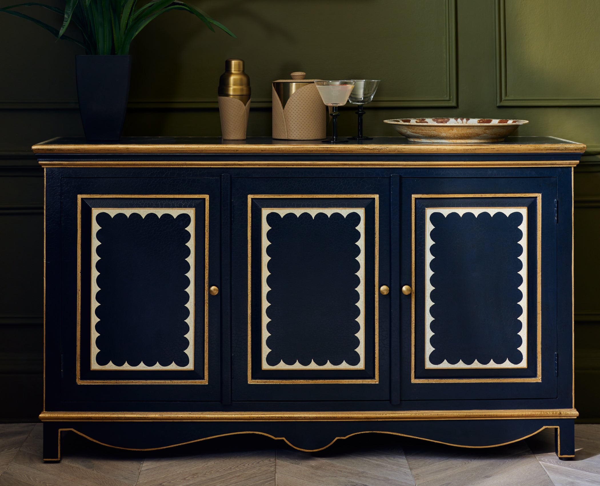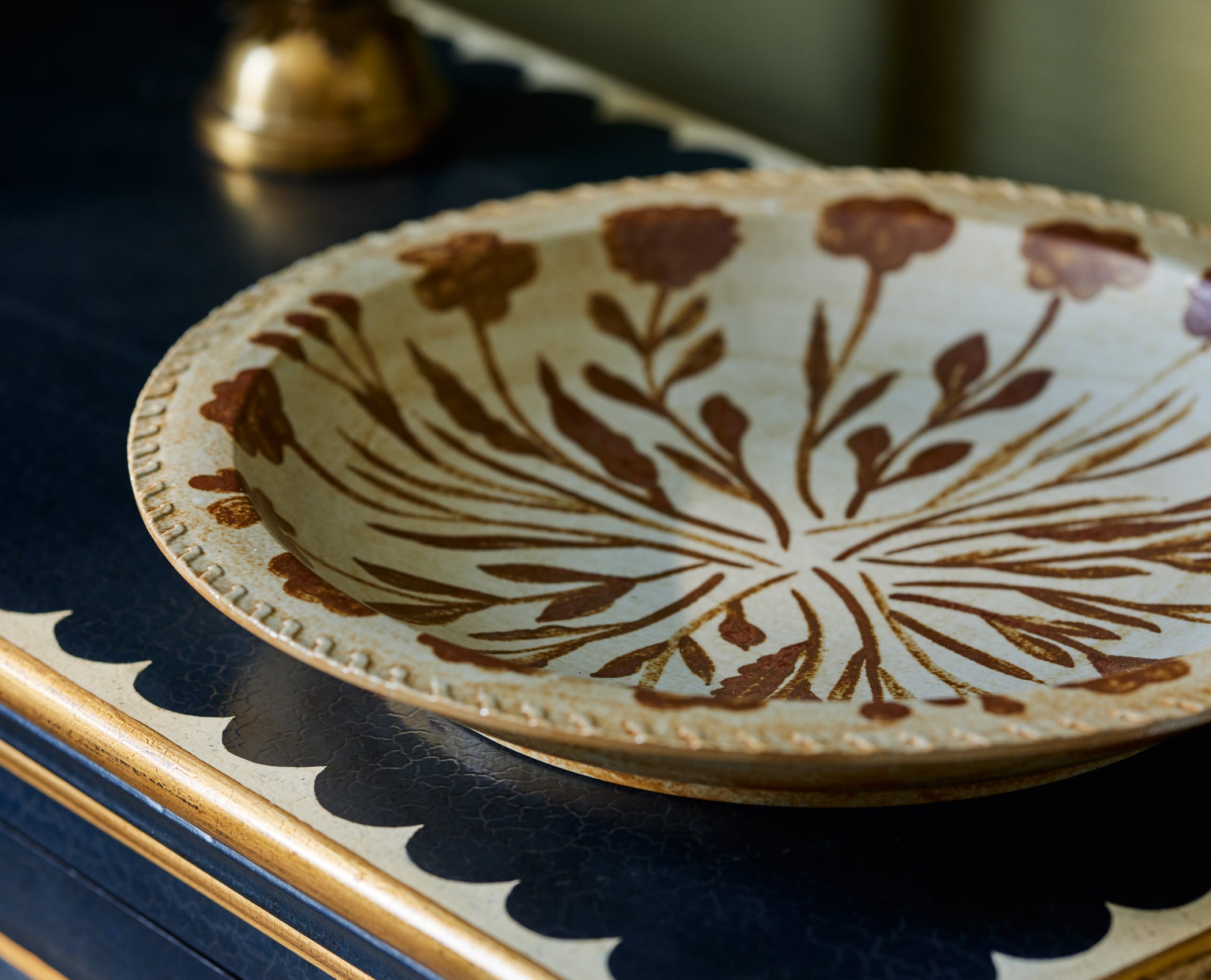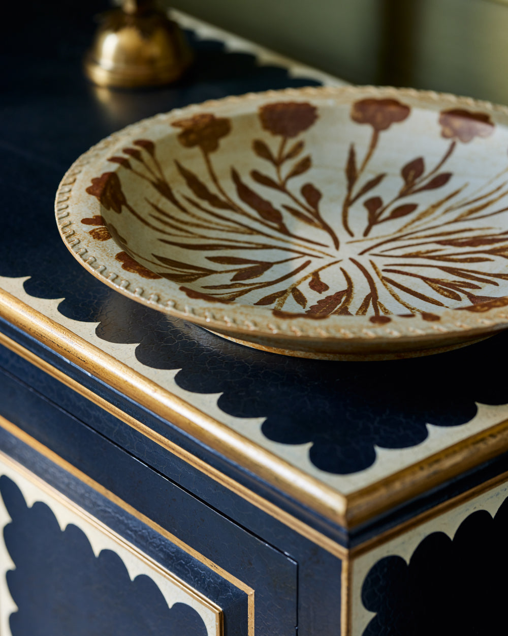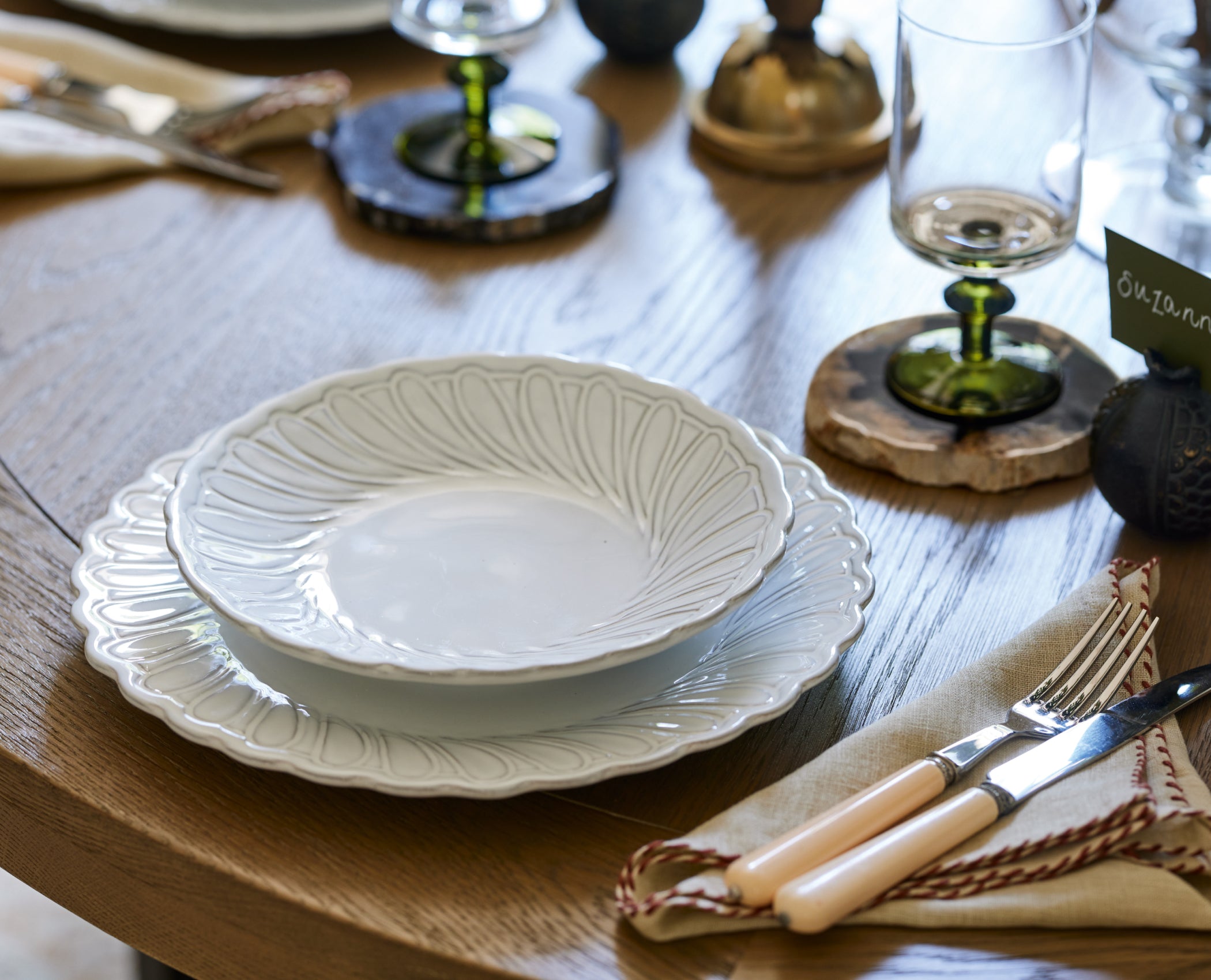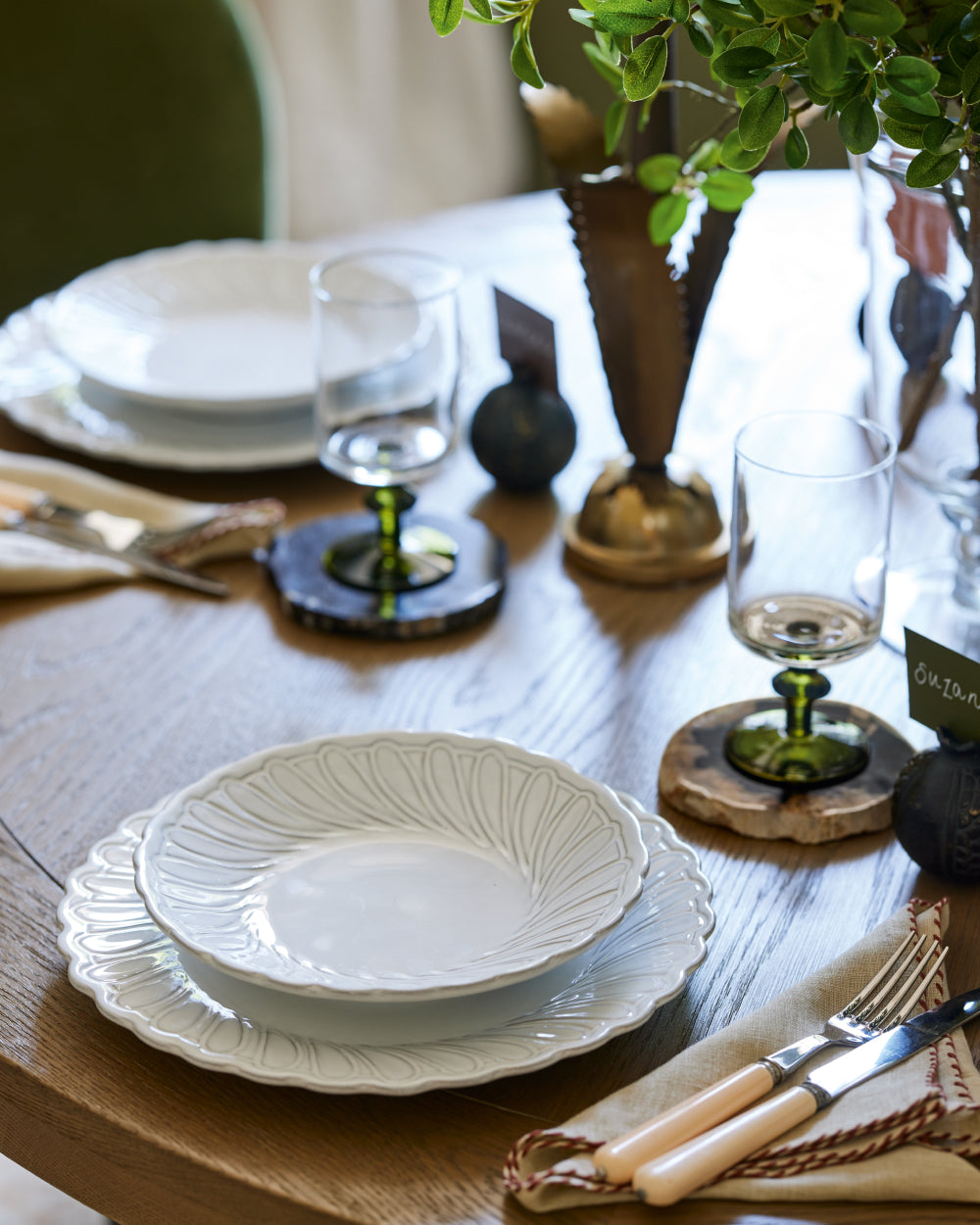 Lastly, when you’re thinking of ways to incorporate nature in the absence of being able to get outside, look to organic shapes with fluid lines and curves as well as motifs that take their inspiration from living things or the landscape. Ahead of a Sunday roast, we’ve laid the circular Magnus Dining Table with handmade pieces from our collection of Nephele crockery featuring cloud-like forms and scalloped edges. Alternatively, our Lastura Sideboard evokes the energy of crashing waves with its white detailing on a squid-ink base.