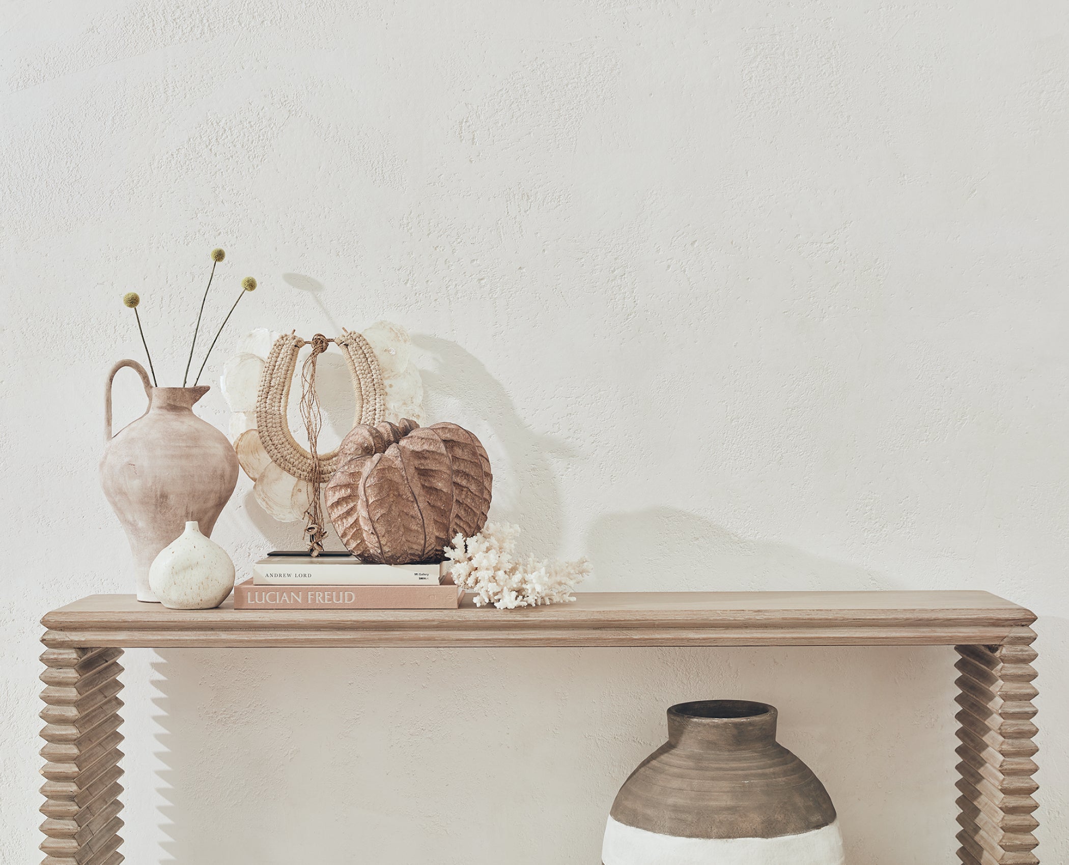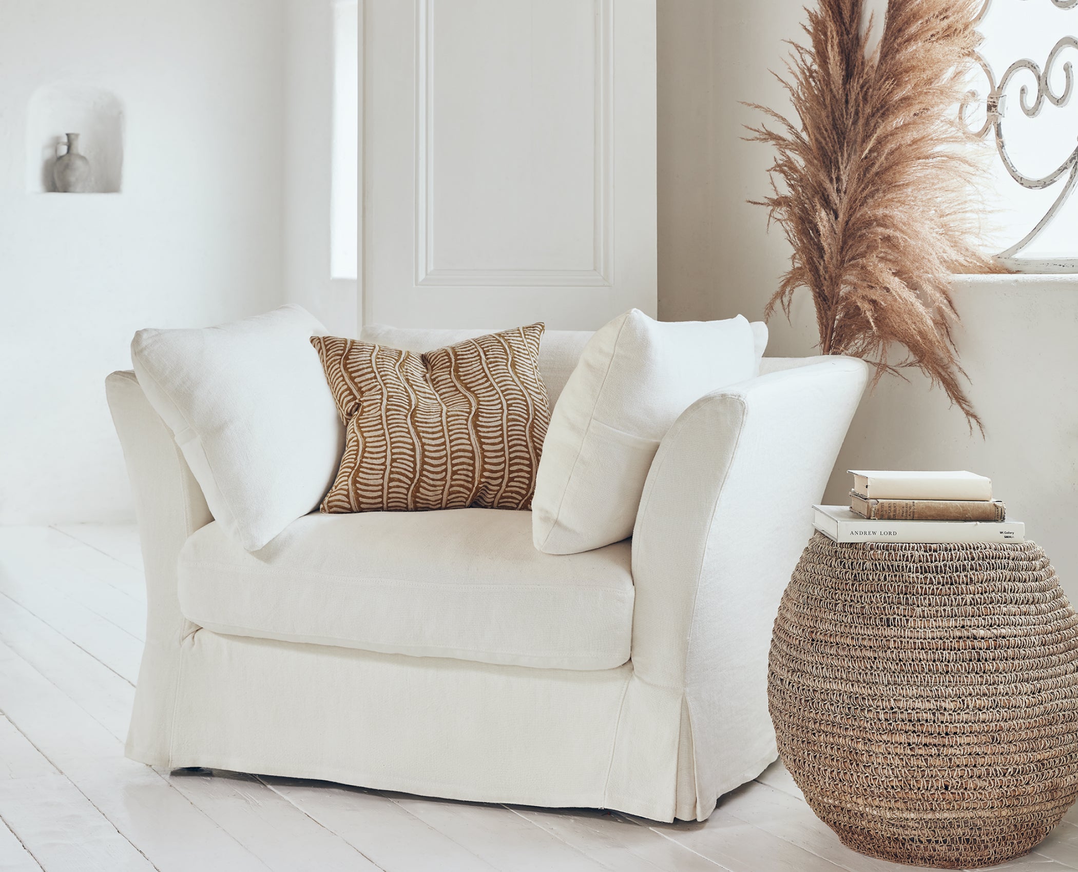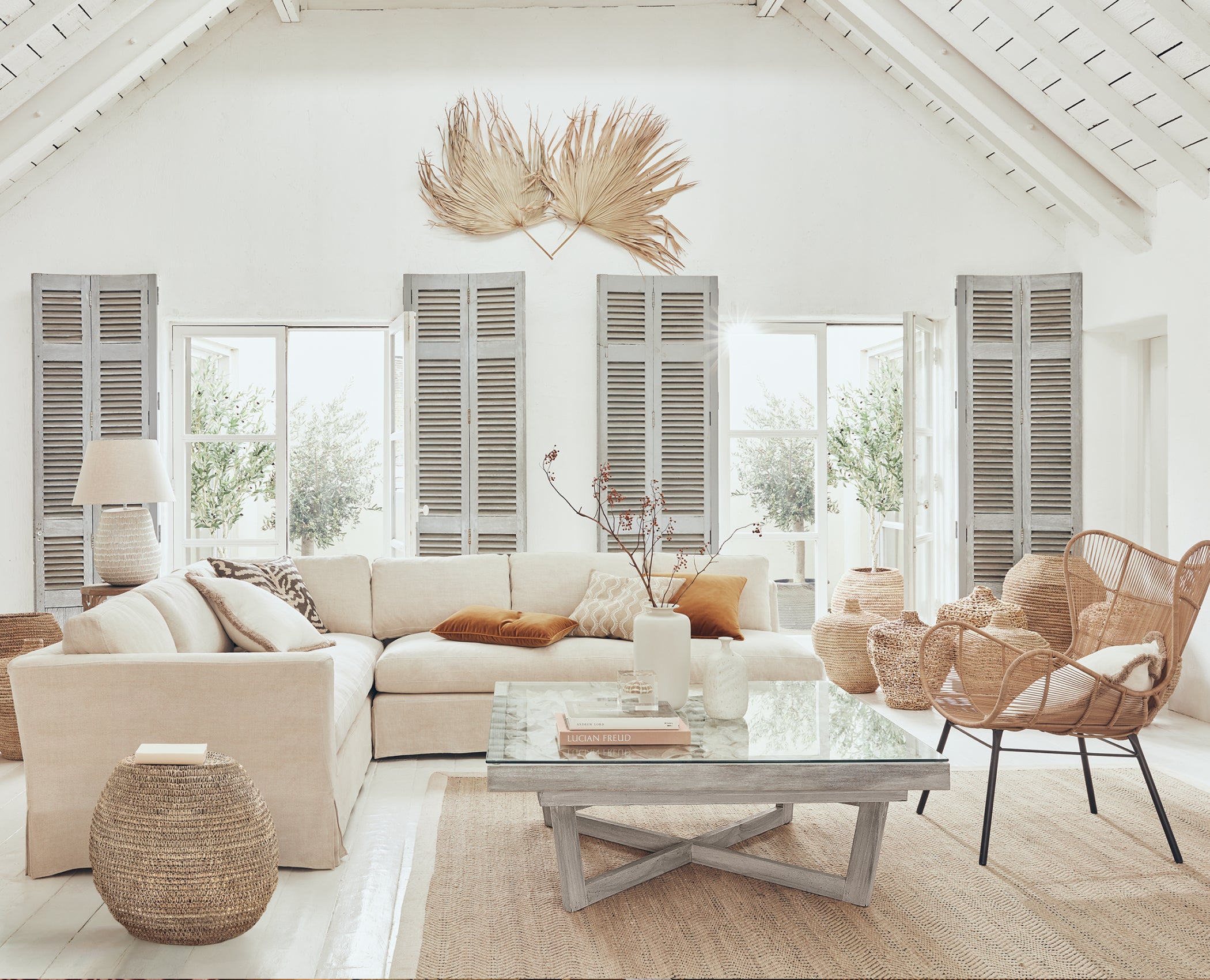 This welcoming sitting room has a relaxed feel – you'd never know you were in the heart of London. Assorted grass baskets, offering texture in abundance, are layered with rattan and rope detail to heighten the Cycladic vibe. This look may inspire your next Mediterranean adventure (when travel is back on the horizon), but, then again, who needs a sun deck and a dip in the Aegean when you've got your very own olive grove and a corner sofa like this to lounge on?