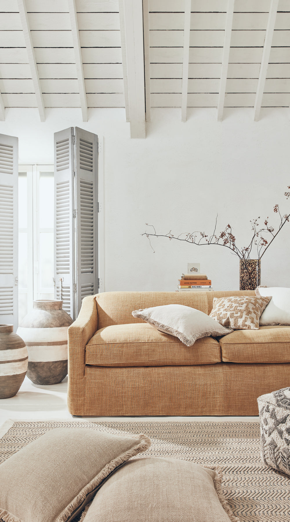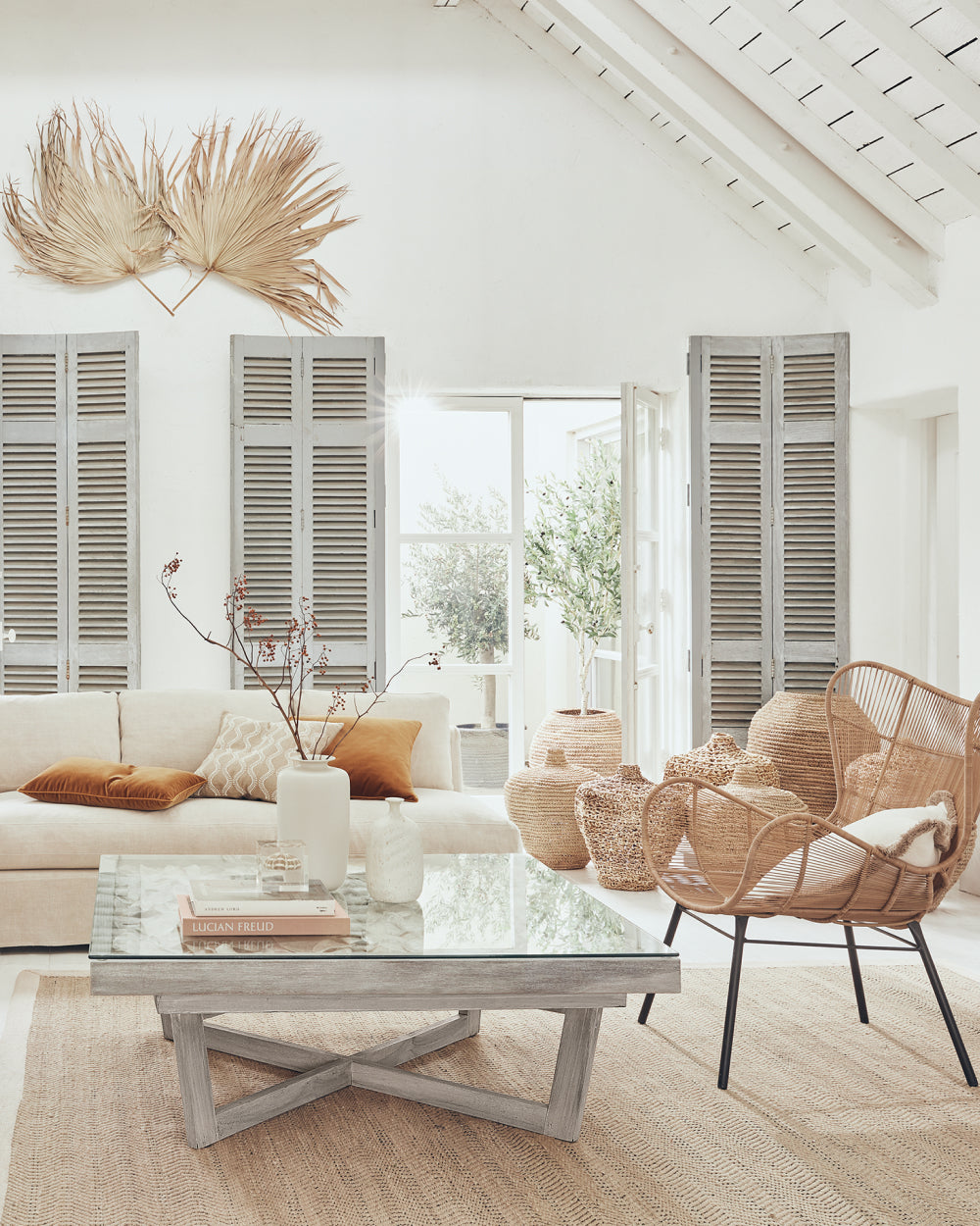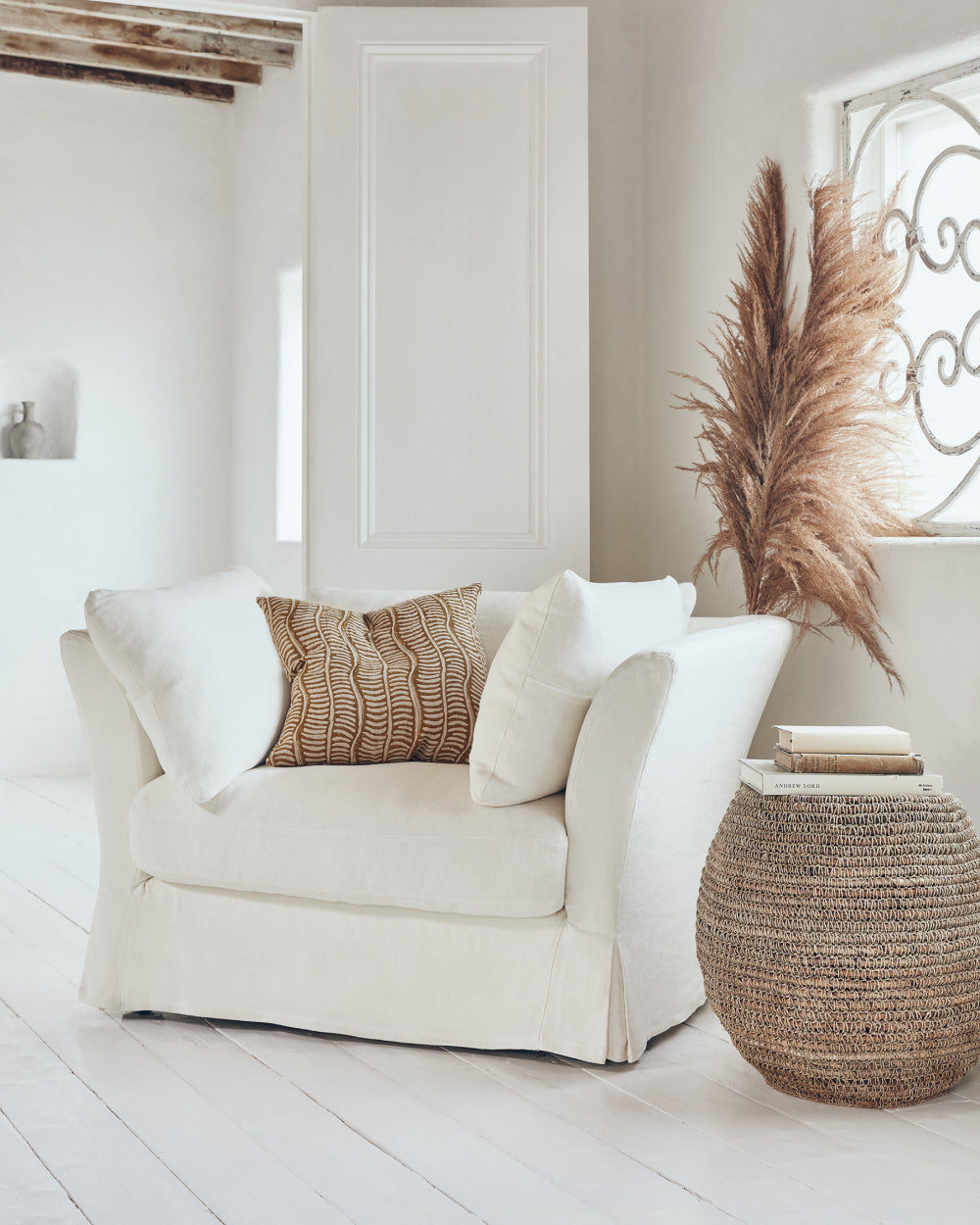 The Cycladic lifestyle is one of beauty and simplicity. A relaxed mood, rustic charm and warmth, in myriad forms, underpin the aesthetic, which Anders Olsson, OKA’s head stylist, chose to emulate. The open-plan space, with its whitewashed wood-panelled floors and ceilings, white walls and large shuttered windows provides a beautiful blank canvas – the perfect starting point for a minimal yet soft look, which is so typical of the Greek islands. It was important that the scheme be comfortable and sociable; you’re invited to sink into the linen sofas or grab a cushion and pull up a seat at the table. Allow us to show you around…