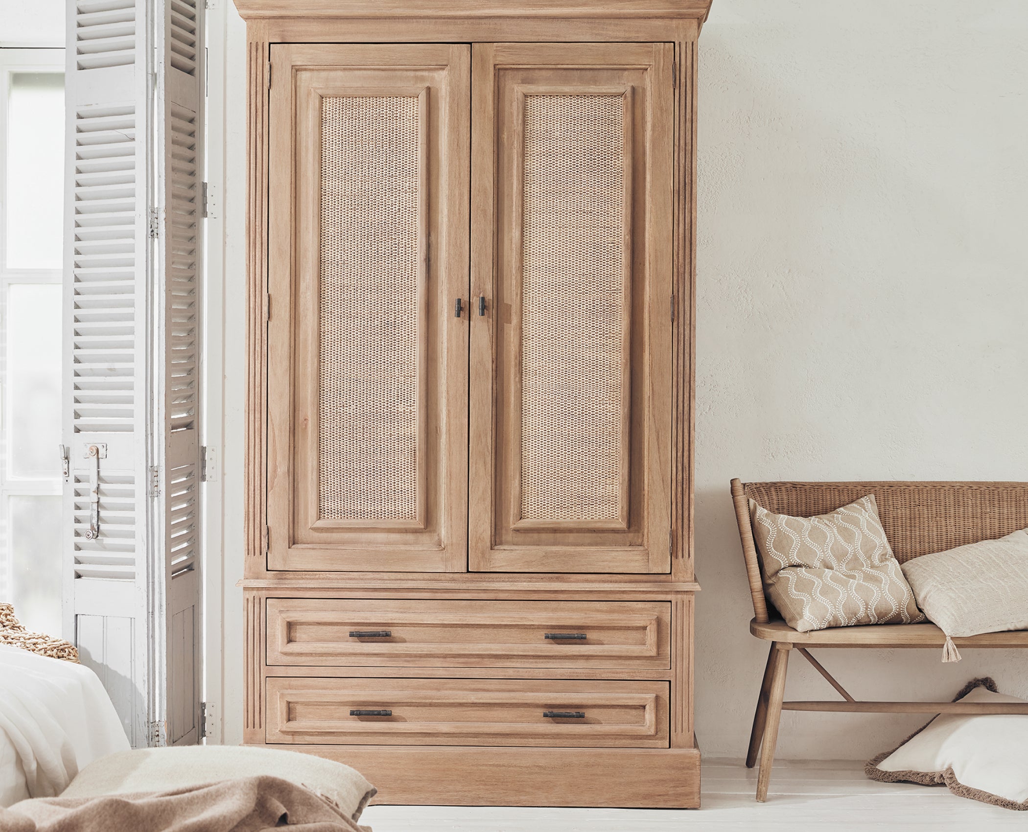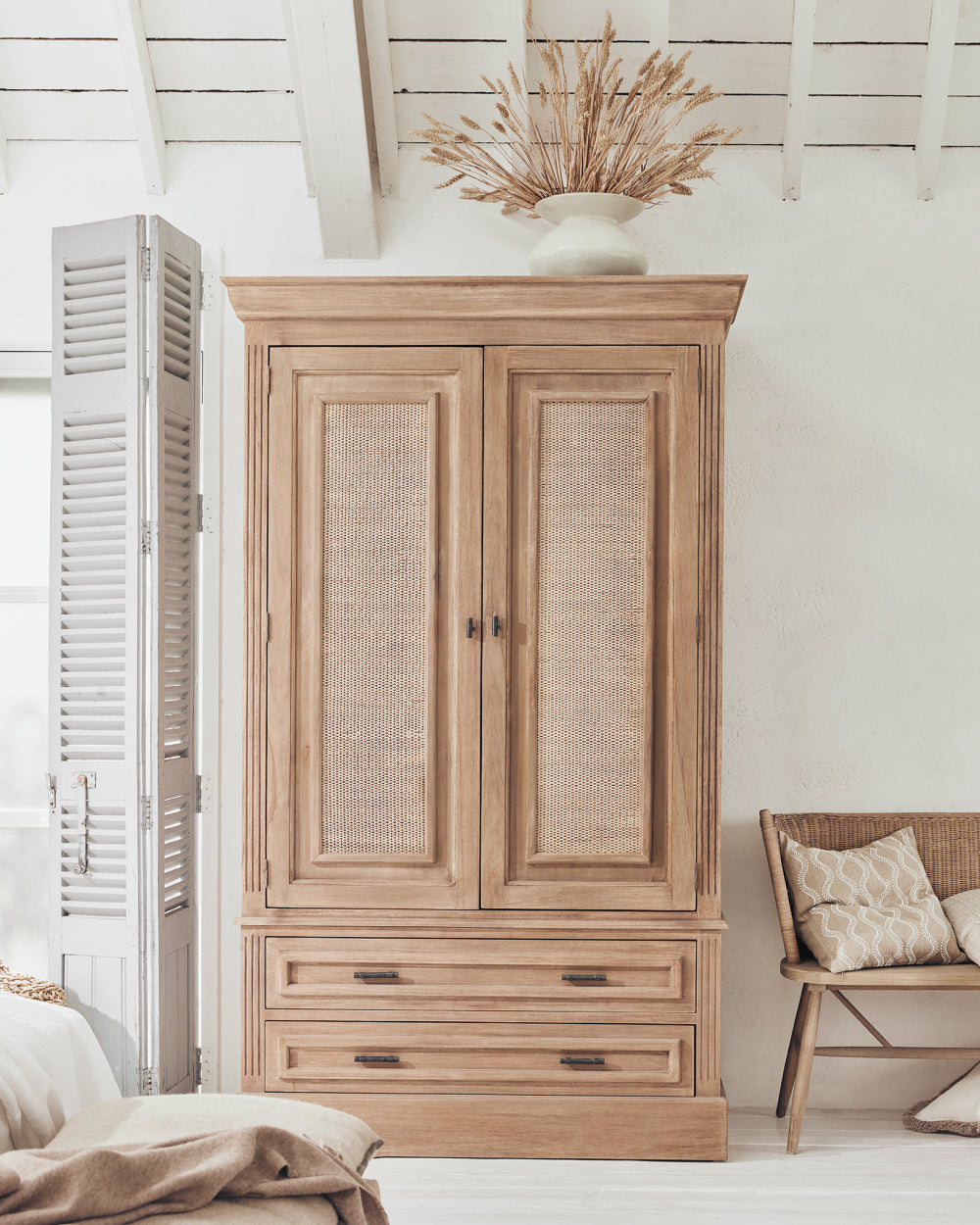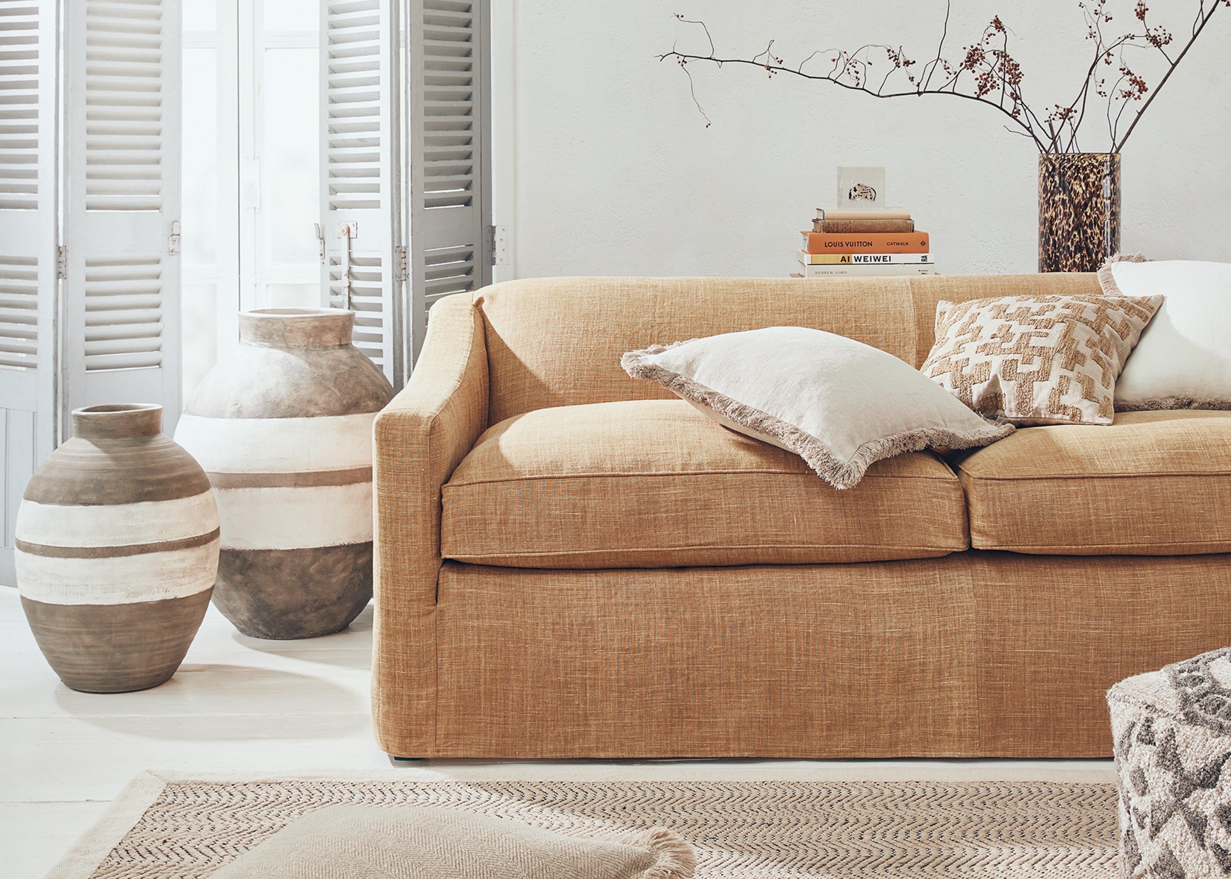The Cycladic lifestyle is one of beauty and simplicity. A relaxed mood, rustic charm and warmth, in myriad forms, underpin the aesthetic, which Anders Olsson, OKA’s head stylist, chose to emulate. The open-plan space, with its whitewashed wood-panelled floors and ceilings, white walls and large shuttered windows provides a beautiful blank canvas – the perfect starting point for a minimal yet soft look, which is so typical of the Greek islands. It was important that the scheme be comfortable and sociable; you’re invited to sink into the linen sofas or grab a cushion and pull up a seat at the table. Allow us to show you around…