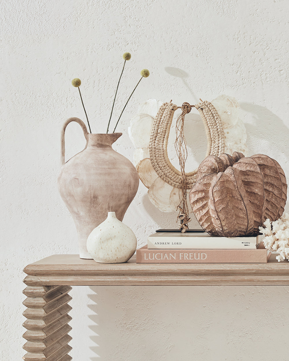 This roomy, casual space is centred on a dining table fashioned from weathered wooden railway sleepers. It felt right to frame this focal feature with other wooden pieces since traditional Greek villas are full of furniture crafted from locally-grown olive, cypress and lime trees. Our Feur Chairs and rustic wooden Gullion Bench perfectly fit the brief and offer extra helpings of rustic appeal. This scheme is designed to have a neutral palette, but if you wanted to add bright tones you could do so through crockery – even food itself can be used to bring lots of colour to the table.