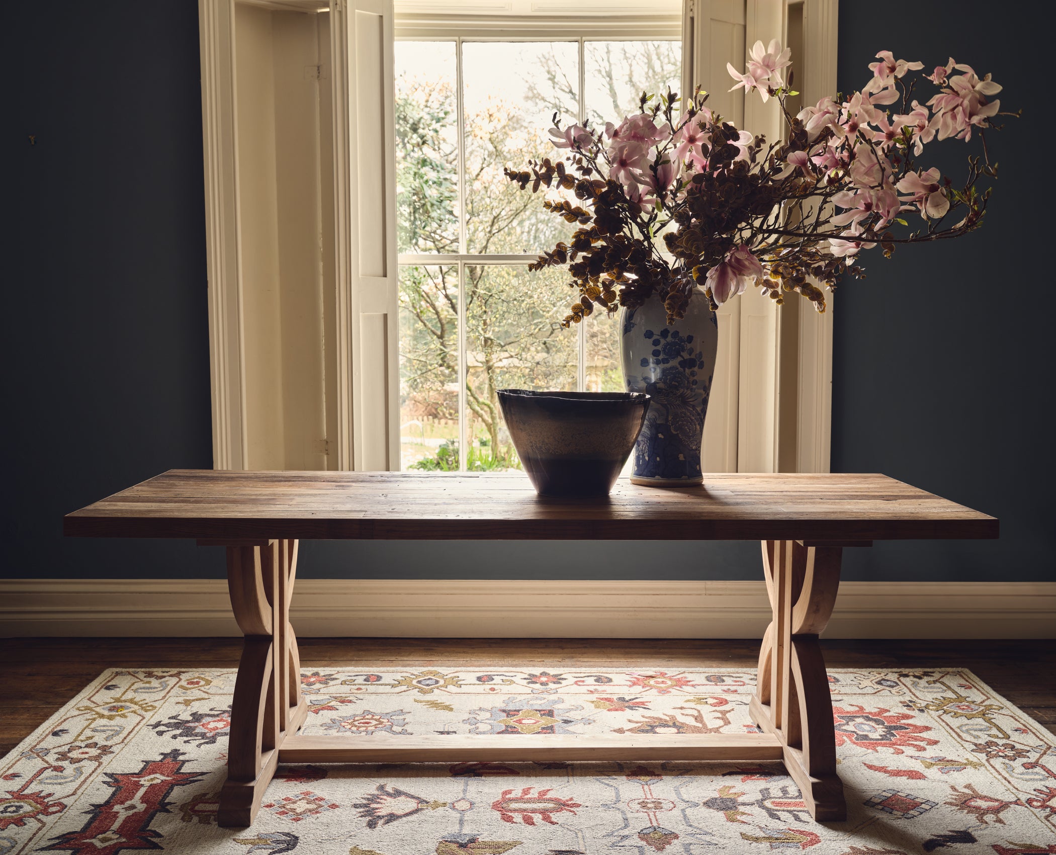 Once the wood has been sourced, the recycling process begins. First, it is kiln dried – 45 days for oak, and 15 days for pine and elm – before being cut, washed and dried again. Once the wood is ready to go, the carpentry team get to work, bringing dining tables, sideboards, cabinets and other furniture pieces to life. The pieces are then dried again before either being hand painted or finished depending on the design.