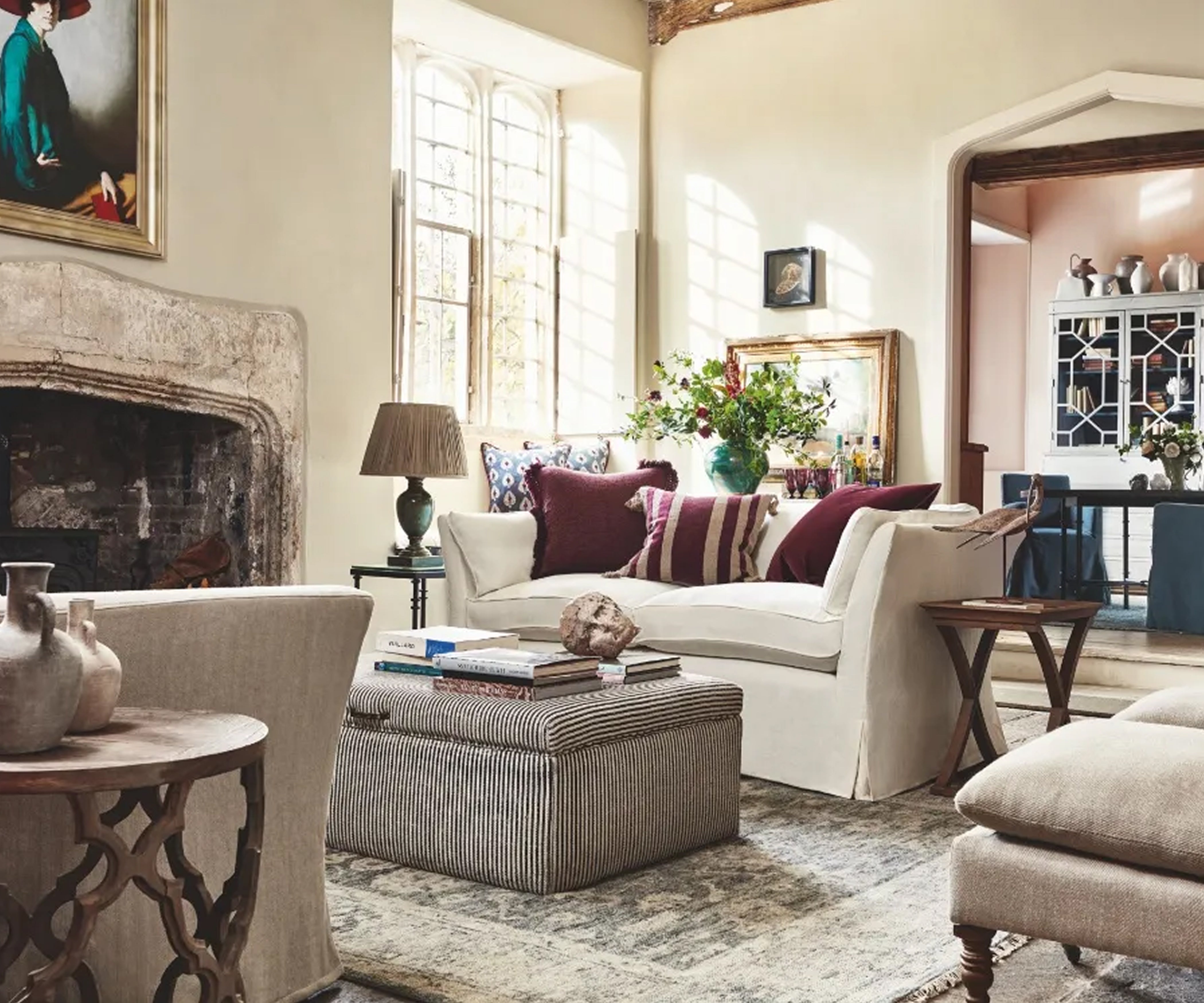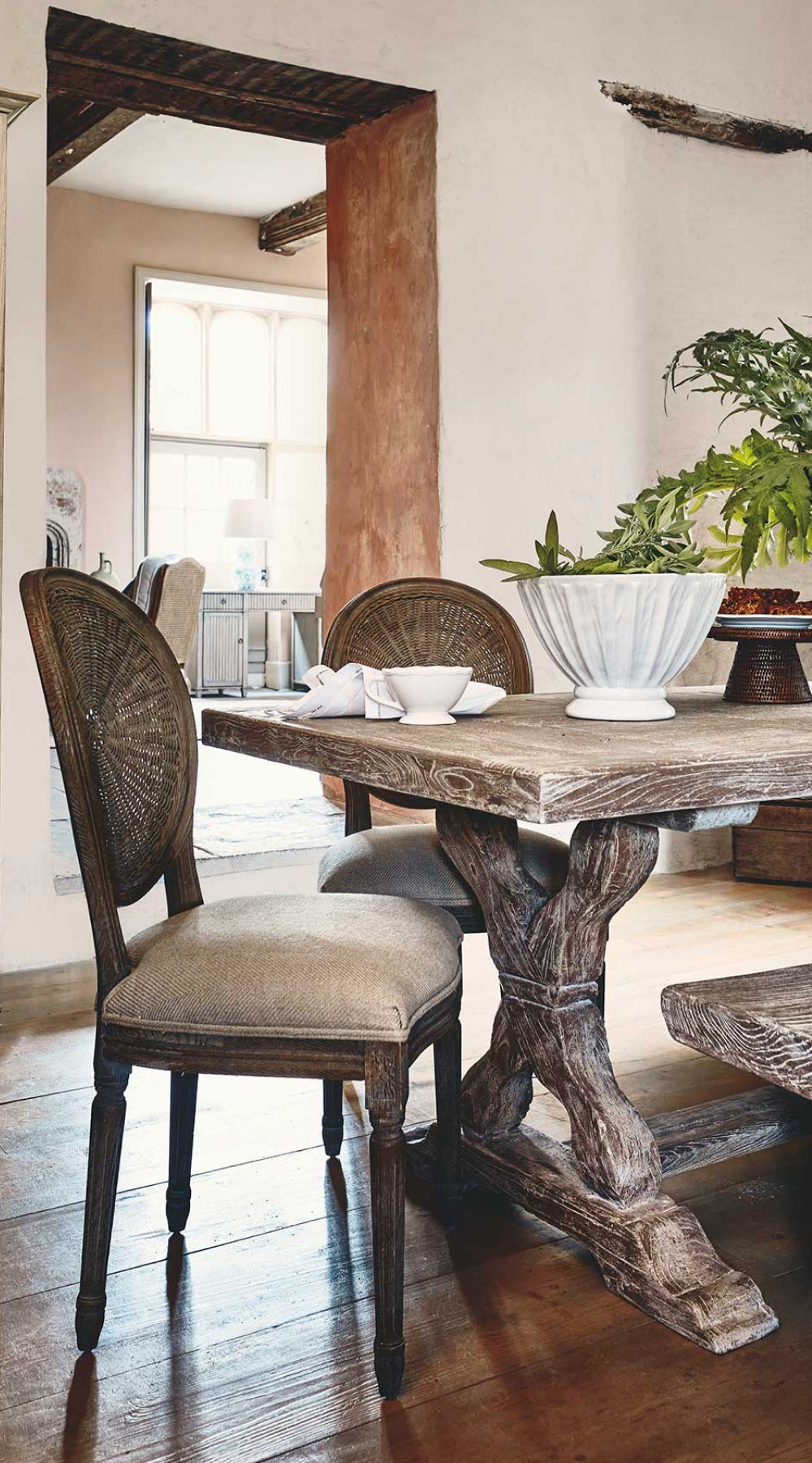 When OKA co-founder Sue Jones styled a Grade II-listed manor house in Portishead, she had one thing in mind: to allow the features of the property to sing. Court House Farm has a certain magic about it. Dating back to the medieval period, its buildings have been carefully restored over the years, but its character remains quite the same. Stepping inside is like stepping into a moment frozen in time. There are so many fascinating historical elements: the raw plaster walls, old brick fireplaces, weathered wooden floors and huge beams. Rather than play to the traditional to showcase these details, Sue chose to create a setting full of contrast. Modern, clean-lined furniture, plenty of patterned textiles, and an eclectic mix of classic and contemporary accessories look, surprisingly, right at home here amid all the history and authentic paintings. It’s a seamless look that is simultaneously smart and welcoming, without overstatement.