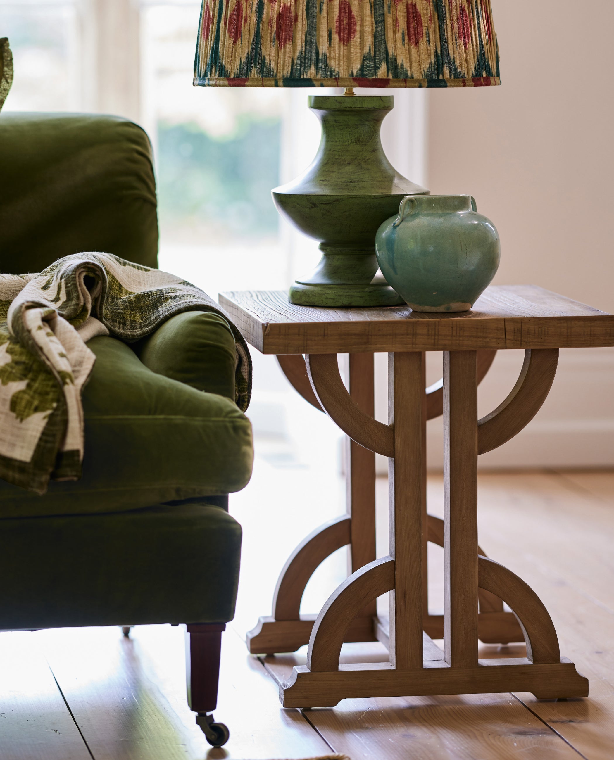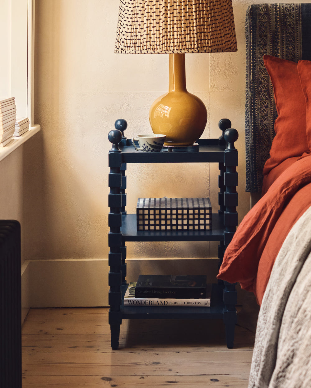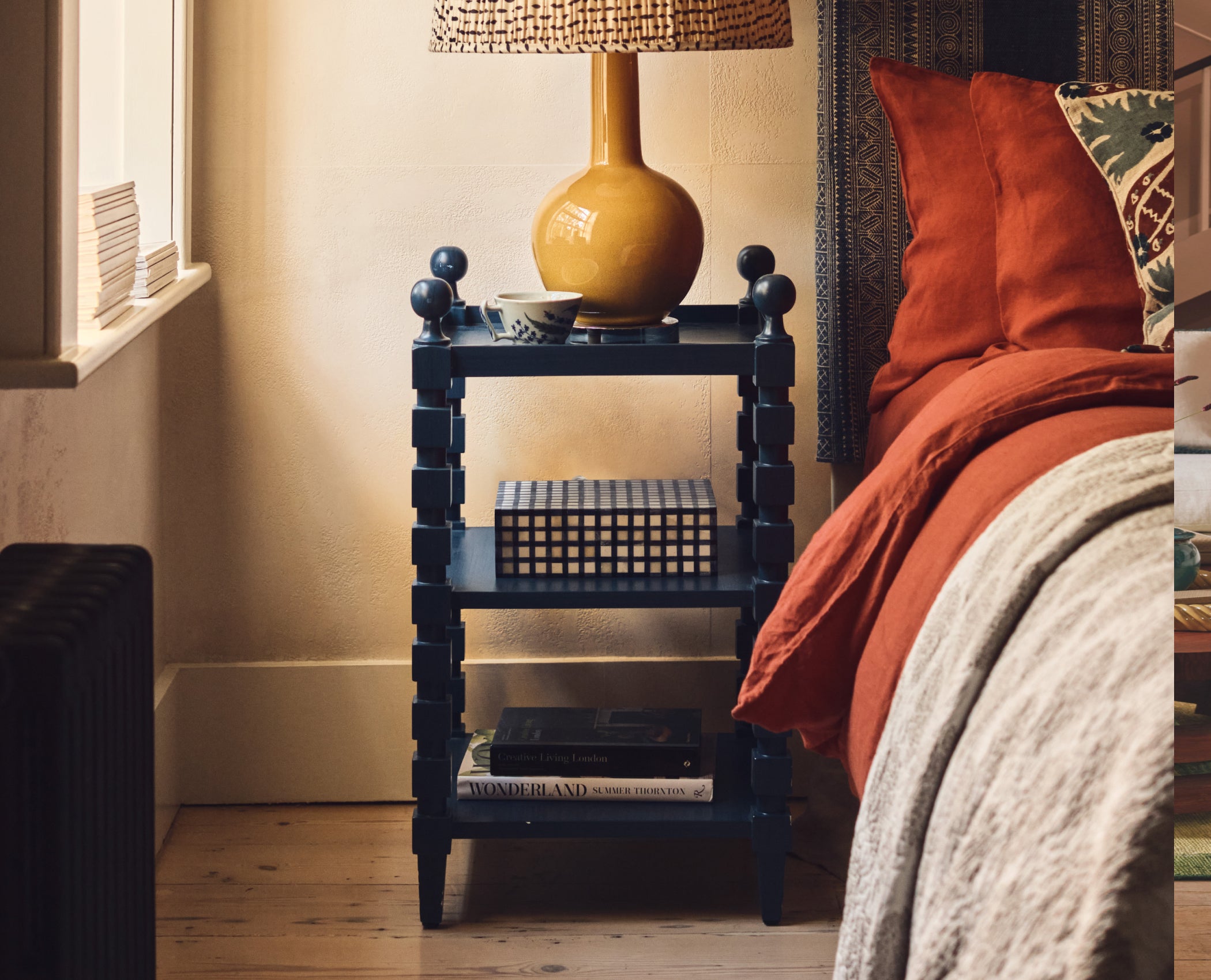 Both dimensions and function are important considerations here. Aesthetically, you should look to leave a few centimetres between your furniture and side table, to avoid the combination looking cramped, so make sure to factor that in when you measure up your space – the average width of an end table is between 40 and 55 centimetres. If it’s for your bedroom, let the size of your bed guide you; if you have a king size, you’ll want to find a wider piece than if you have a single, to make sure everything looks in proportion.
