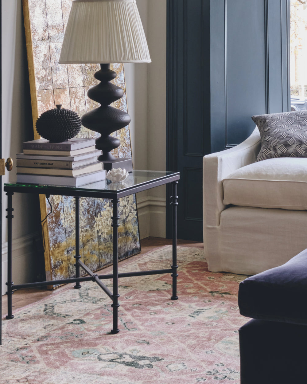 It’s also pertinent to think about what’s going to live on your side table. For instance, if you have a big statement lamp and accessories in mind, you’ll need more surface space than if you solely plan to use the table to rest a cup of tea or glass of wine.