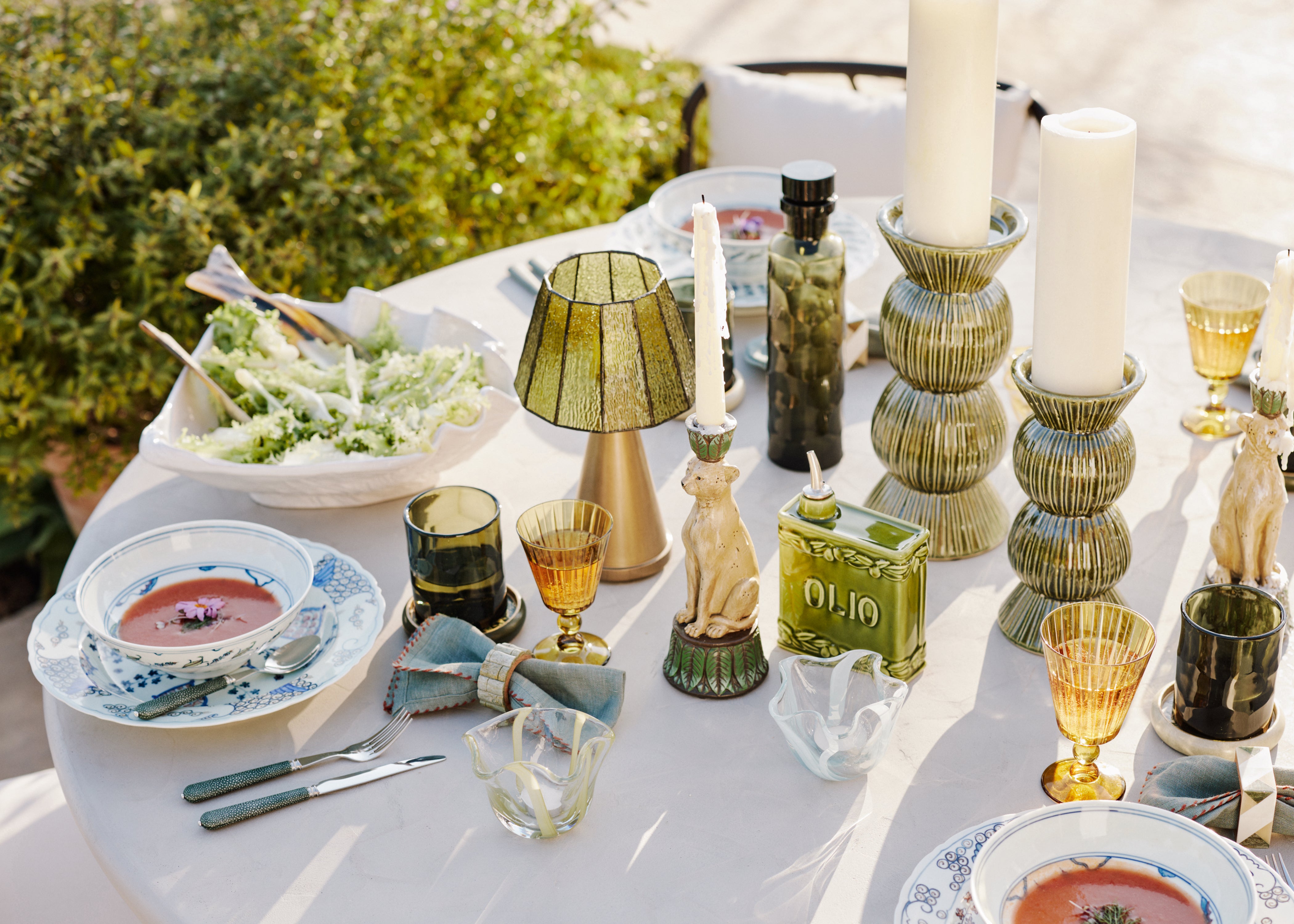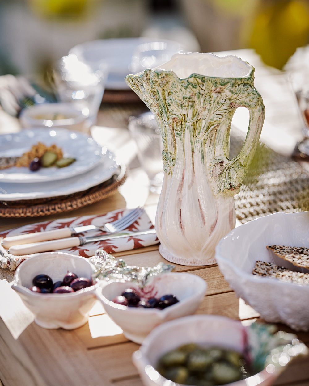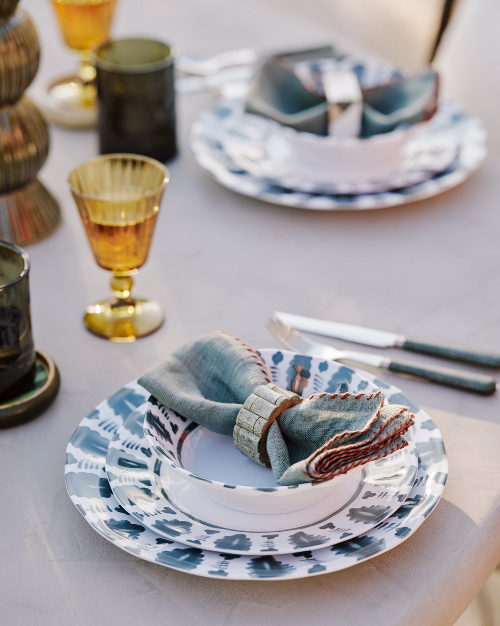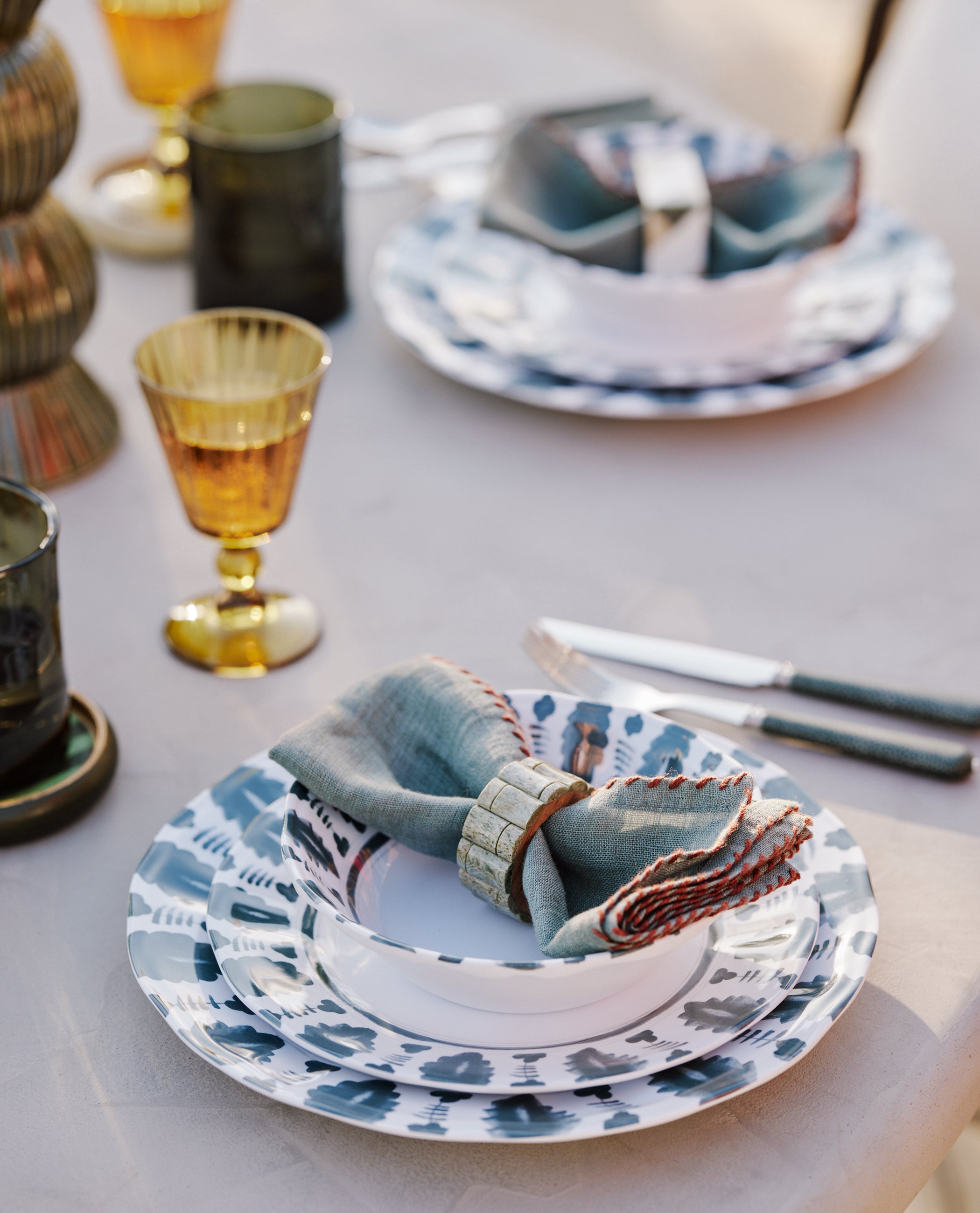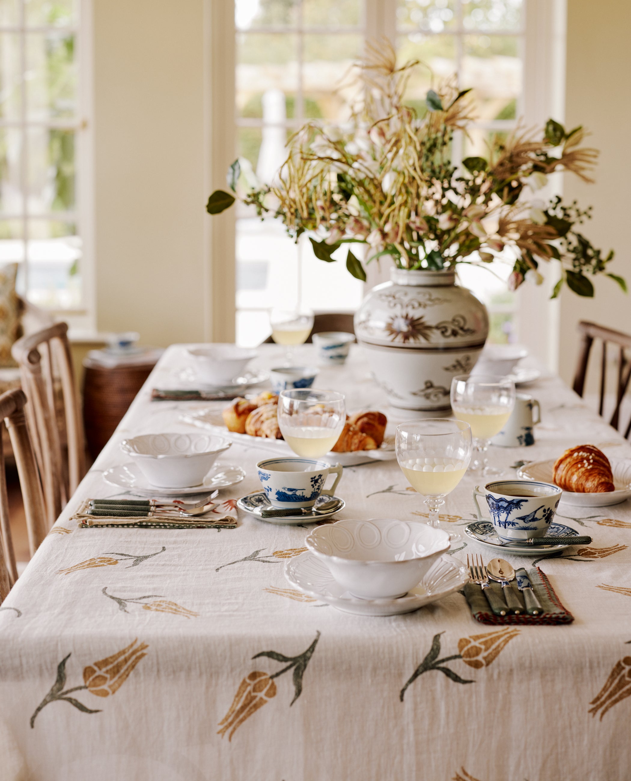 Texture is what gives a spring table depth. Linen tablecloths and hand-finished ceramics work together to create an inviting, tactile feel. The key is contrast: patterned against smooth, soft alongside structured, all combining to create a table that feels considered but never over styled.