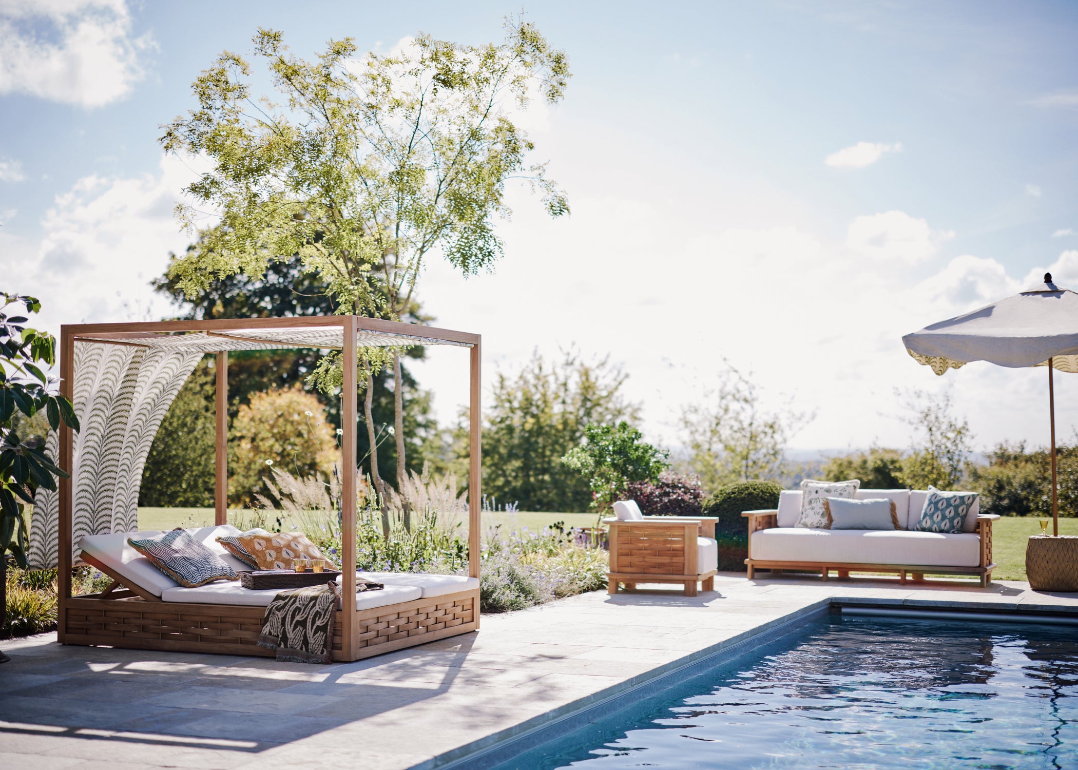 Create a relaxing atmosphere inside and outside your home with a tonal colour palette, geometric pattern and thoughtful furniture choices.