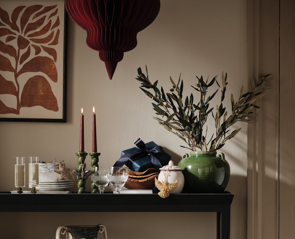 “Our Judwa bone picture frames makes such a thoughtful gift – the soft cream tones and subtle green stripes look timeless yet distinctive. Together, the pair brings warmth, texture and a touch of colour to any space. Why not gift to a loved one with your favourite photos already popped in the frames? For a bigger gift, the Joshuah side table is a hand-painted piece that combines bold, playful design with practical versatility. Its foldable structure makes it perfect for even the cosiest of nooks, while its striking colours and elegant details instantly brighten a room. As a present, it’s ideal for anyone who loves a bit of personality in their home.”
