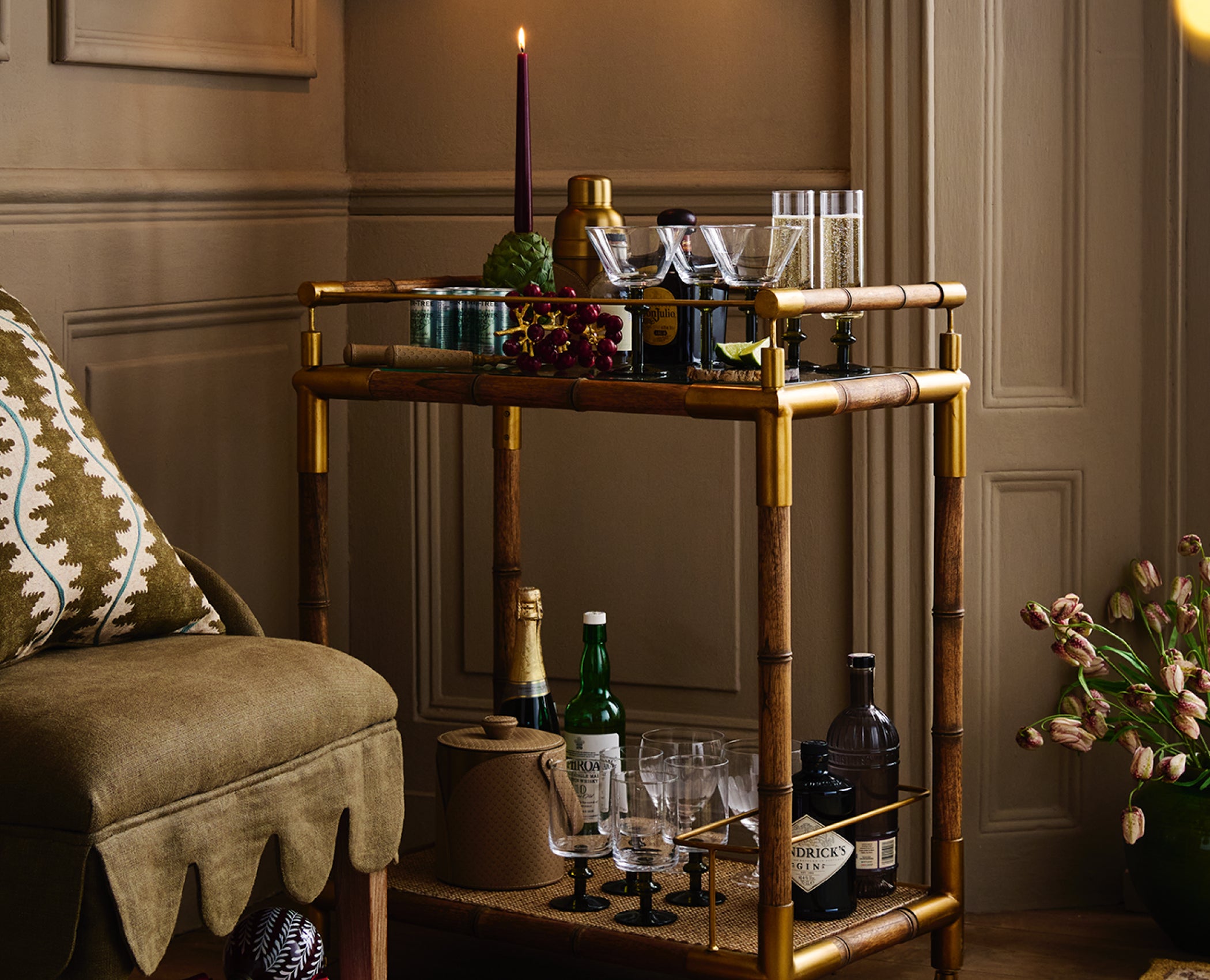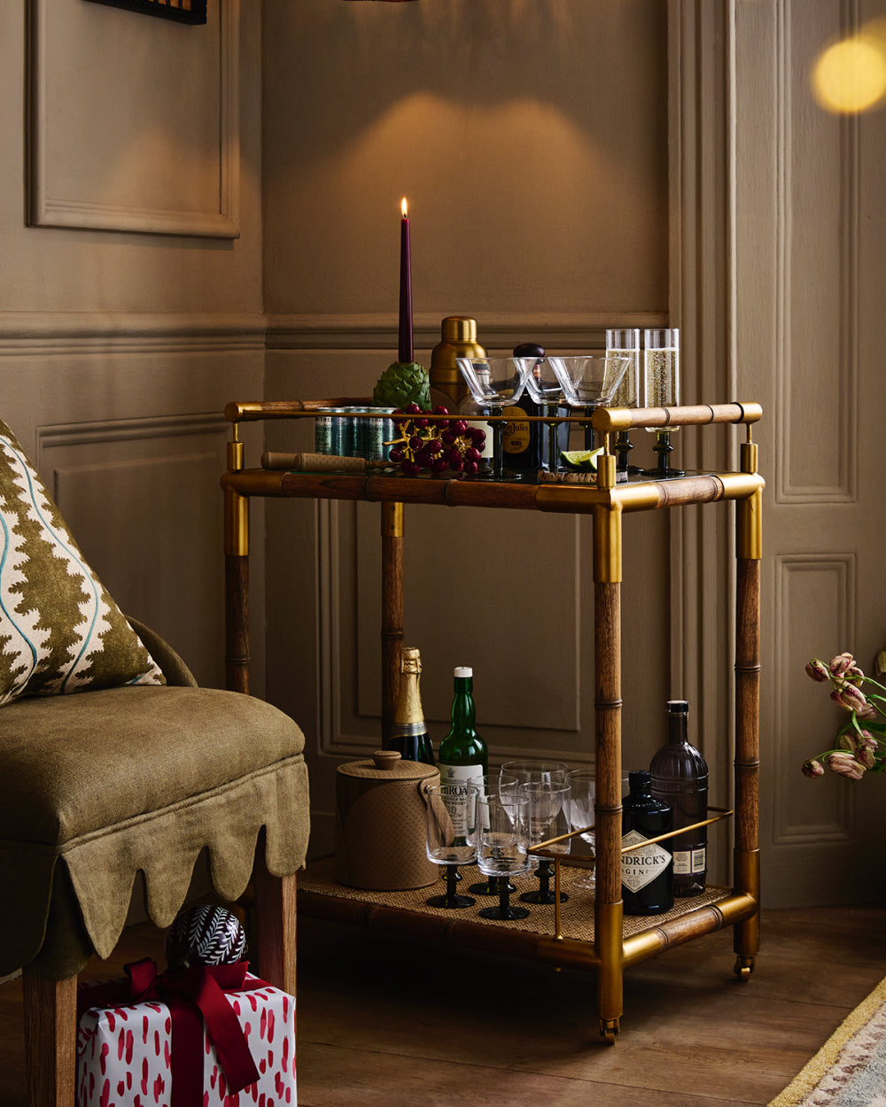 “I like to give presents with purpose or things I would like to receive myself. For example, our mini Grisewood wireless lamp can be used outside in the garden or down the centre of a table, which makes it as useful as it is stylish. It’s safer than candles and is great for all age groups, too. Otherwise, I often gift cosy throws – you can never have too many of them, such as Zevla made from recycled wool in a deep-brown colourway – or smart crockery like a set of hand-painted Kraak breakfast cups and saucers. Any kind of handwoven rattan is always lovely to receive, like a tray or coasters, as is a serving bowl or linen napkins. I also love giving something like a large Chinese vase – Changshou or Liliang – filled with faux flowers. It’s a little luxury people might not buy for themselves. I always keep a stash of smaller items as last-minute gifts for people I might have forgotten – beautiful glasses are very useful.”