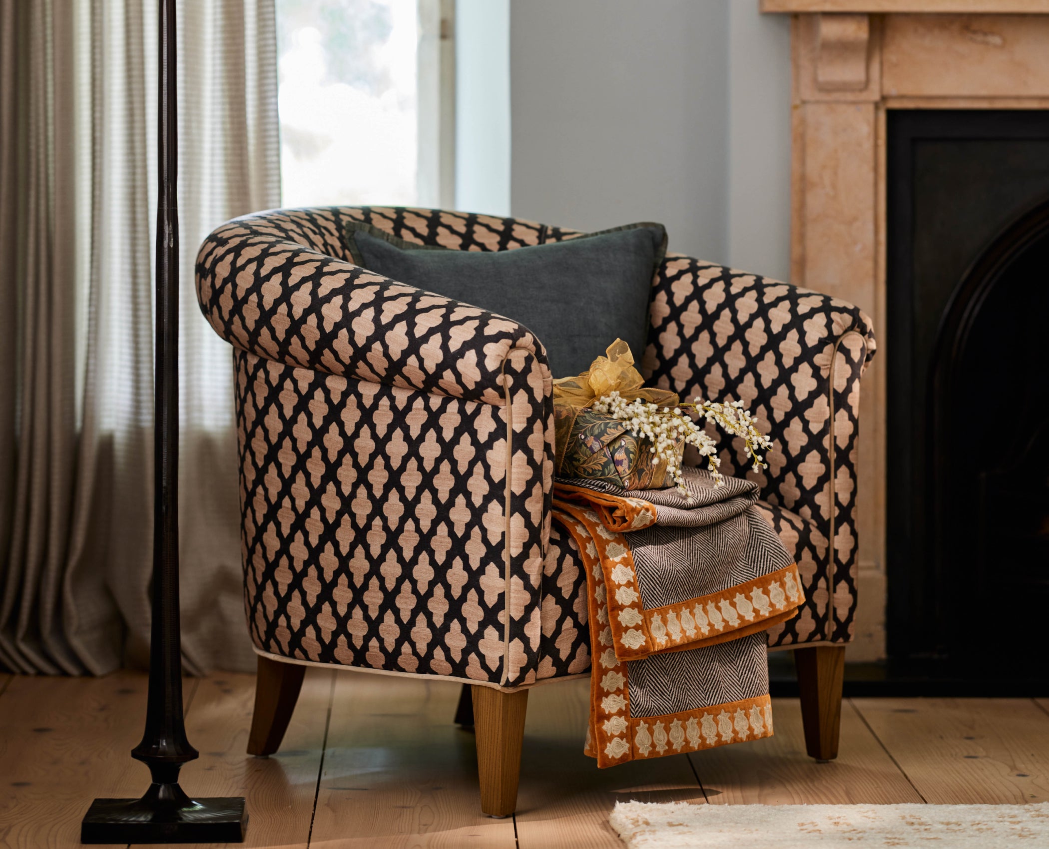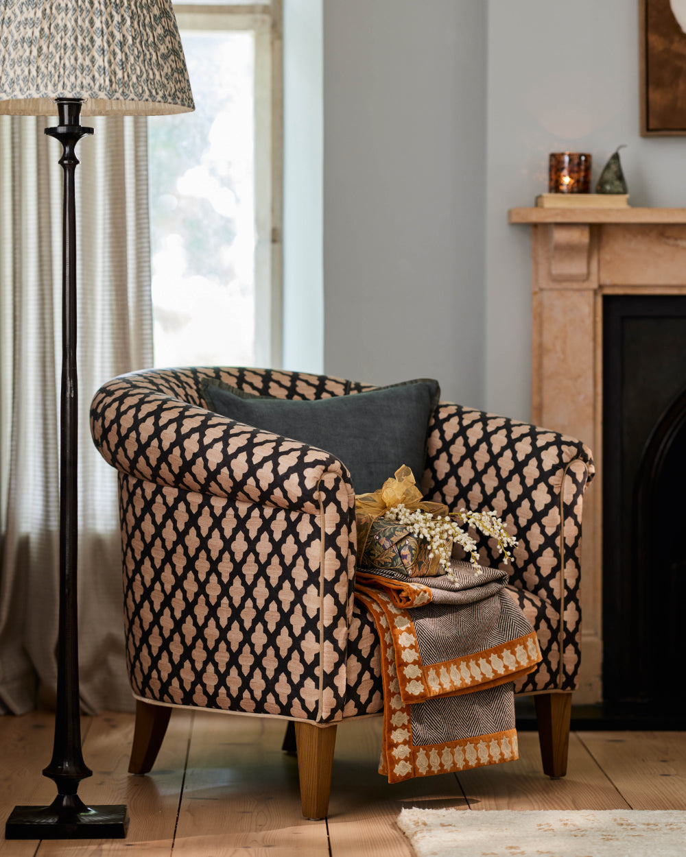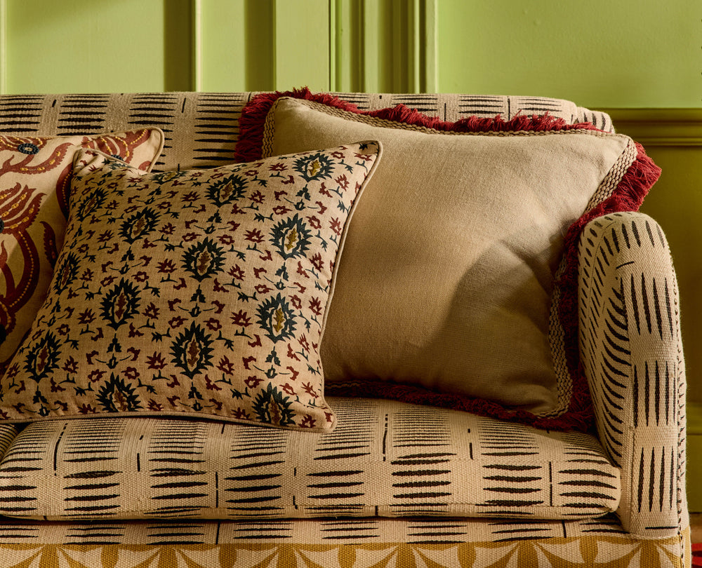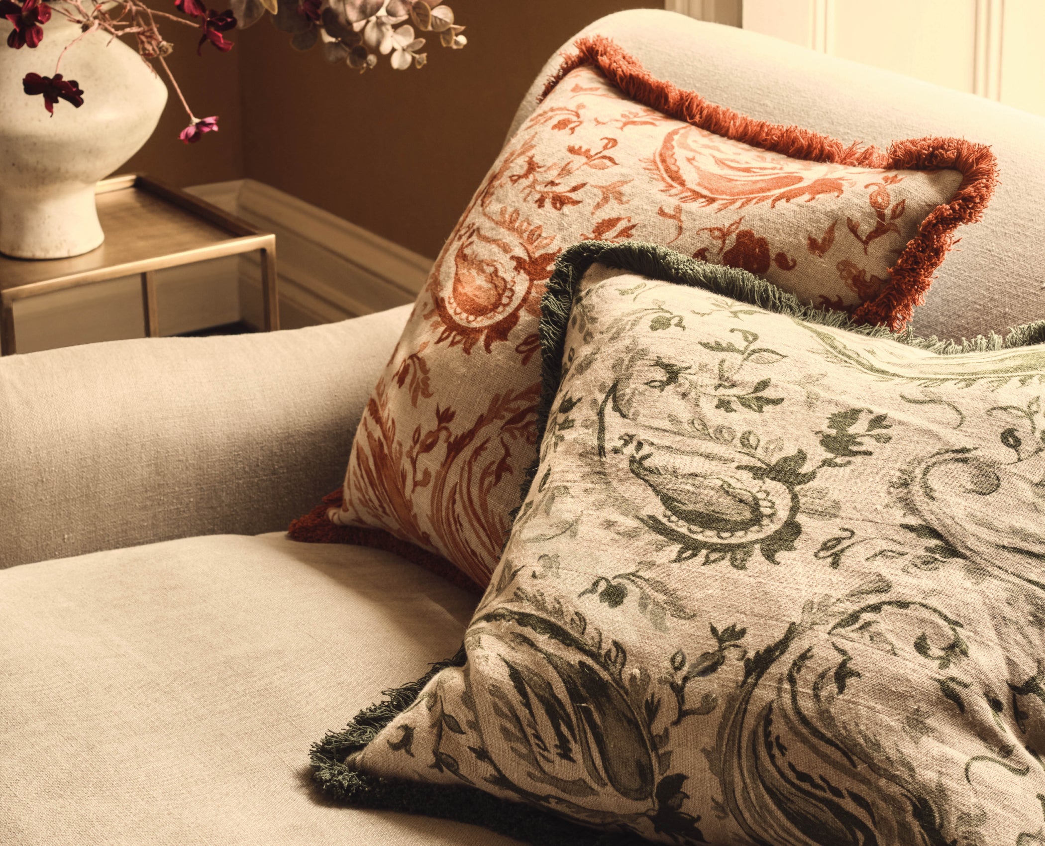 We have a real smorgasbord of trims for you to choose from this season, yet you may notice a deliberate focus in our colour palette… Many of our pieces dip into the camel colour trend, a hue that has previously featured on our cushions but only this season debuted on our upholstery. This timeless shade is boosted with considered red trims that elevate the designs from background pieces to stars of the show. The contrasting colours create balanced proportions, and as our designer Jessica McCauley says, the combination “adds a layer of interest and unique design to some classic shapes.” Take the Russell Ottoman for example, simple in its circular form atop a wooden plinth, but with an additional red and white striped ikat trim that runs around its edge. Not only does the trim catch the eye, it also reveals the opening for hidden storage inside. This trim is matched on our Weston Range– including a dining chair and a bar stool– so that you can dot the style around a room for a sense of cohesion, if you so wish. Similarly, our revitalised Camaret Range now features upholstery in our beloved Serigraph print, contrasted with a pretty red leaf trim that tempers the bold repeating pattern with something softer. This trim is also mirrored on our updated Ellary Armchair and Vaquero Linen Stool. Swaying from the colour trend is our Elowen Coolie Lampshade which features a thin black and natural chevron trim which elevates it to new heights, and the Zelva Throw whose cosy grey wool is bordered by warming orange velvet finished with chain-stitch embroidery.