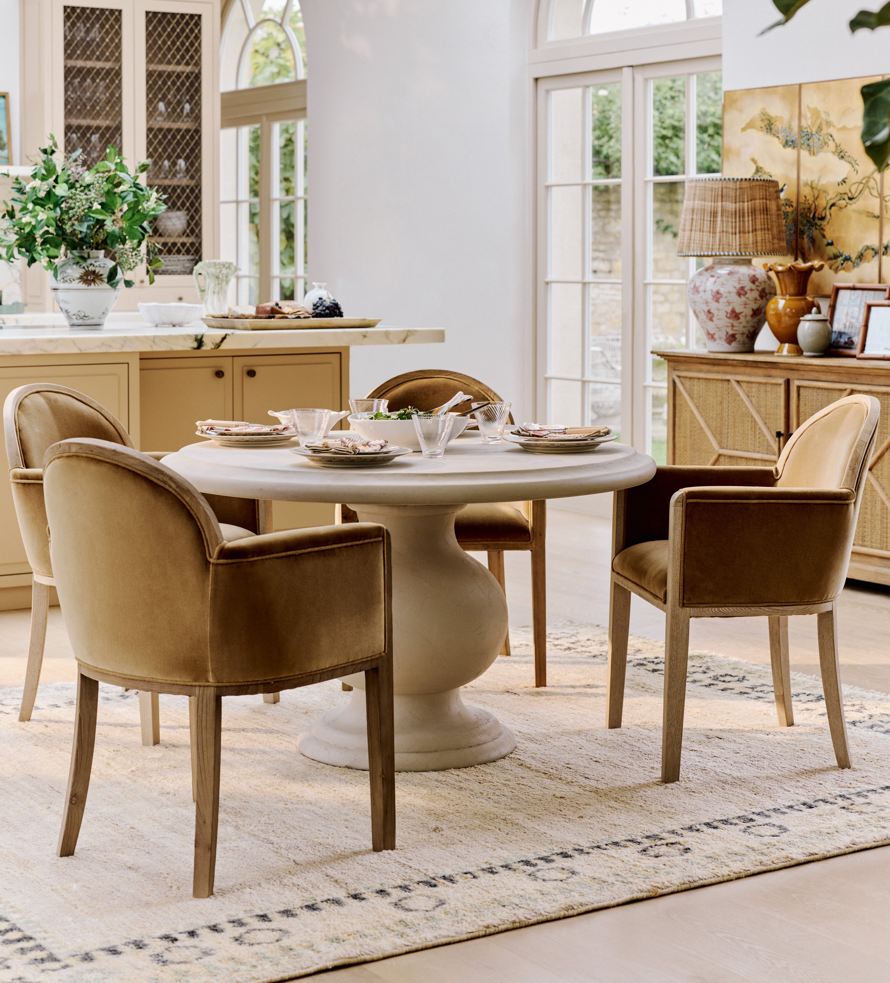 A new, scaled down round iteration of our best-selling Callanish Dining Table, this version offers the same sculptural presence in a more compact form. Its pedestal base introduces both shape and practicality, allowing more chairs to sit comfortably around it. Crafted using artisanal techniques and natural materials, each piece will display its own subtle variations.