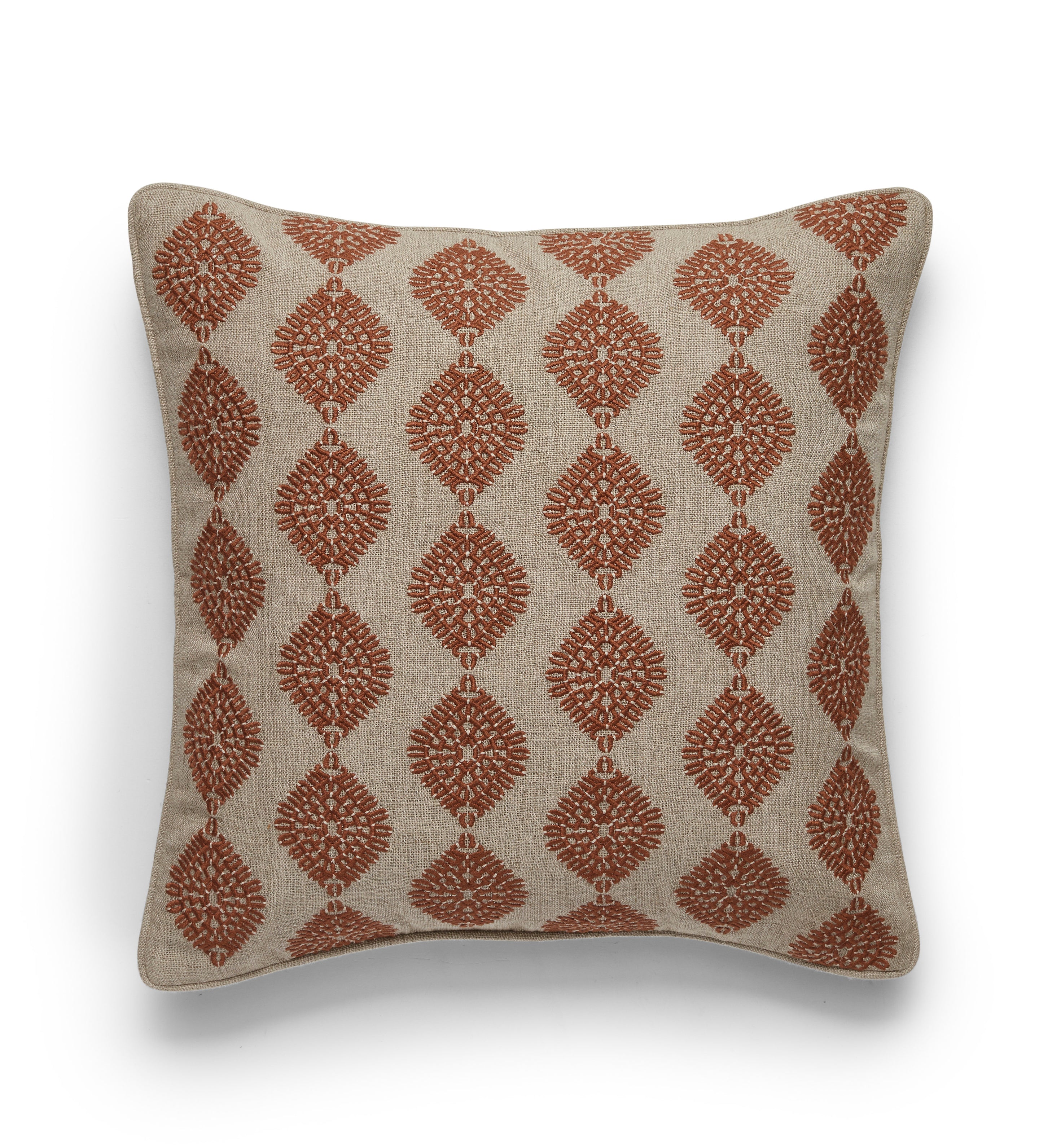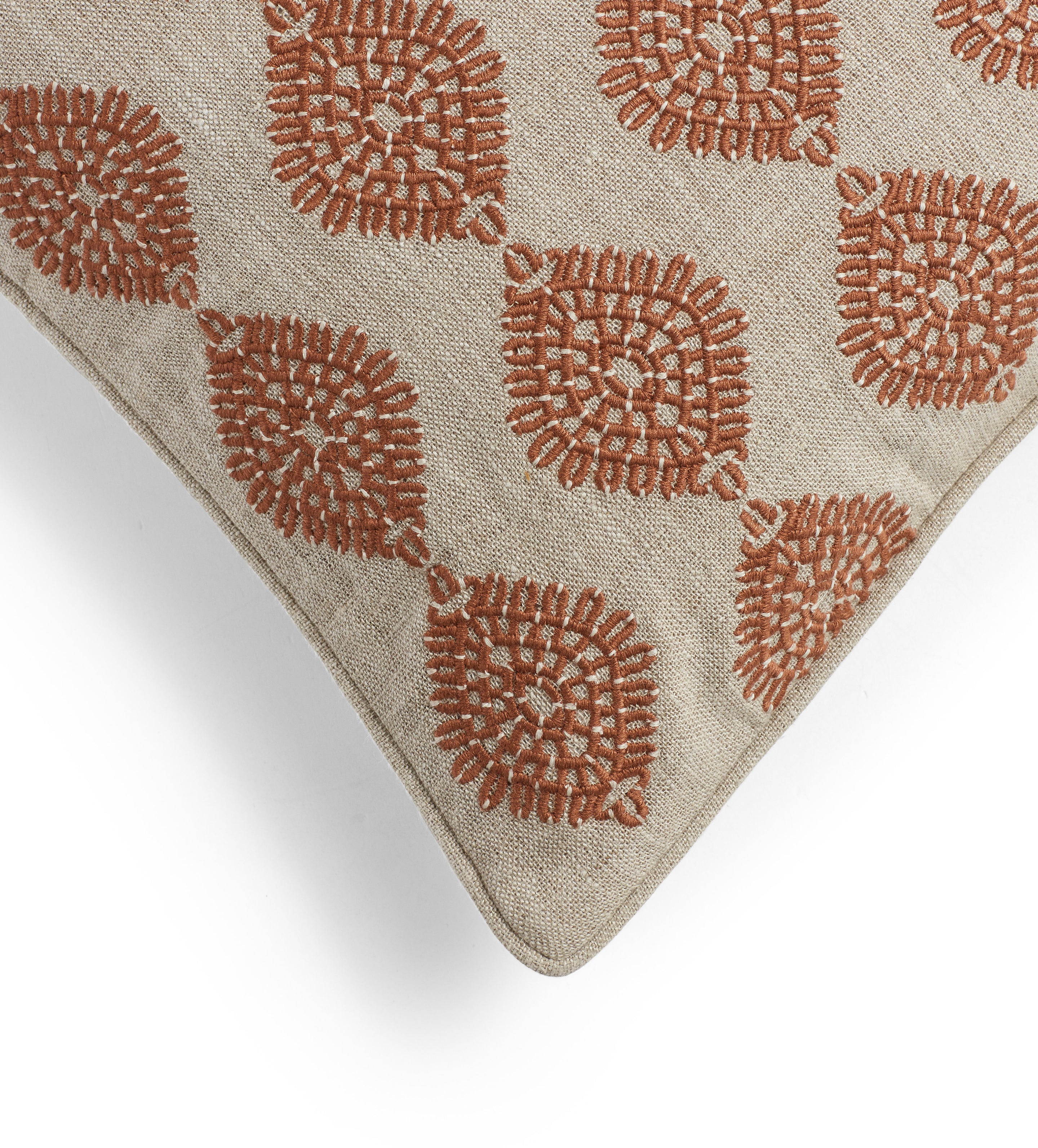 Transform your space with the Carthew Cushion Cover in dirty orange. Crafted from 100% linen, the single-sided self-piped design features repeated hand-guided machine-embroidered medallions, bringing texture to any room.