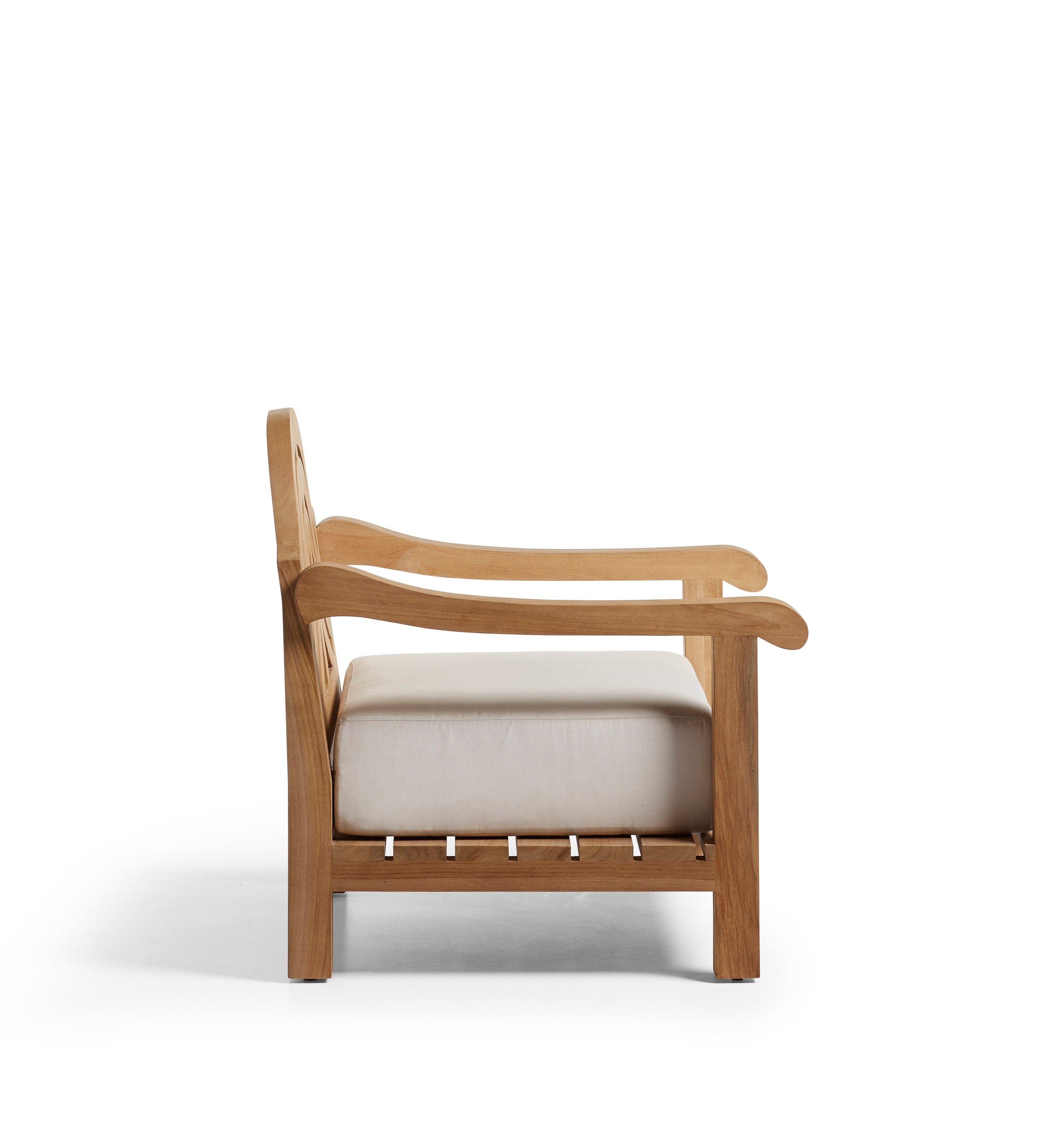 Named after the French word for “arch,” the Cintre Lounge Chair takes its cue from the graceful curves of classical architecture. Crafted from solid natural teak, its smooth, rounded silhouette brings warmth and quiet strength to any setting. Mix and match with any of our luxurious outdoor cushions.