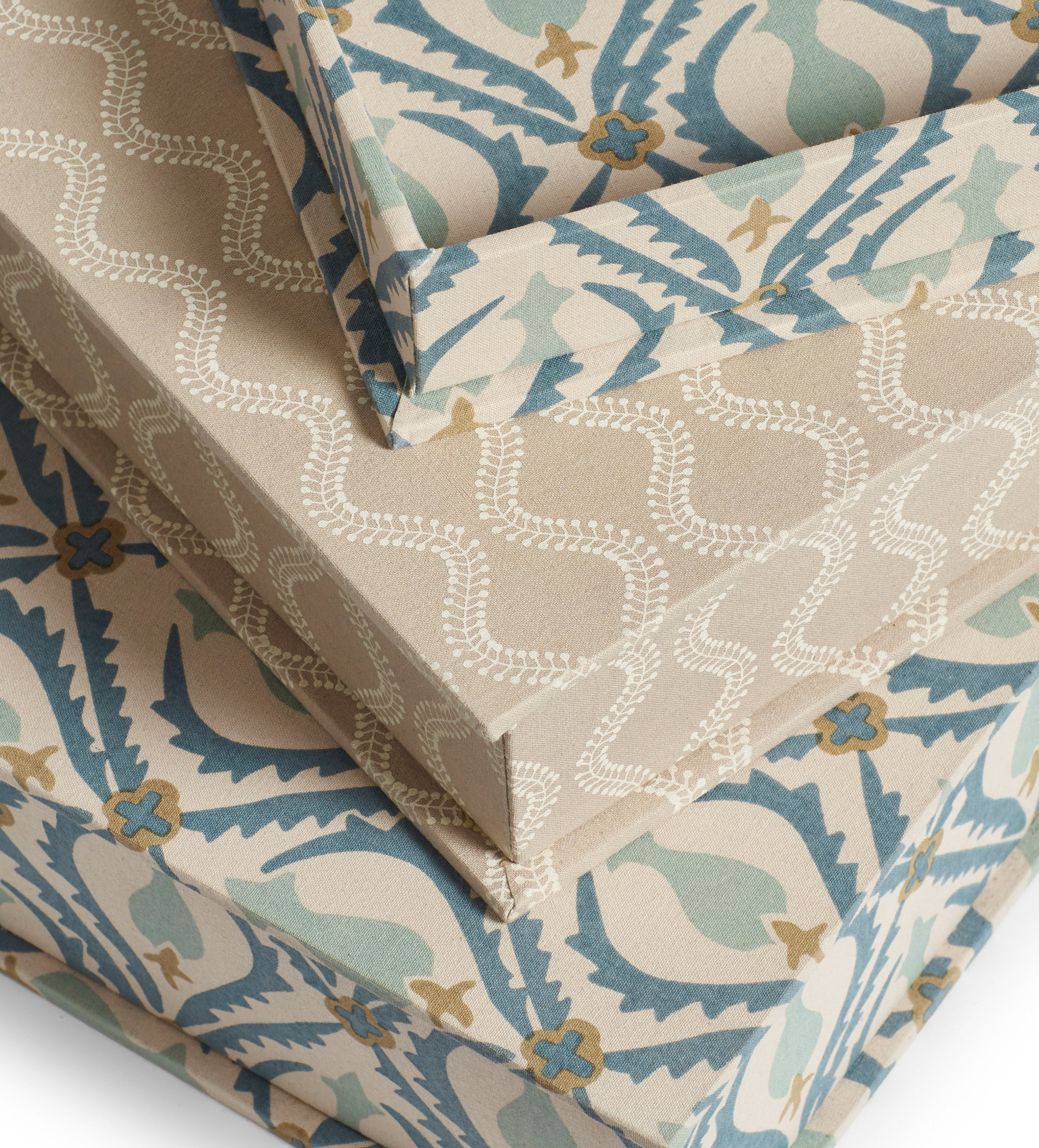 Back after many years by popular demand, these box files bring the Cornelia and Zostera patterns to your home in a practical form, with a hand-applied screen-printed fabric finish and waterproof coating. The Cornelia design features heraldic symbols, while Zostera’s chalk-white tone lends a minimal touch.