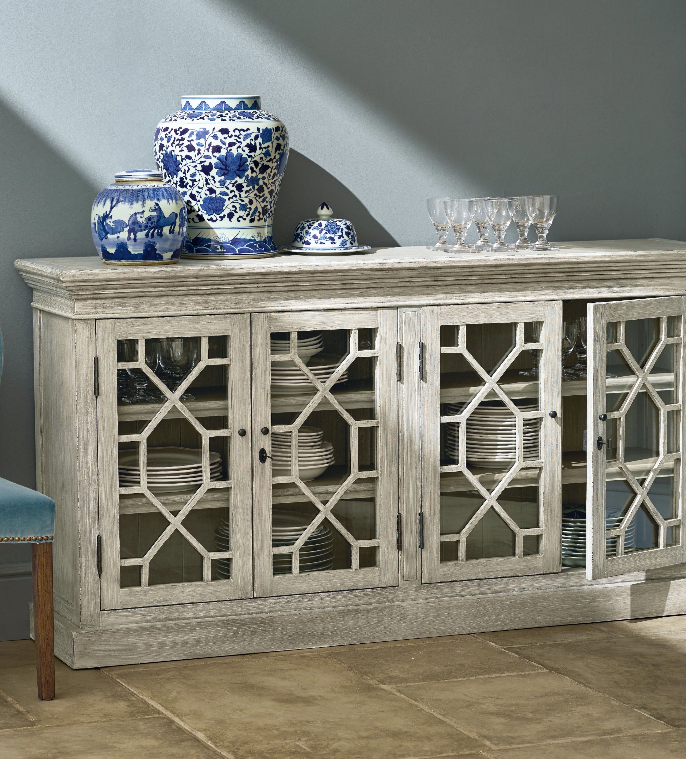 A stylish and useful sideboard featuring four adjustable shelves and glass fronted (lockable) doors, decorated with a geometric pattern. Painted to a dragged, flannel gray finish, our Drummond Sideboard would be the perfect home for all your dining essentials, or for hiding away your collection of board games.