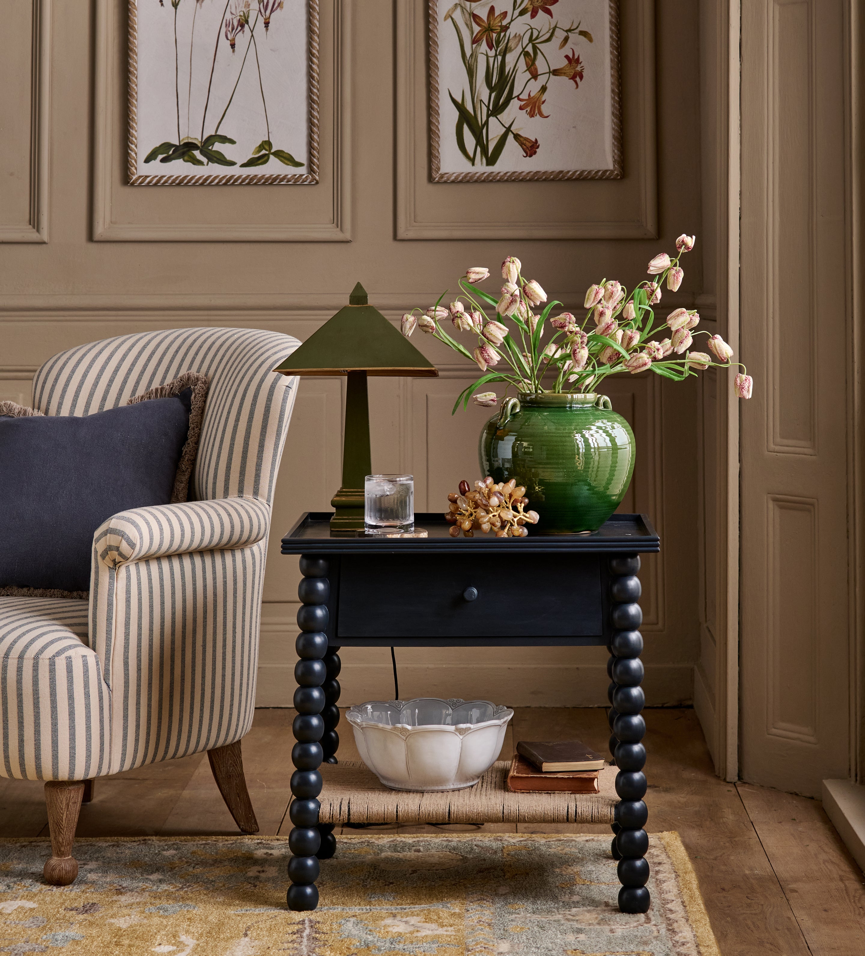 Taking its name from the Latin for ‘curve’, our Flectus Side Table is defined by its gently arched silhouette and elegant petrol finish. Compact yet striking, it features a single drawer, ideal for keeping everyday essentials tucked away, alongside a slim decorative shelf.