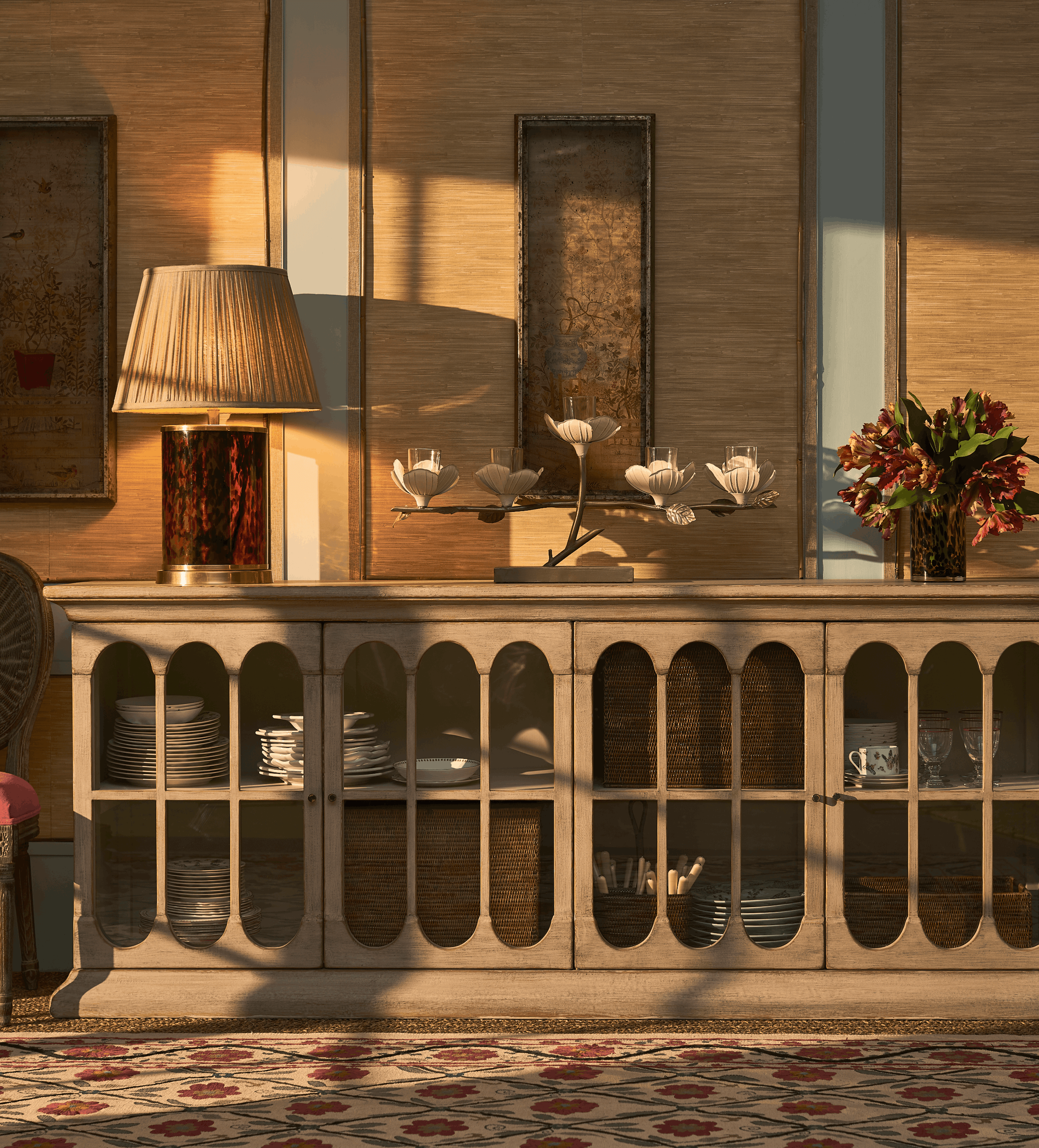Meet Gustaf, the must-have. Taking storage up a gear, this generous, Swedish-Gustavian-inspired sideboard has two interior shelves and two sets of glass-paned doors with copper handles, allowing you to store all kinds of items. There's also plenty of room on the top to display treasured pieces that deserve pride of place in your home.