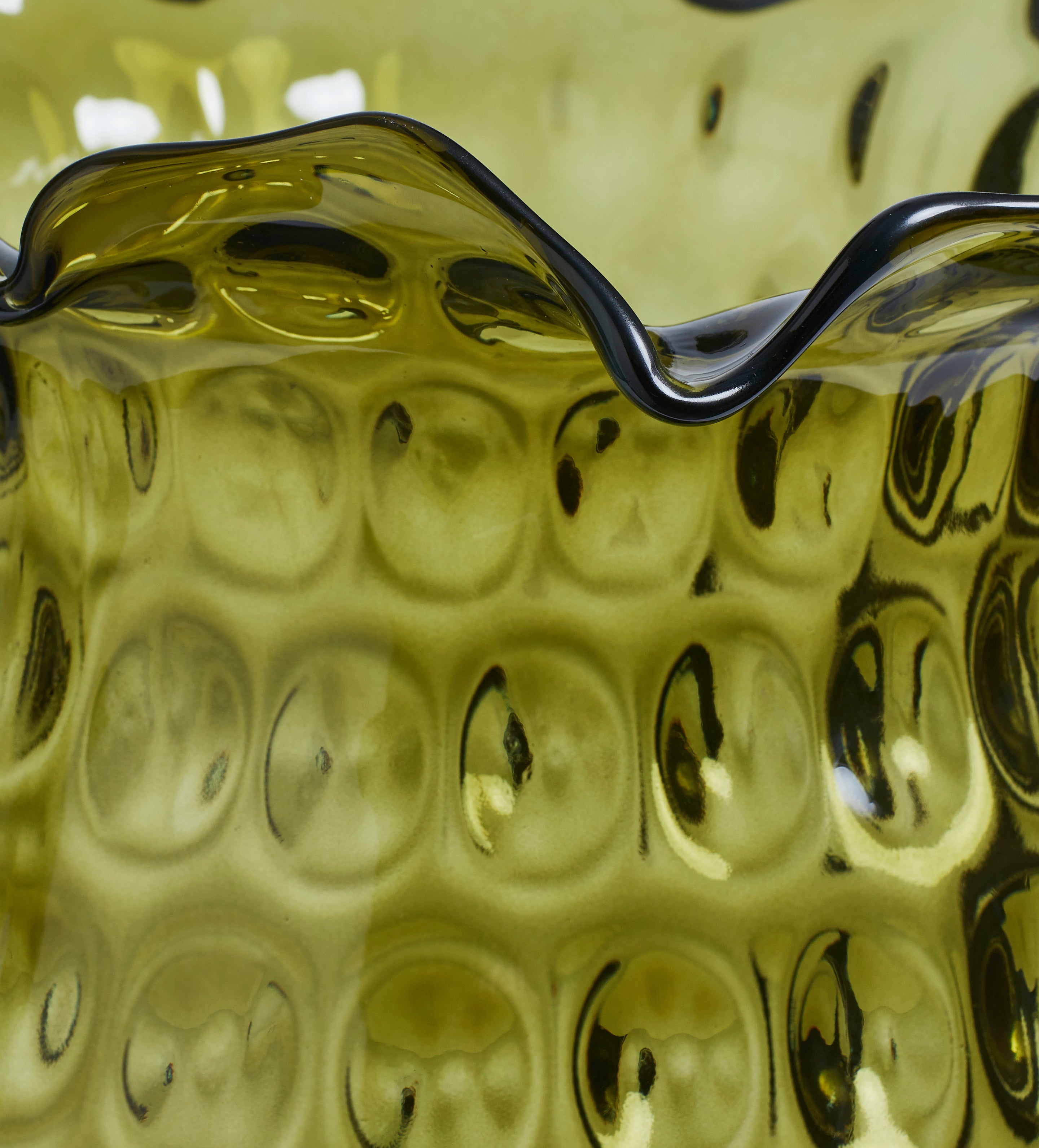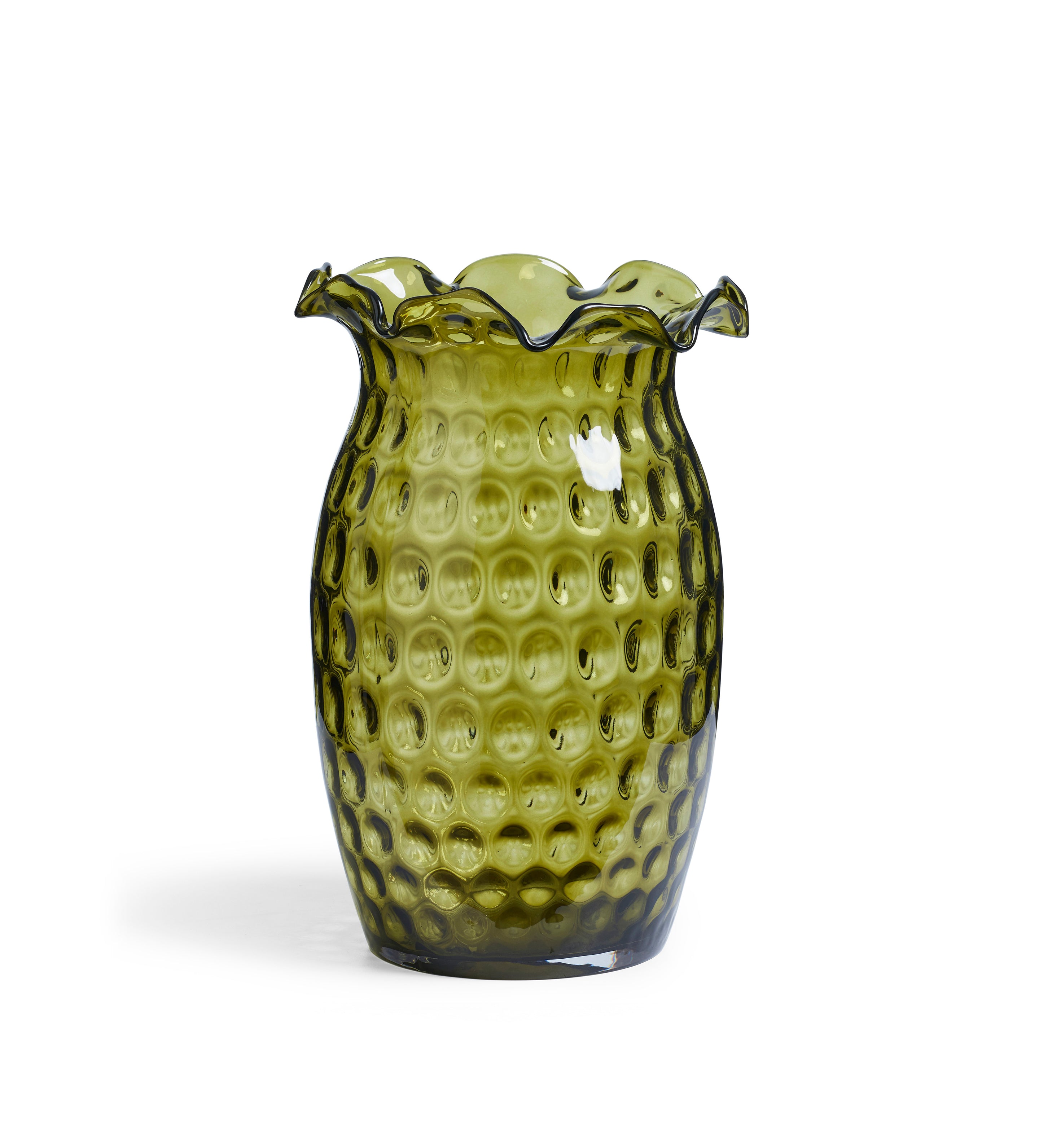 Characterised by its distinctive scalloped edge, the Hakei Vase is mouth-blown from green glass in Poland and features a subtle texture across its surface. Its nostalgic design is inspired by vintage styles.