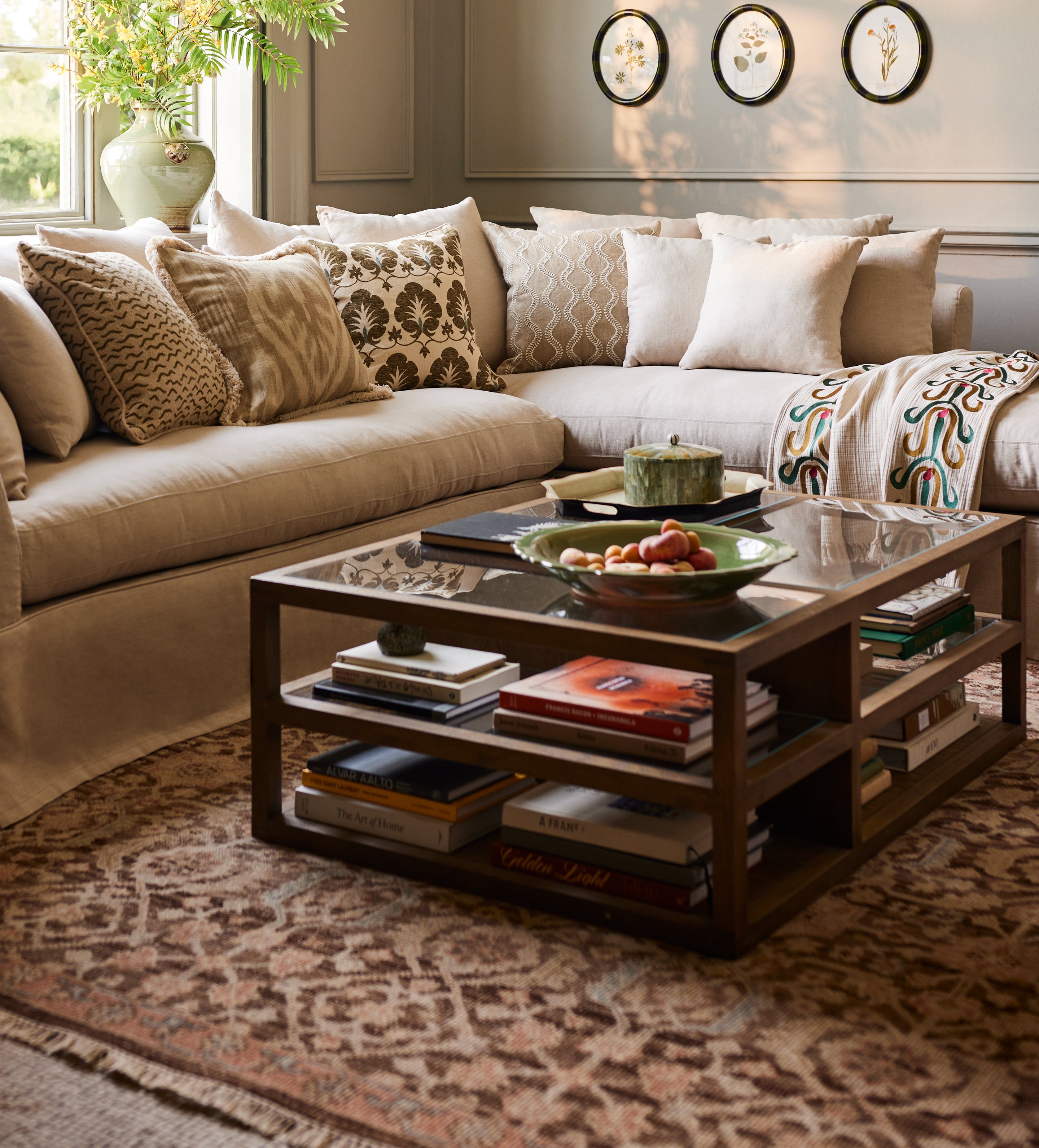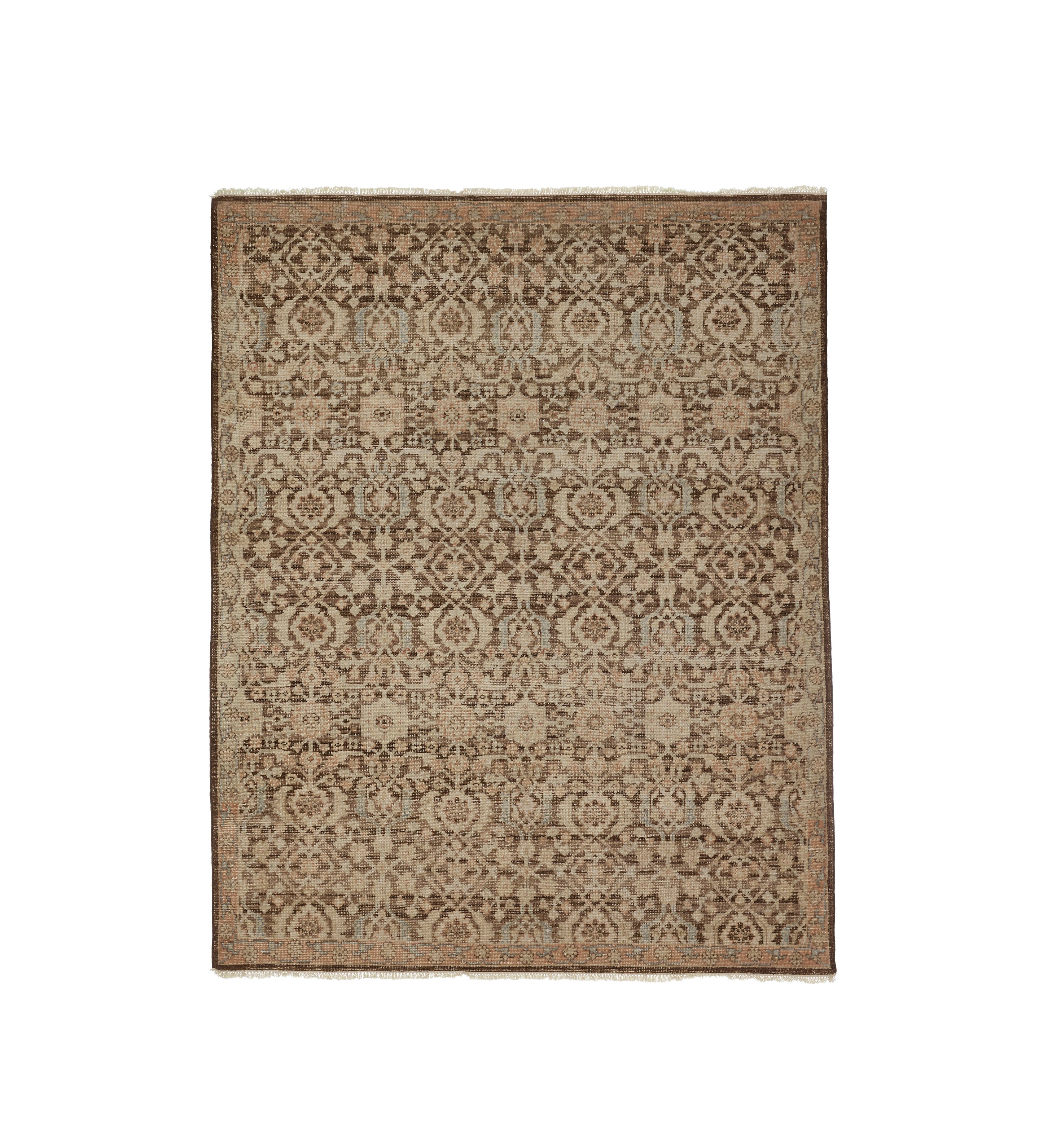 Our Lalima Rug is hand-knotted by skilled artisans from wool. It’s characterised by a repeating floral lattice pattern in a warm-natural colourway inspired by age-old Persian designs. Sure to add colour and texture to any space, it features earthy tones of warm brown, beige, muted peach and blue, while the subtle framed edges add definition without distracting from the design. It’s not just a floor covering, but a statement of heritage, artistry and enduring style.