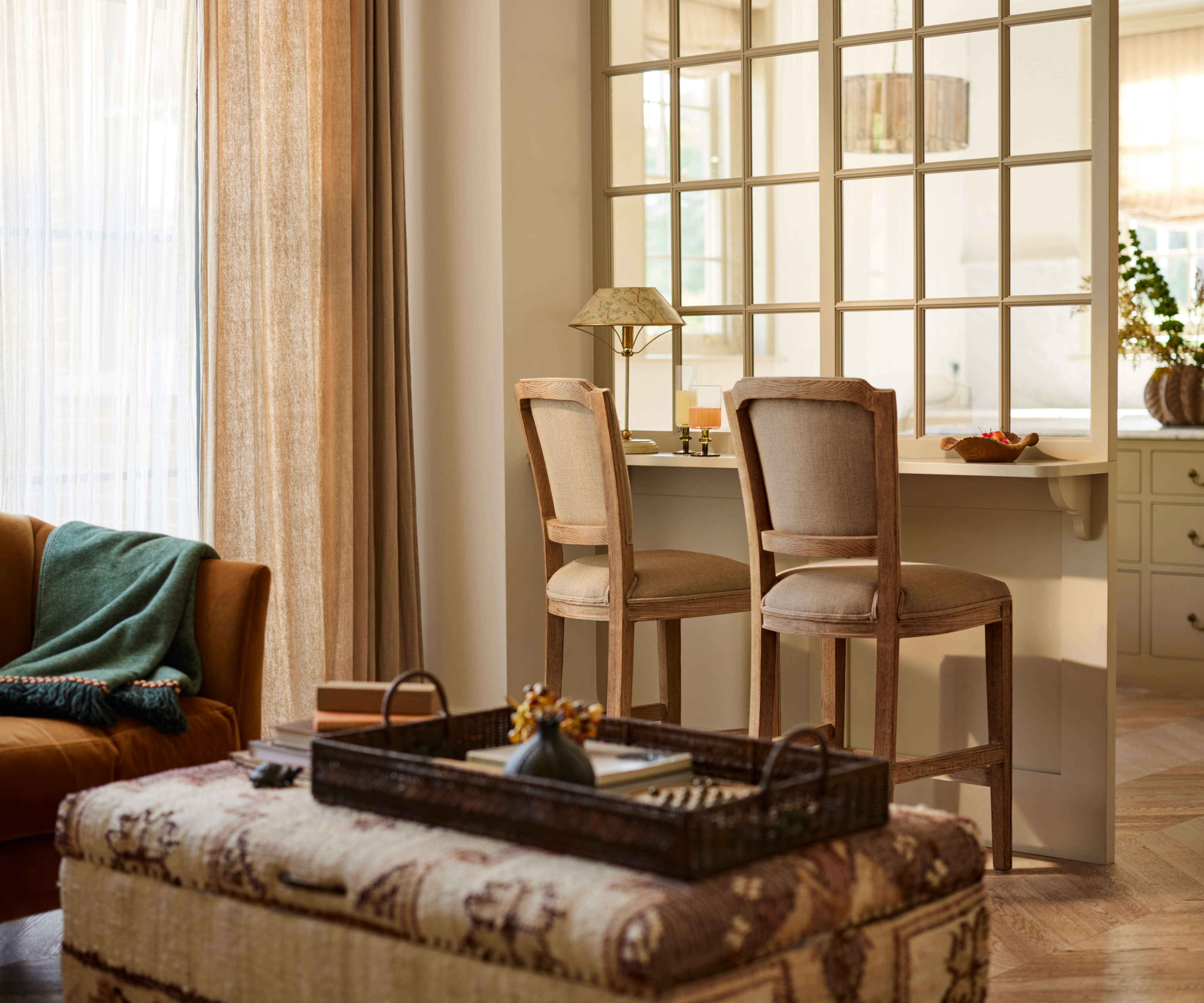 Whether used as a footrest, an extra seat or simply for storage, the Leila Upholstered Ottoman is a welcome addition to your living space. The solid frame, which houses generous storage inside, is beautifully-upholstered in a hand-knotted rug secured in place with brass studs that add a glamorous accent. The chestnut colourway is a soft neutral that works with any scheme.