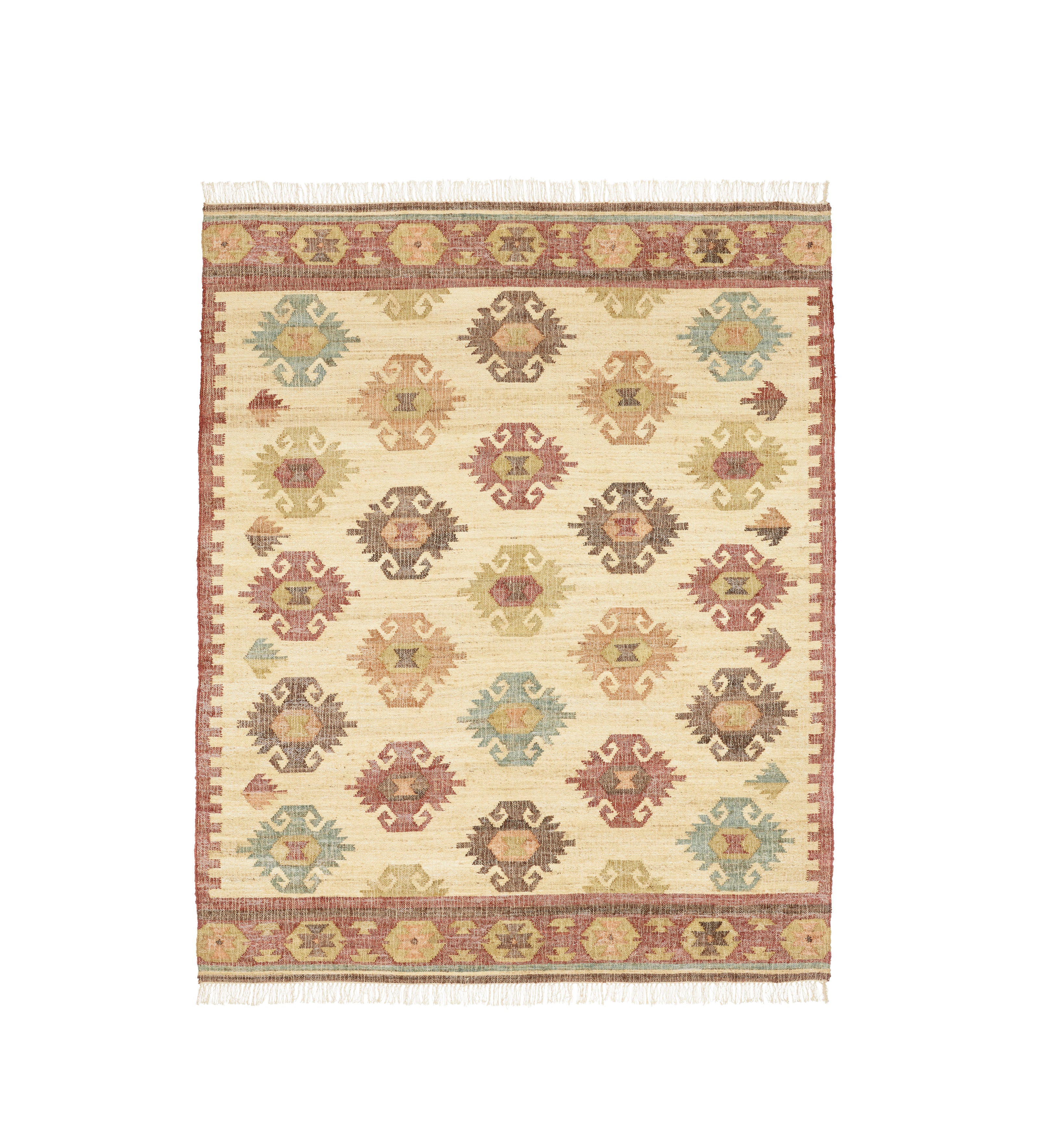 Our medium-sized Nadiya Rug takes inspiration from the eye-catching motifs of traditional Persian rugs, handwoven from jute and cotton. Jute is a particularly hard-wearing material, making this the perfect floor covering for heavily used rooms. The origins of kilim rugs range from Balkan regions through to Northern Africa, which is what makes them complementary to so many design styles. Kilims differ from knotted rugs as they are interwoven from variously coloured wefts (horizontal yarns) and warps (vertical yarns) to create a flatwoven tapestry rug with no pile. It is this distinct weaving technique, in which the weft turns around the warp, that gives the Nadiya its diagonally stepped colourful pattern.