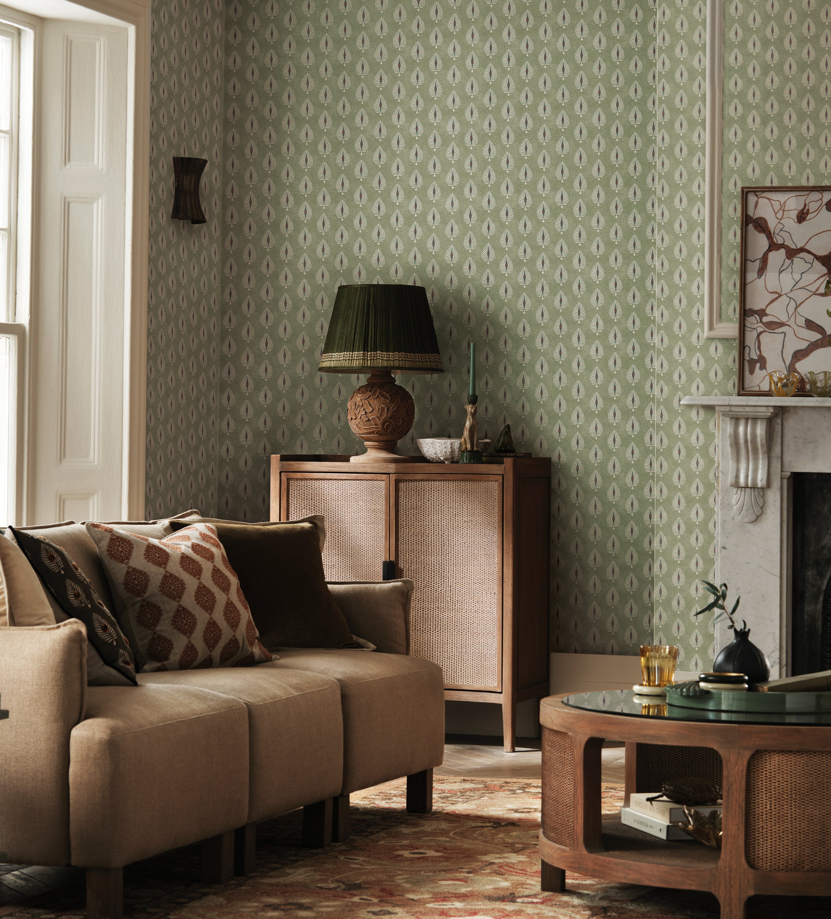 Digitally printed in the UK onto a tactile, matt-finish non-woven paper, it offers both refined appearance and long-lasting durability. Subtle surface texture, tonal variation and visible fibres give the paper a character that echoes traditional hand block-printing techniques. The pattern and base are designed to work in harmony, allowing the design to sit naturally alongside our fabrics and furniture.