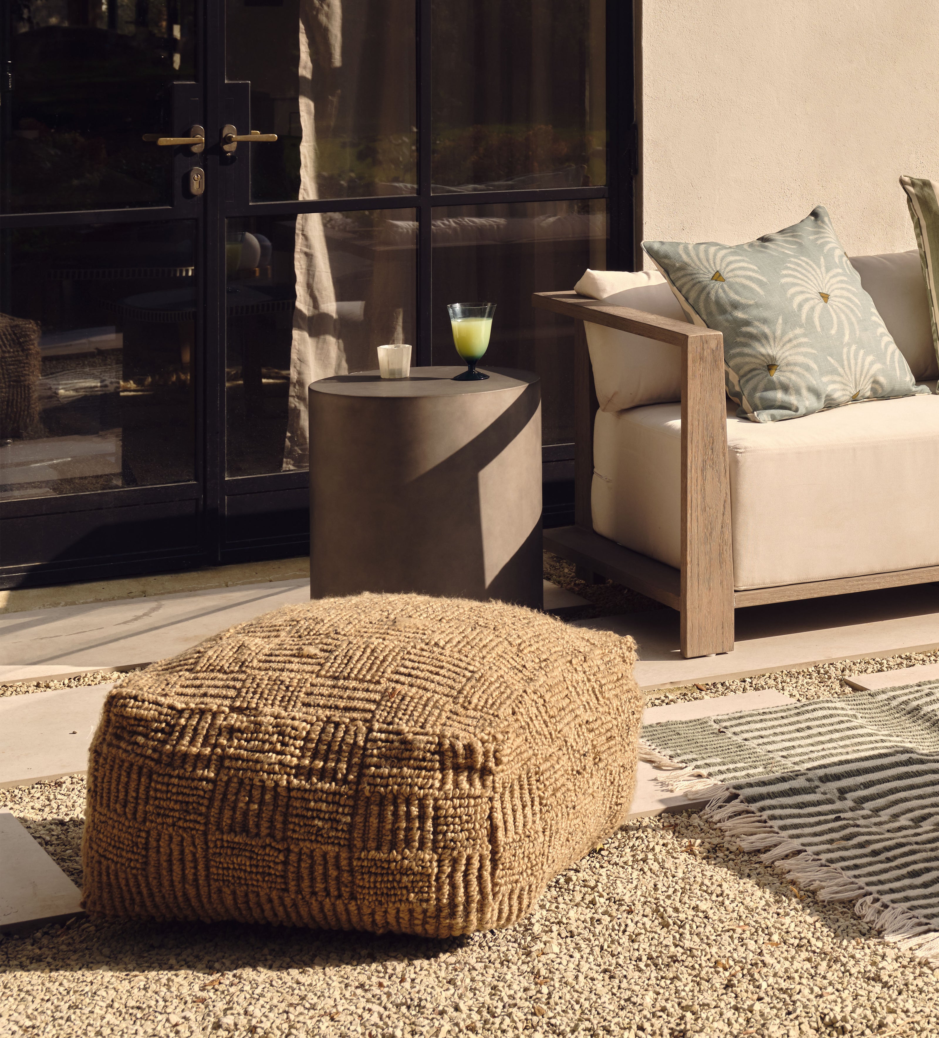 Enjoy the versatile Skala Floor Cushion both inside and outside as the mood takes you. Its grid pattern is handwoven using a material crafted from 100% recycled plastic bottles. This has the double appeal of appearing like the much sought-after sisal material, but having extra weather-resistant qualities that lend it to outdoor use. Though you may think that this would give the floor cushion a rough feel, it is actually incredibly soft. Due to the recycled materials and artisanal process, there will be individual characteristics from piece to piece.