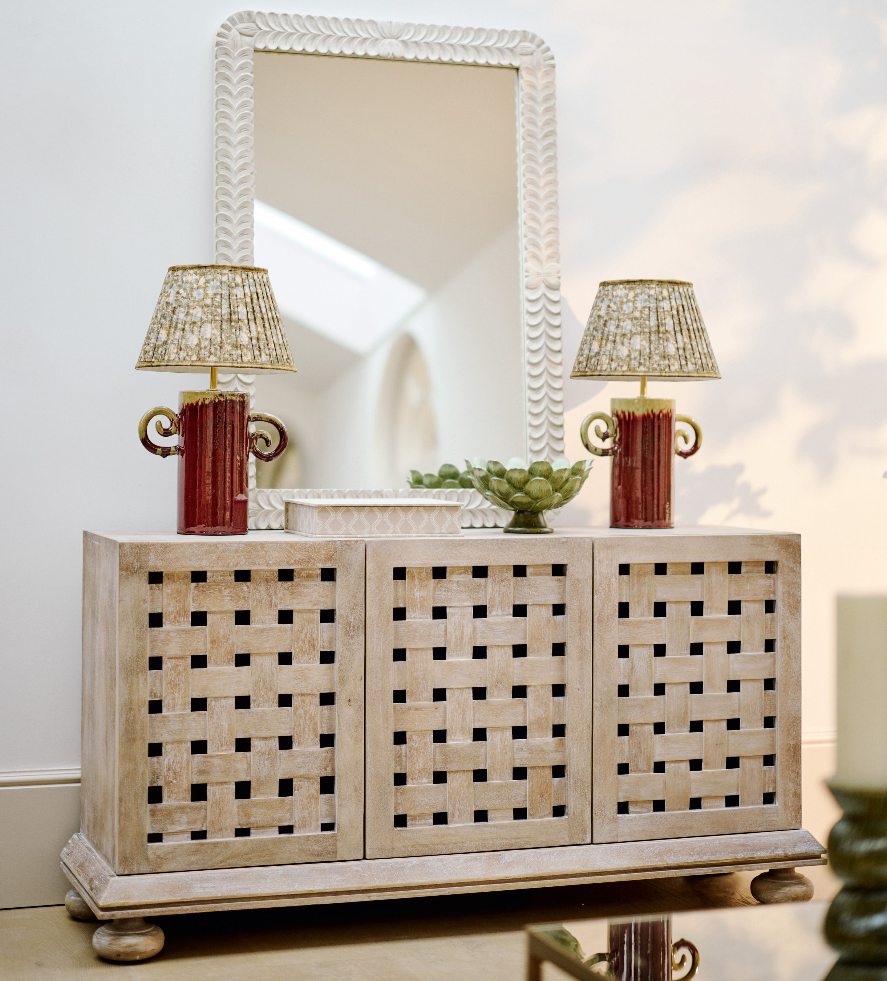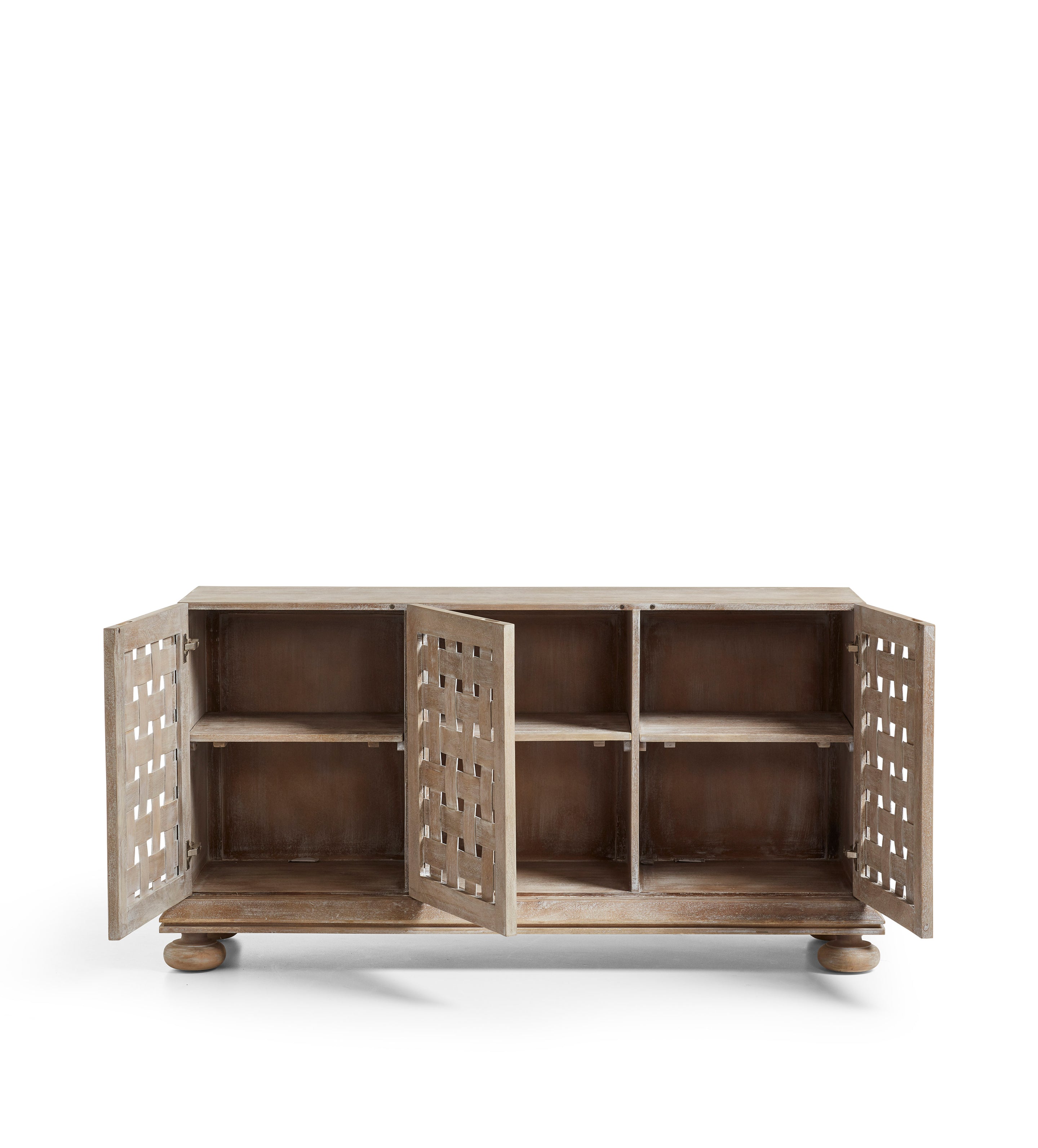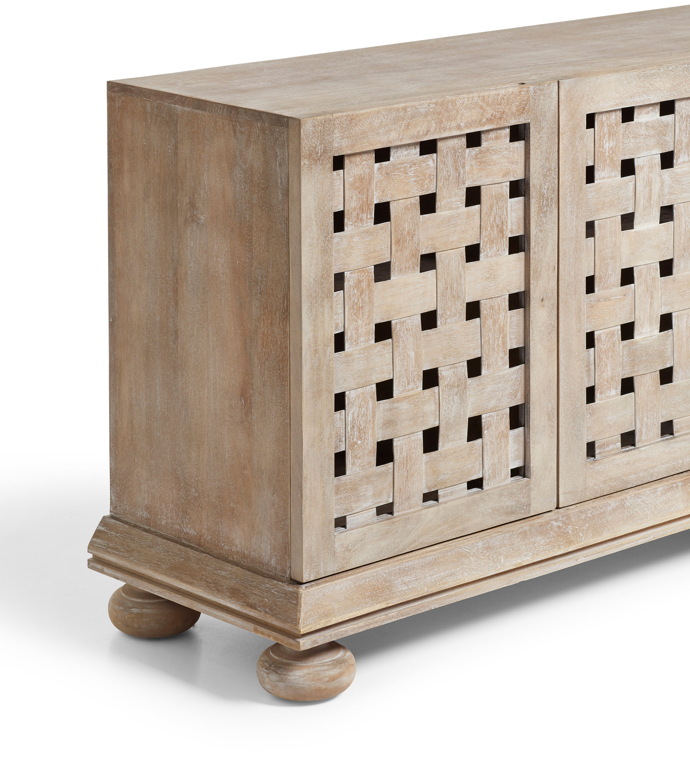 Named for its lattice door fronts, the Tracery Sideboard celebrates thoughtful craftsmanship. Its three doors feature woven, lattice-style fronts that offer a subtle see-through effect, while the light whitewash finish and classic bun feet bring natural elegance to any space.