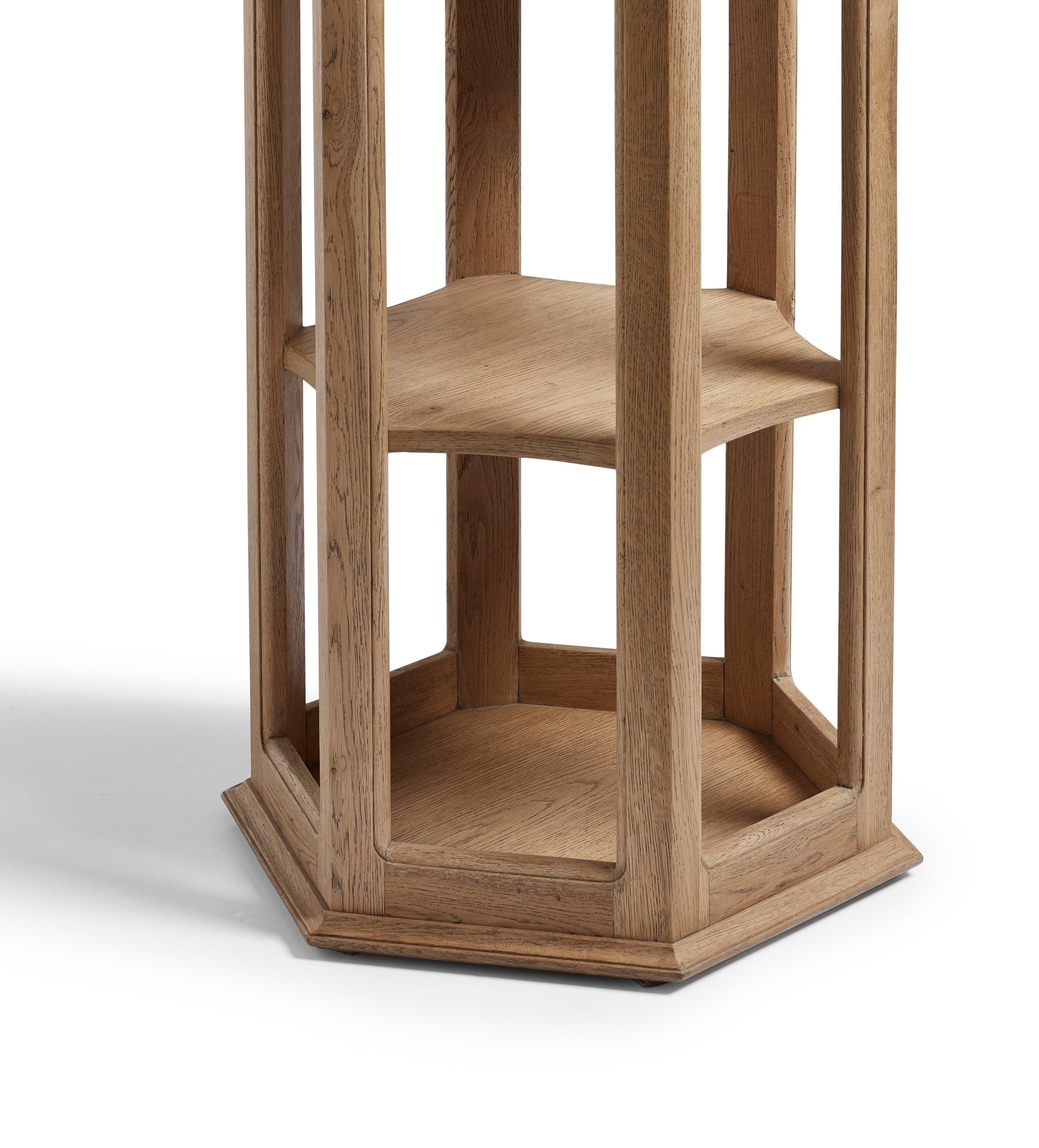 Named after the wedge-shaped stone used to construct an arch, the Voussoir shelf combines architectural inspiration with practical design. Its hexagon-tiered structure creates a striking visual pattern, allowing you to display books, plants, or decorative objects. Crafted from weathered oak, the frame offers both timeless beauty and exceptional durability.