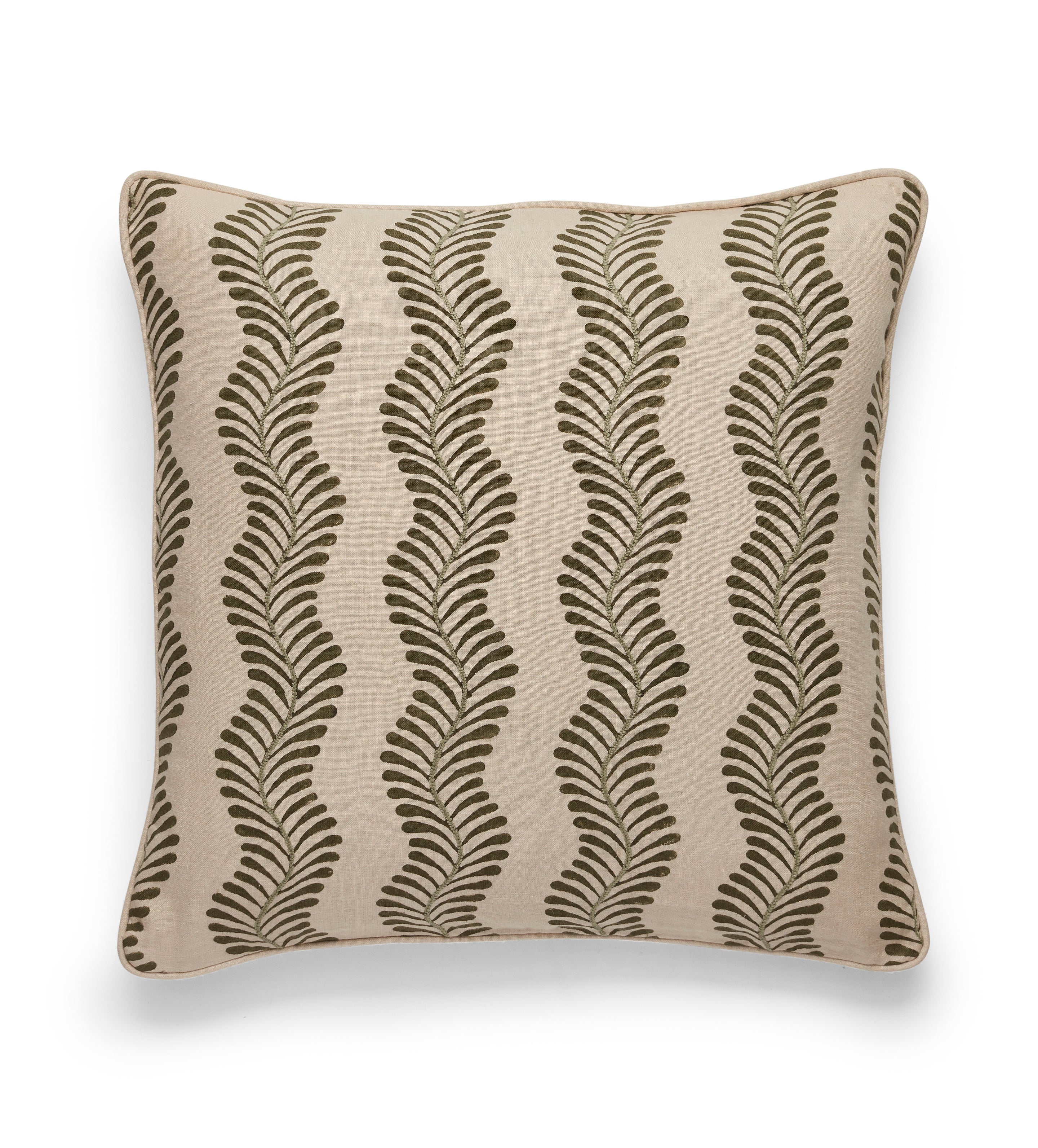Enhance your home with the Woodchester Vine Cushion in spruce. Hand block-printed vine designs on a Linen Lyocell base are finished with delicate embroidery, adding subtle texture and charm. Ideal for bedrooms, living rooms or garden rooms.