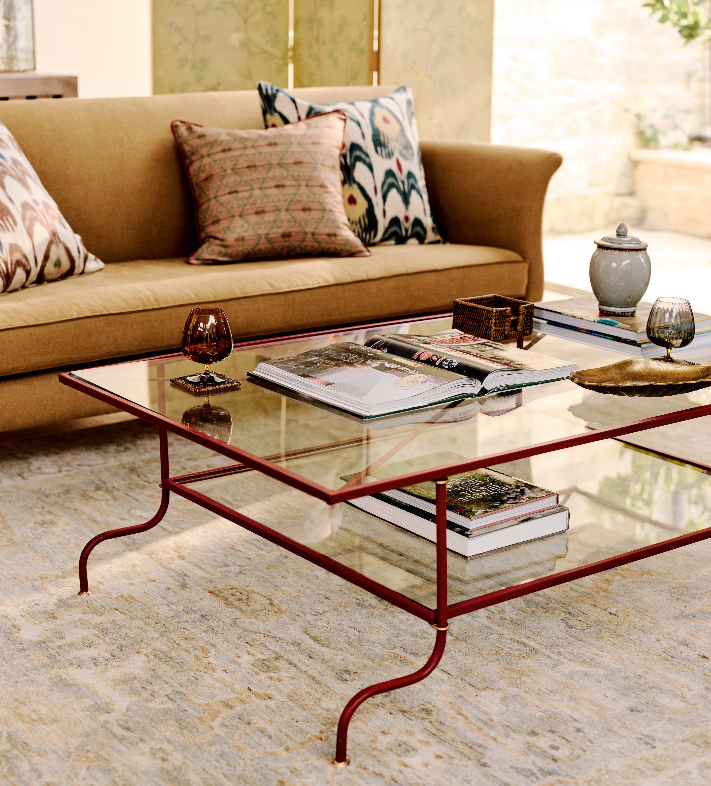Taking its name from the flower celebrated in Ming Dynasty design, the Yulan Coffee Table brings a classy, timeless touch to your home. Its robust solid metal bar frame supports two shelves, offering ample display space, while the painted red finish and gold detailing add a striking, elegant contrast.