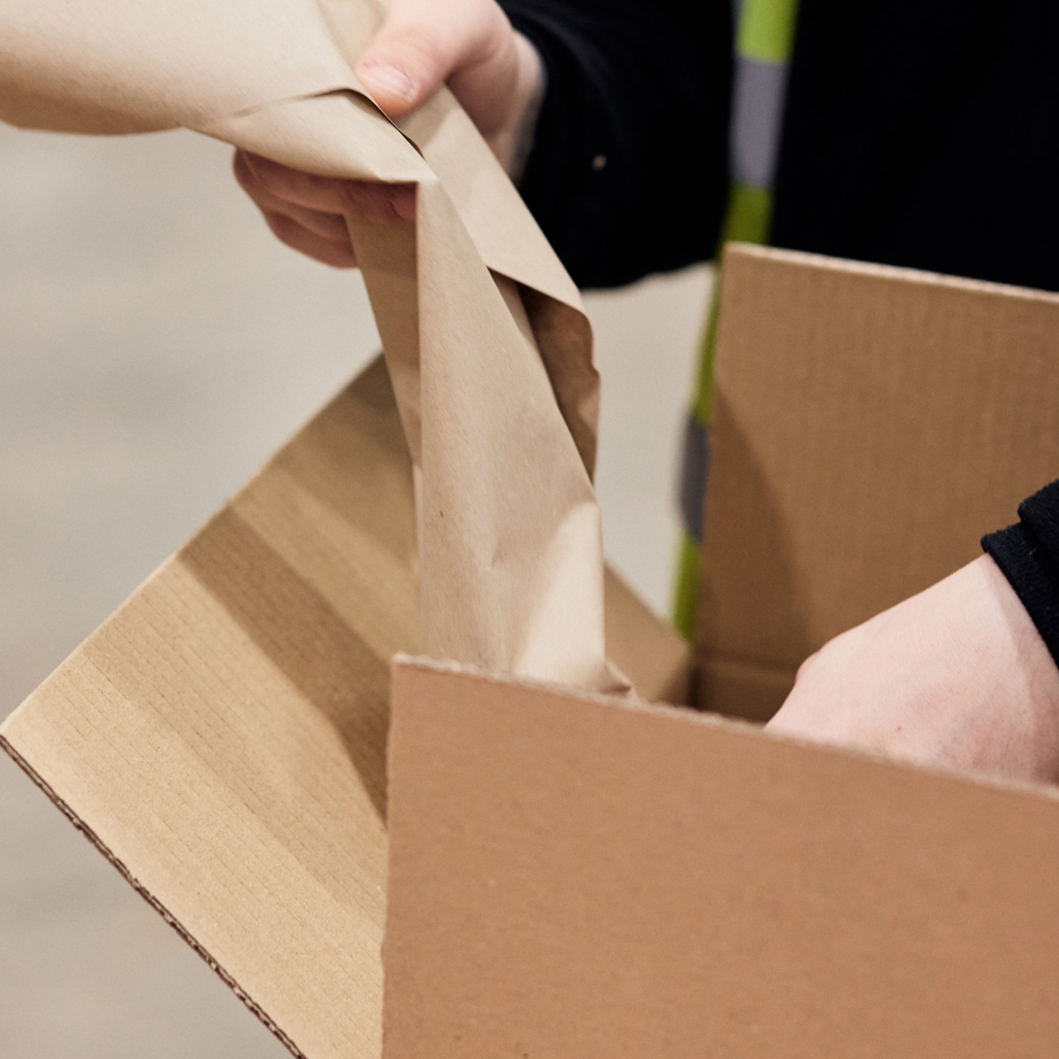 Our retail bags are made from 100% paper that can be recycled, while we reuse our cardboard boxes in-store and flat-packed boxes in our Warehouse.