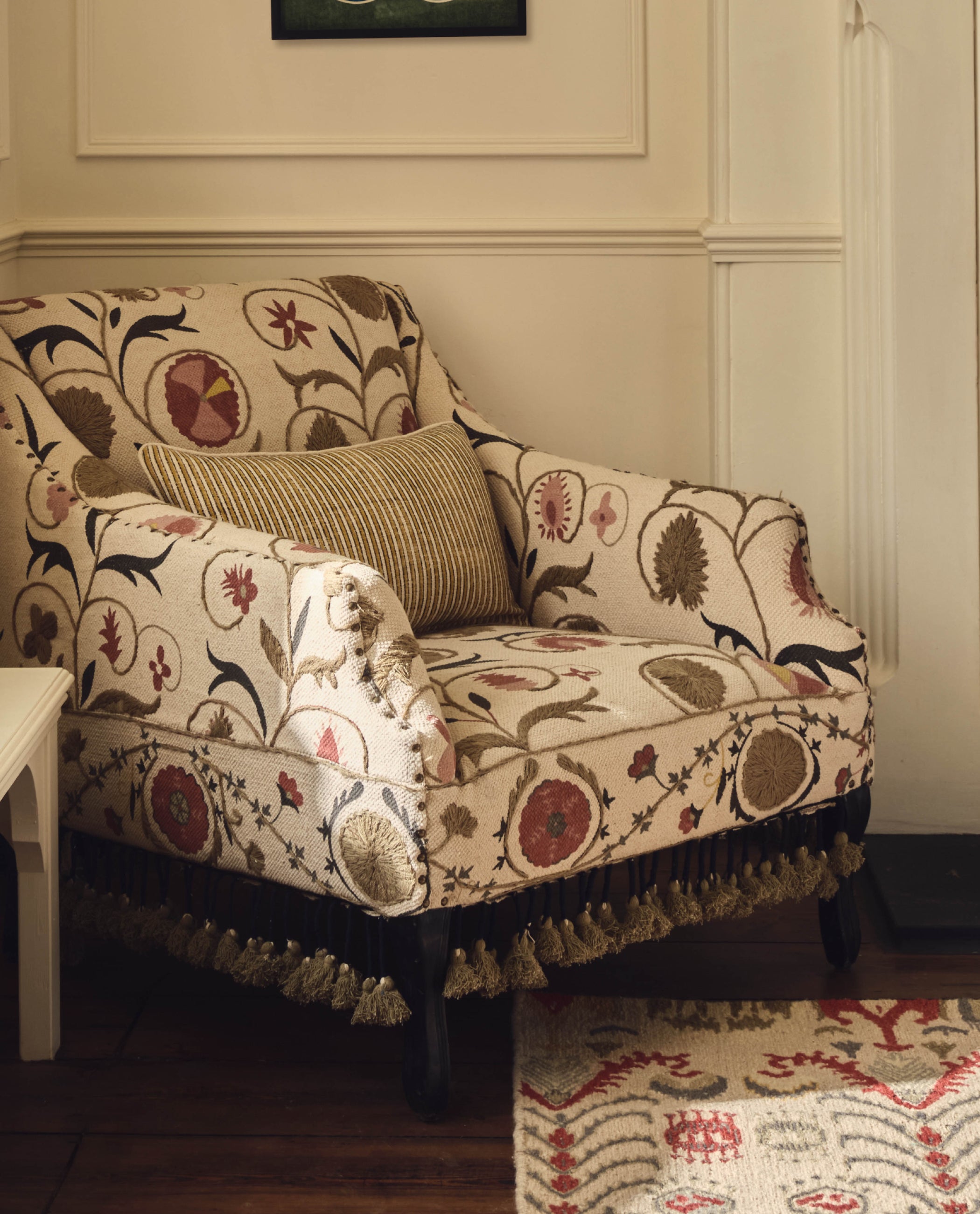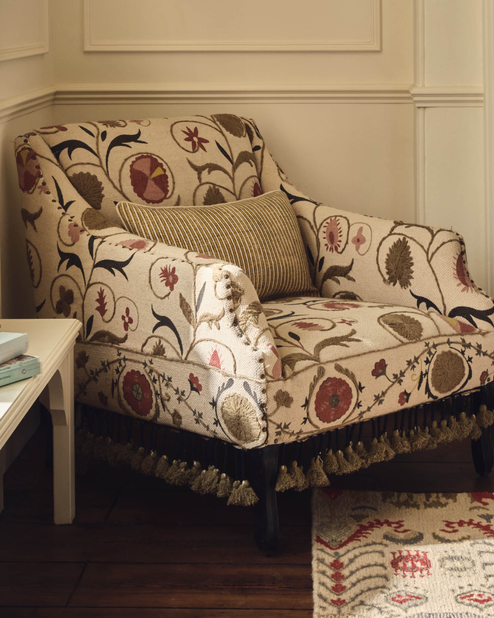 If you’d rather incorporate a floral print using one big piece, then may we suggest upholstery as the ultimate in statement style? A floral armchair or sofa, such as our Tarma Range in our much-loved Sheki pattern, or the more rustic Pomona Ottoman, for example, will instantly draw the eye and become a focal feature in a sitting room, bedroom or study. If you’re concerned an upholstered design will look too classic in a floral, the answer is to simply look for more contemporary detailing or silhouettes to temper the traditionality – bright colours, clean lines and embellishments, such as studs or embroidery, will naturally feel more modern than a classic printed cotton.
