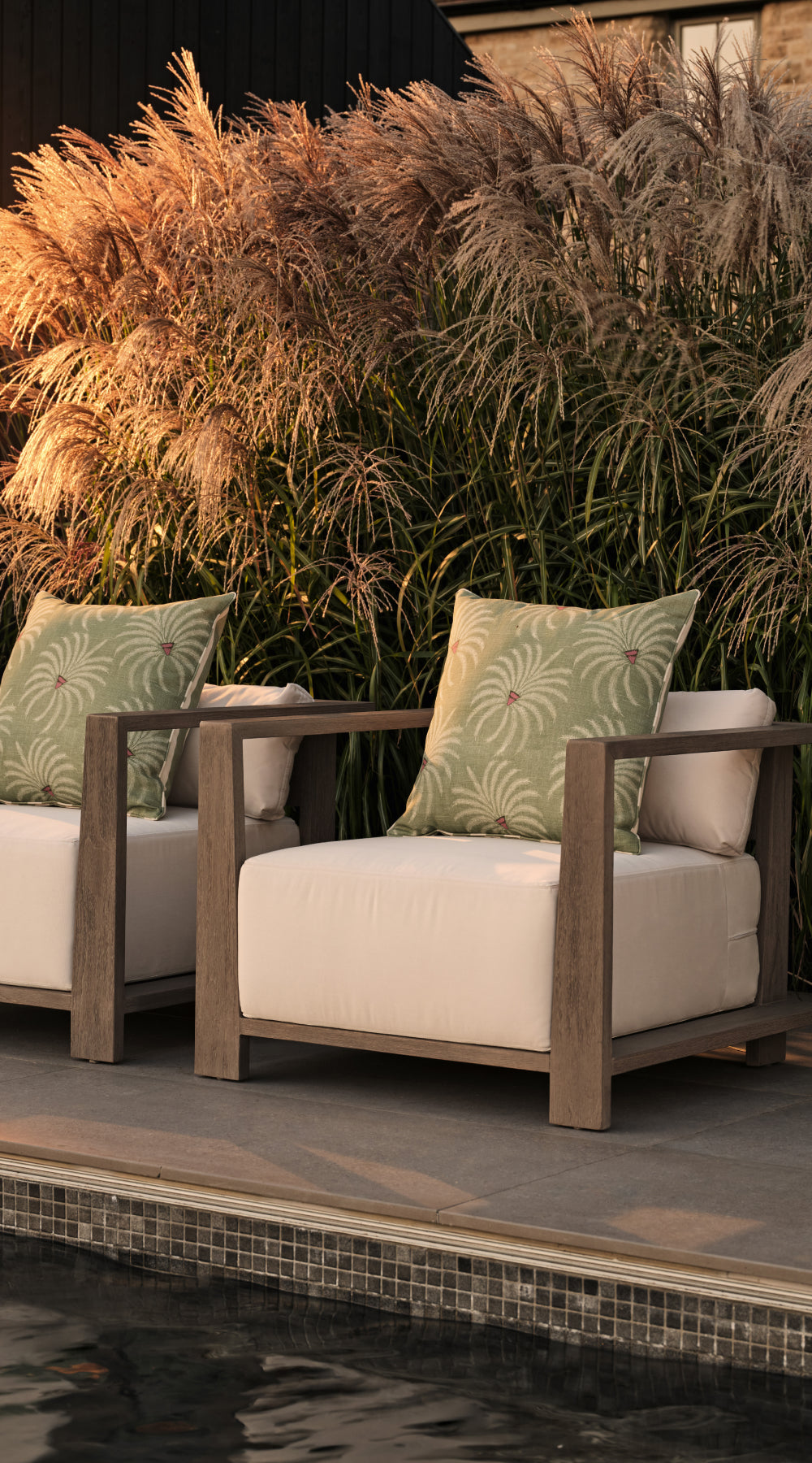 Create a relaxing atmosphere inside and outside your home with a tonal colour palette, geometric pattern and thoughtful furniture choices.