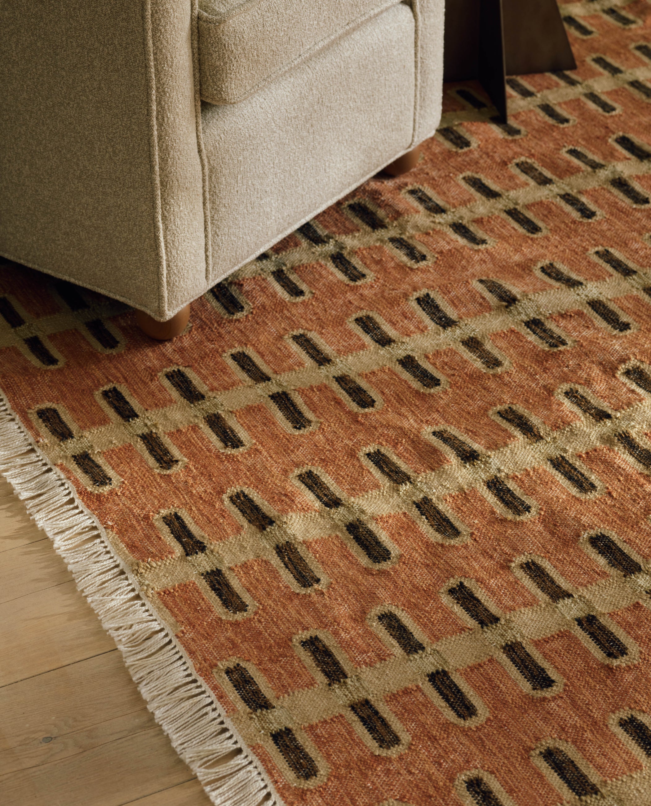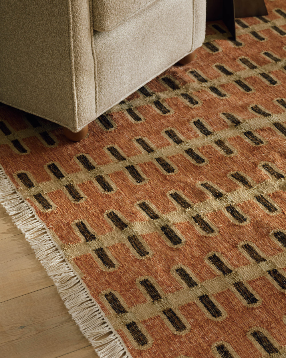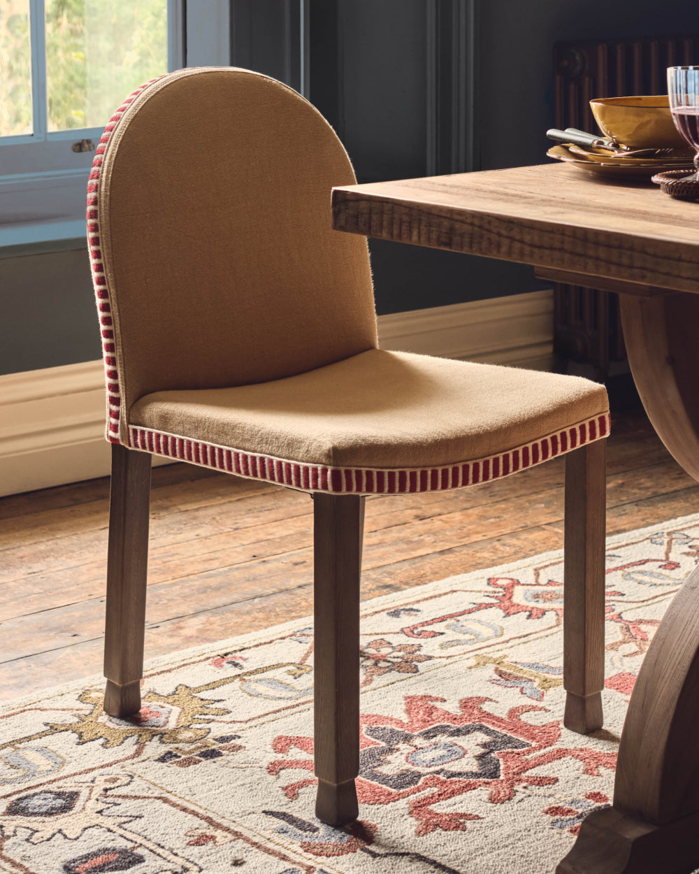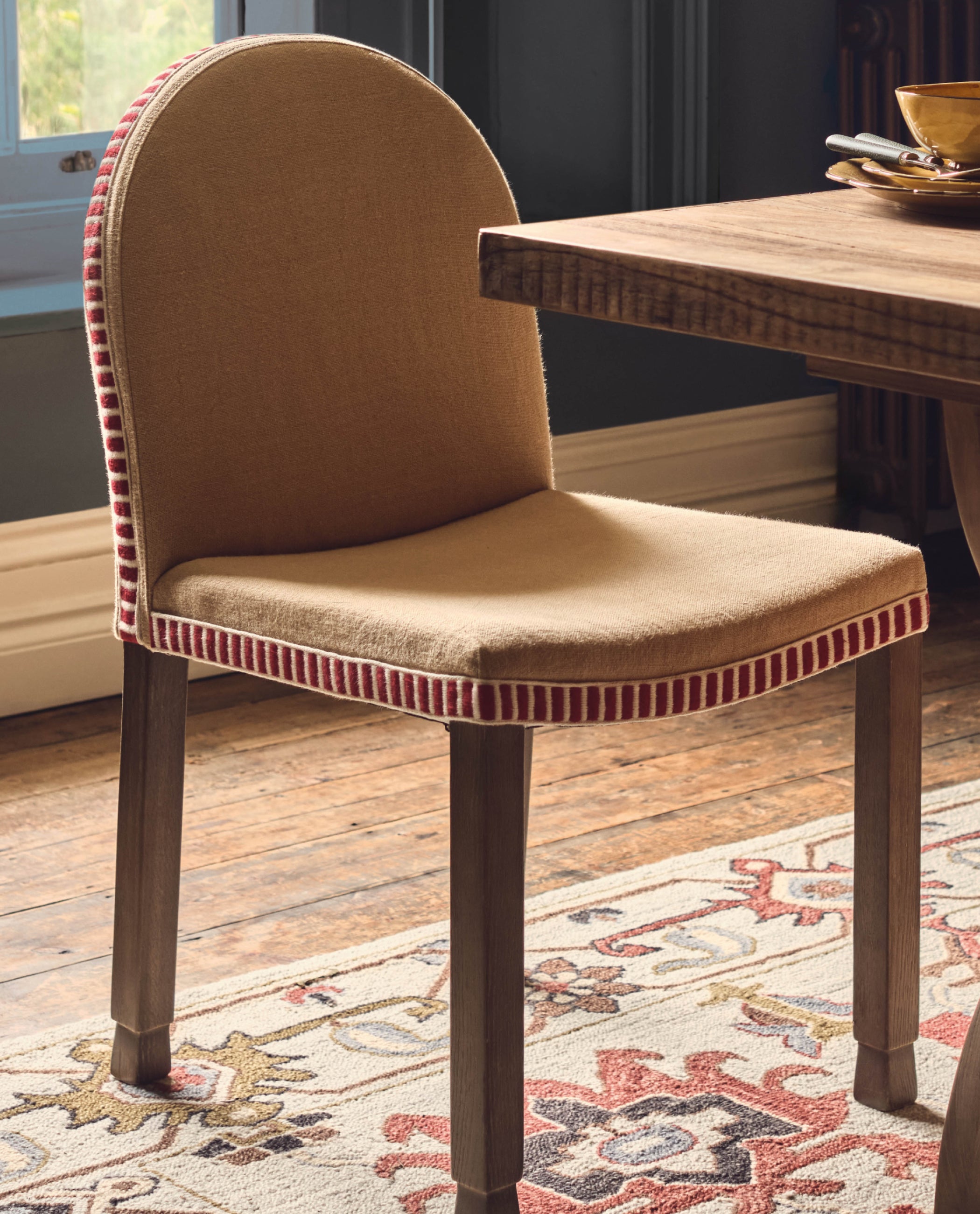 We have a real smorgasbord of trims for you to choose from this season, yet you may notice a deliberate focus in our colour palette… Many of our pieces dip into the camel colour trend, a hue that has previously featured on our cushions but only this season debuted on our upholstery. This timeless shade is boosted with considered red trims that elevate the designs from background pieces to stars of the show. The contrasting colours create balanced proportions, and as our designer Jessica McCauley says, the combination “adds a layer of interest and unique design to some classic shapes.” Take the Russell Ottoman for example, simple in its circular form atop a wooden plinth, but with an additional red and white striped ikat trim that runs around its edge. Not only does the trim catch the eye, it also reveals the opening for hidden storage inside. This trim is matched on our Weston Range– including a dining chair and a bar stool– so that you can dot the style around a room for a sense of cohesion, if you so wish. Similarly, our revitalised Camaret Range now features upholstery in our beloved Serigraph print, contrasted with a pretty red leaf trim that tempers the bold repeating pattern with something softer. This trim is also mirrored on our updated Ellary Armchair and Vaquero Linen Stool. Swaying from the colour trend is our Elowen Coolie Lampshade which features a thin black and natural chevron trim which elevates it to new heights, and the Zelva Throw whose cosy grey wool is bordered by warming orange velvet finished with chain-stitch embroidery.